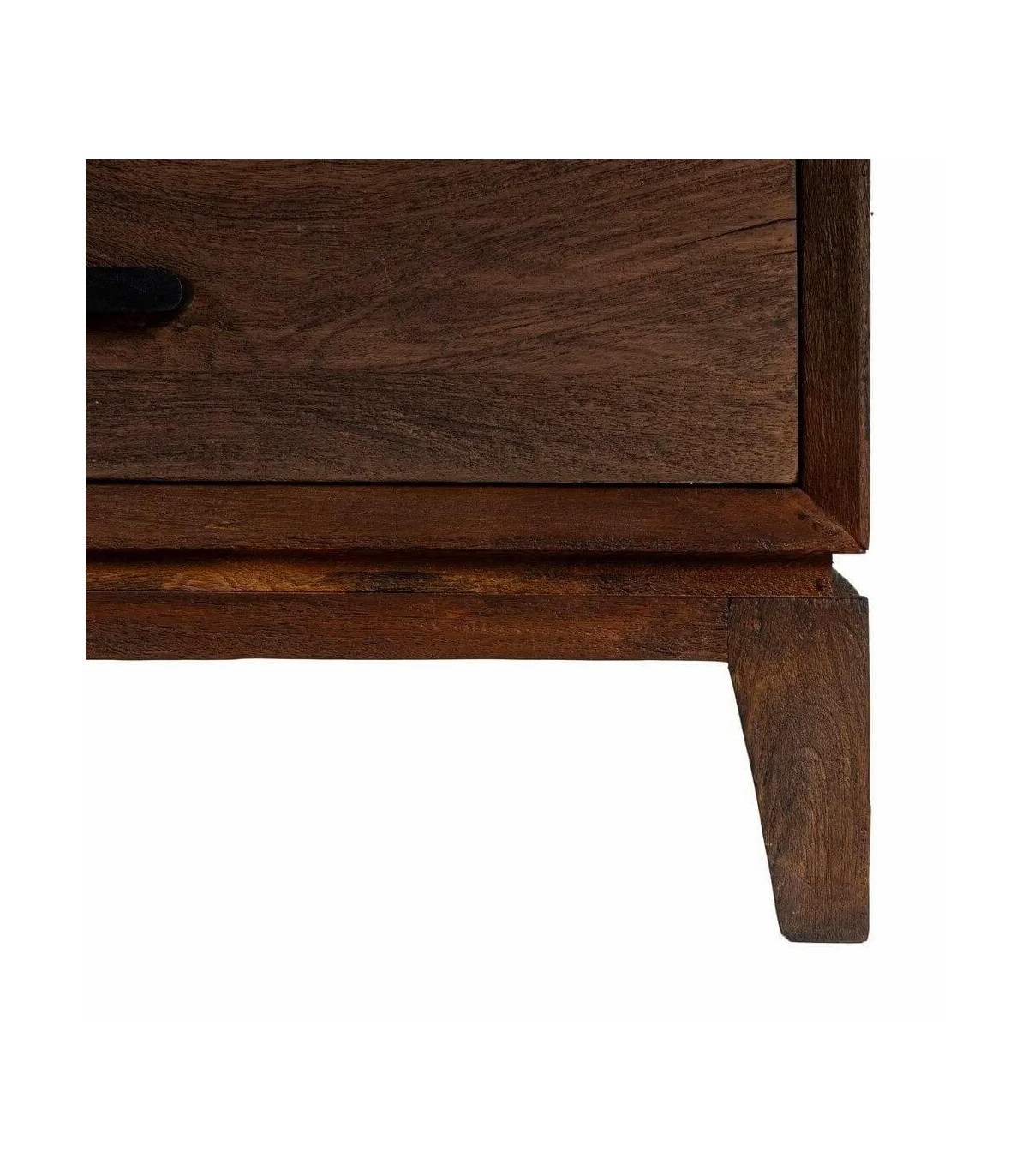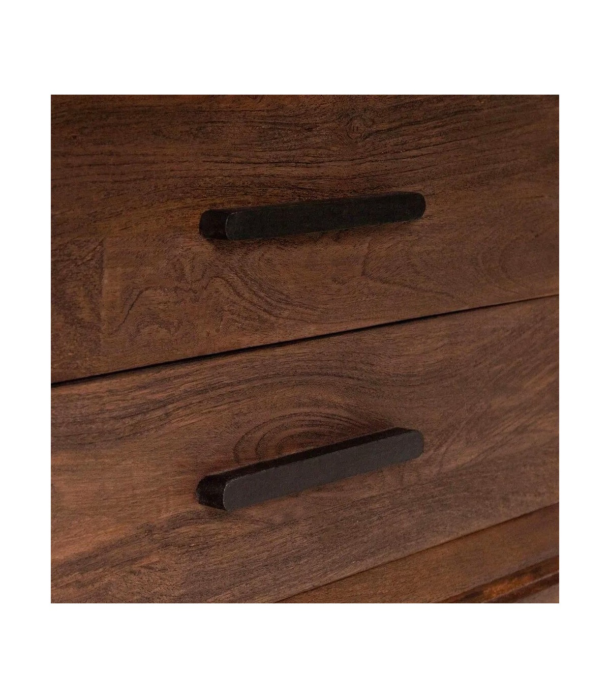 El acabado en tono nogal oscuro resalta la veta natural y los detalles en negro añaden contraste elegante. Las patas altas estilizan el conjunto, aportando ligereza visual sin perder robustez. Ideal para dormitorios, pasillos o comedores con personalidad clásica. Una pieza versátil y atemporal con aire colonial renovado.