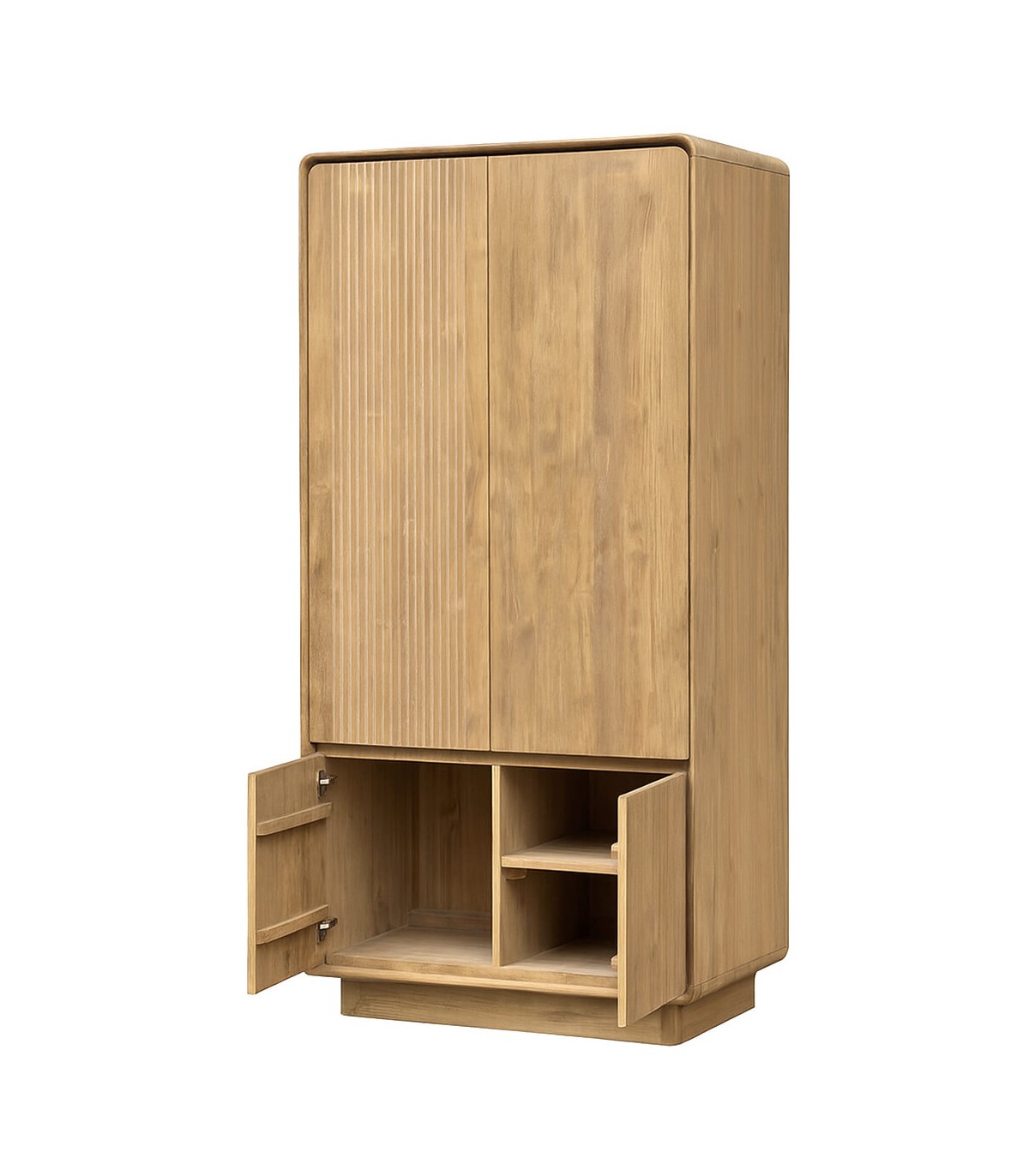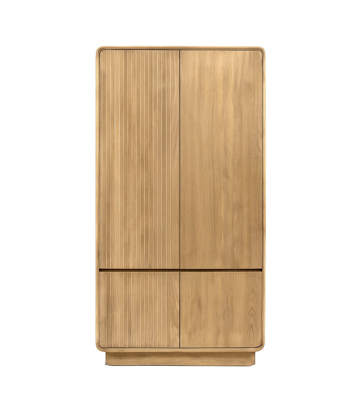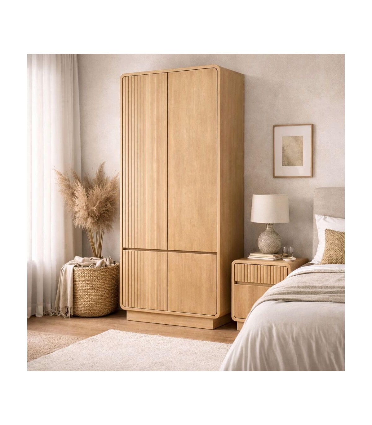 El diseño combina superficies lisas con frentes acanalados que enriquecen el conjunto sin recargarlo. Cada pieza refleja el valor de la fabricación artesanal y el cuidado en los acabados. Una elección pensada para dormitorios que buscan funcionalidad, coherencia estética y materiales nobles.