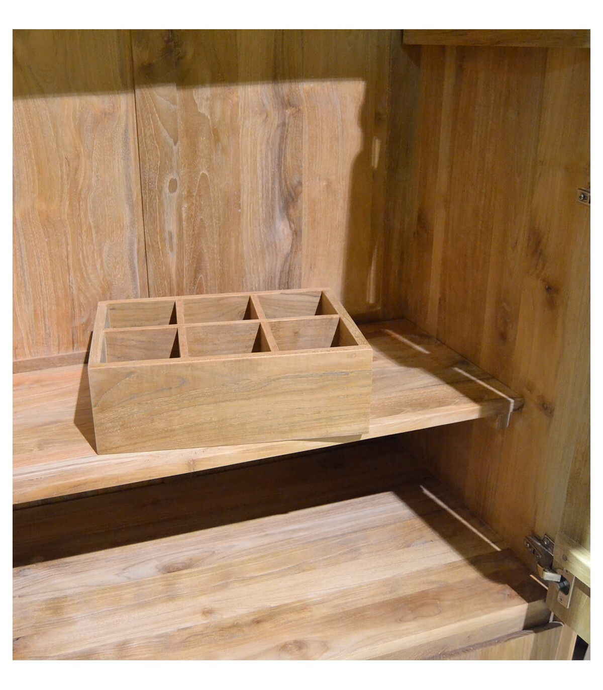Armario ropero de estilo boho concebido para aportar orden y calidez al dormitorio con una estética natural y equilibrada. Su presencia sólida y vertical destaca por la belleza auténtica de la madera maciza de teca, que aporta carácter y sensación de calidad al espacio.