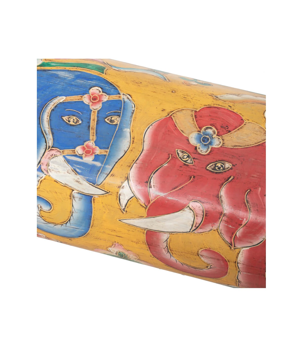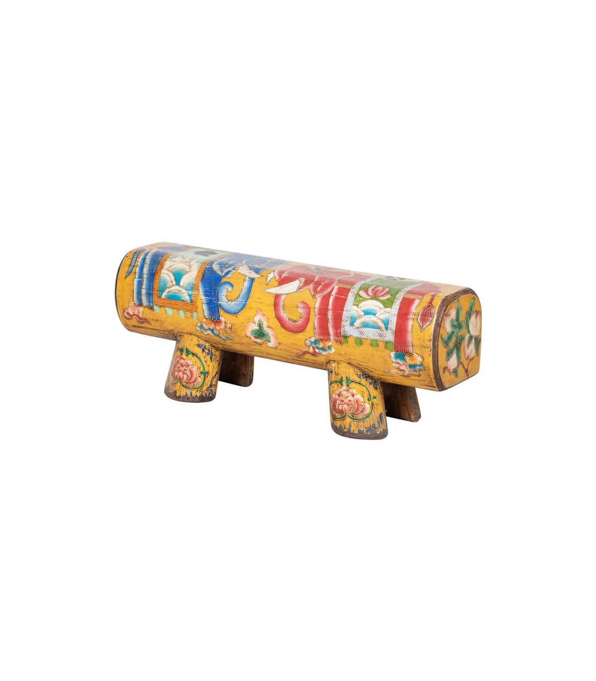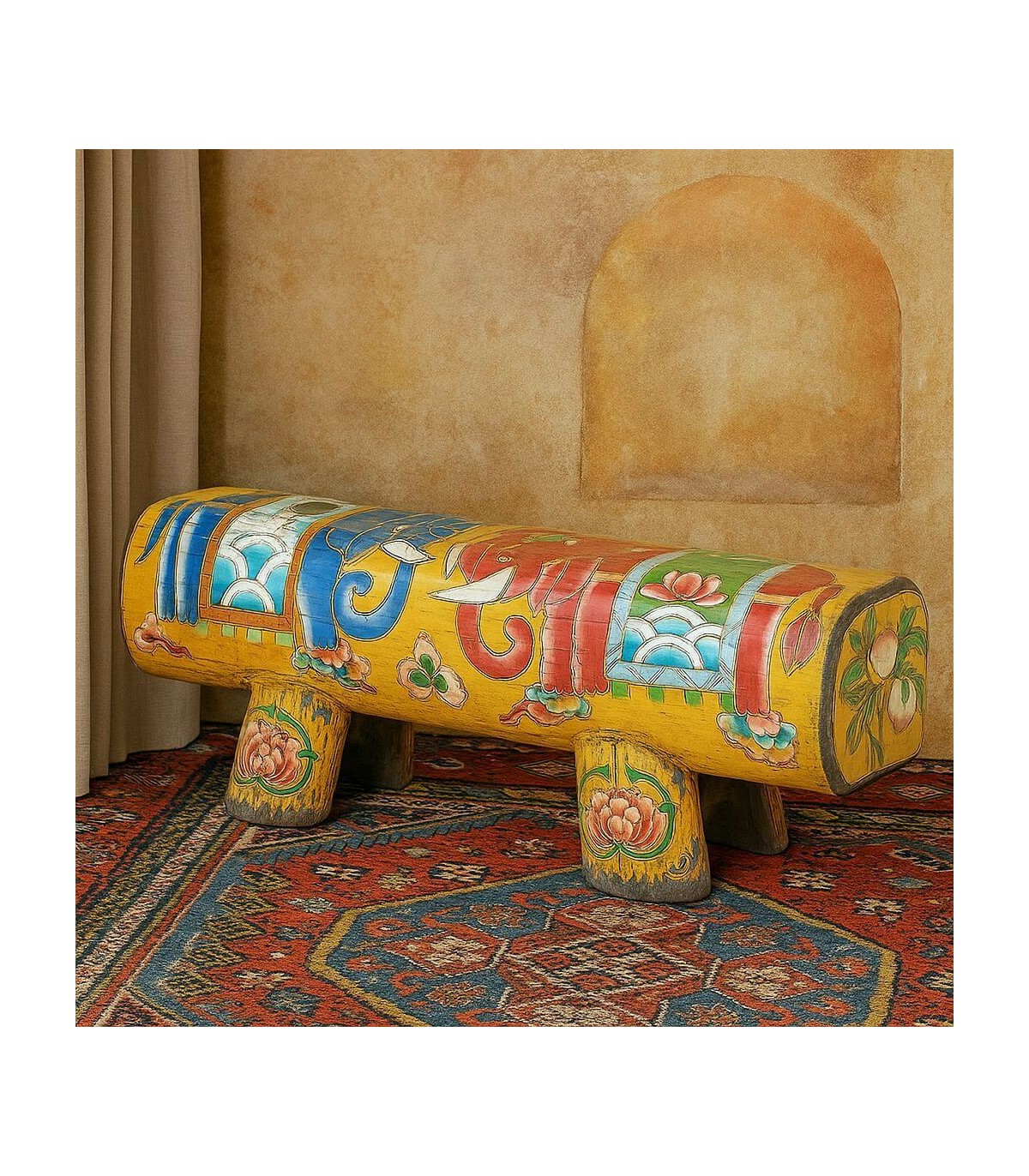 Este banco oriental pintado a mano es una joya decorativa que aporta color, exotismo y carácter artesanal a cualquier estancia. Fabricado en madera maciza de álamo, su forma cilíndrica y patas redondeadas evocan el estilo tibetano tradicional.