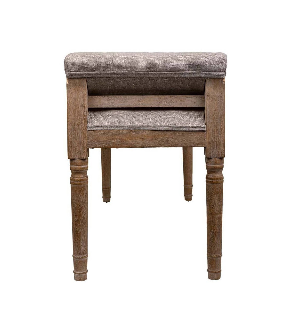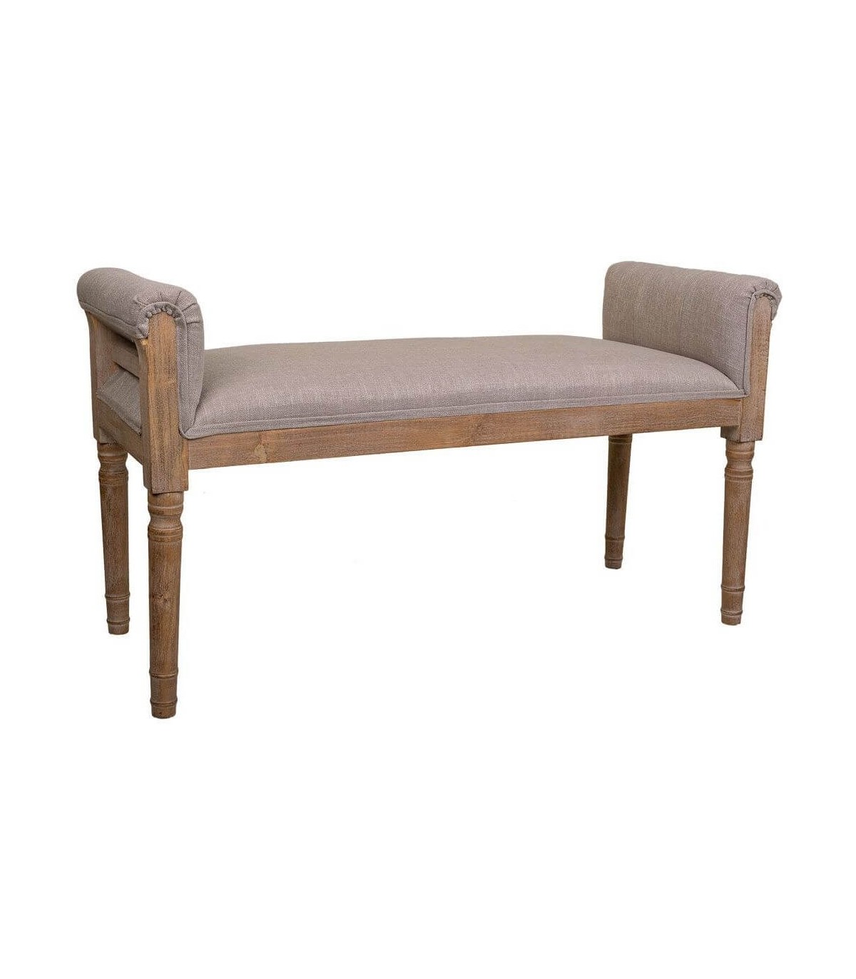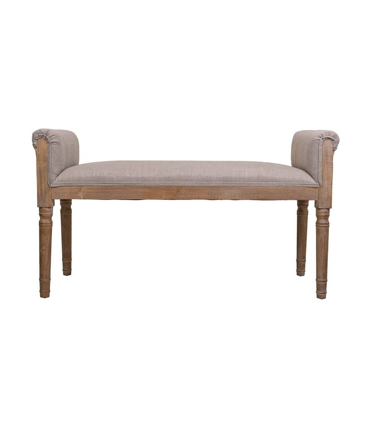 Banco pie de cama de estilo clásico, elegante, sencillo y muy vestido realizado en madera natural, tapizado en lino color topo que encaja muy bien en cualquier decoración.