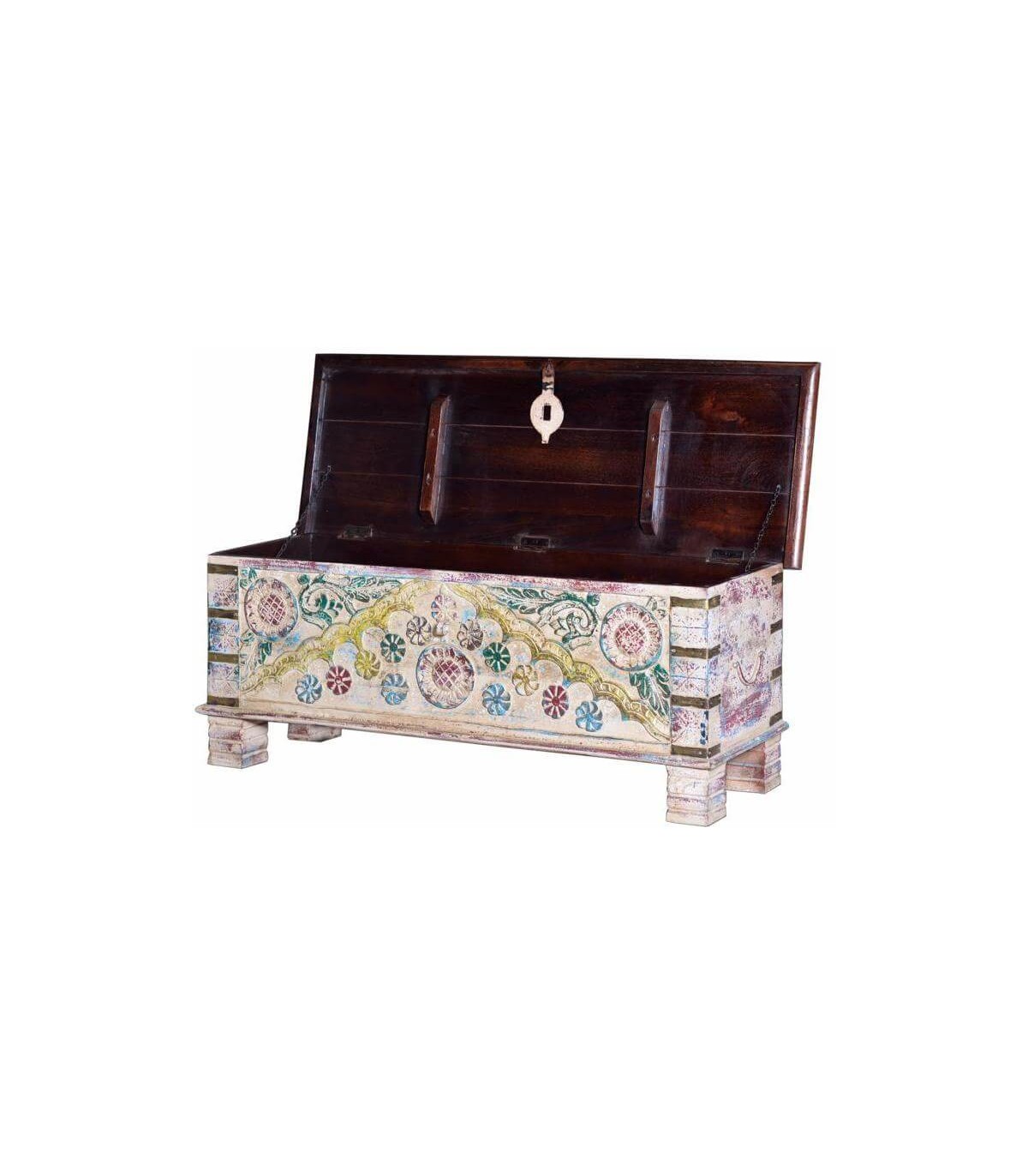 Baúl realizado en madera natural tallada y lavada en blanco policromada en colores pasteles, tapa e interior en color caoba, un baúl con un estilo racial muy marcado donde se aprecia el trabajo artesanal.