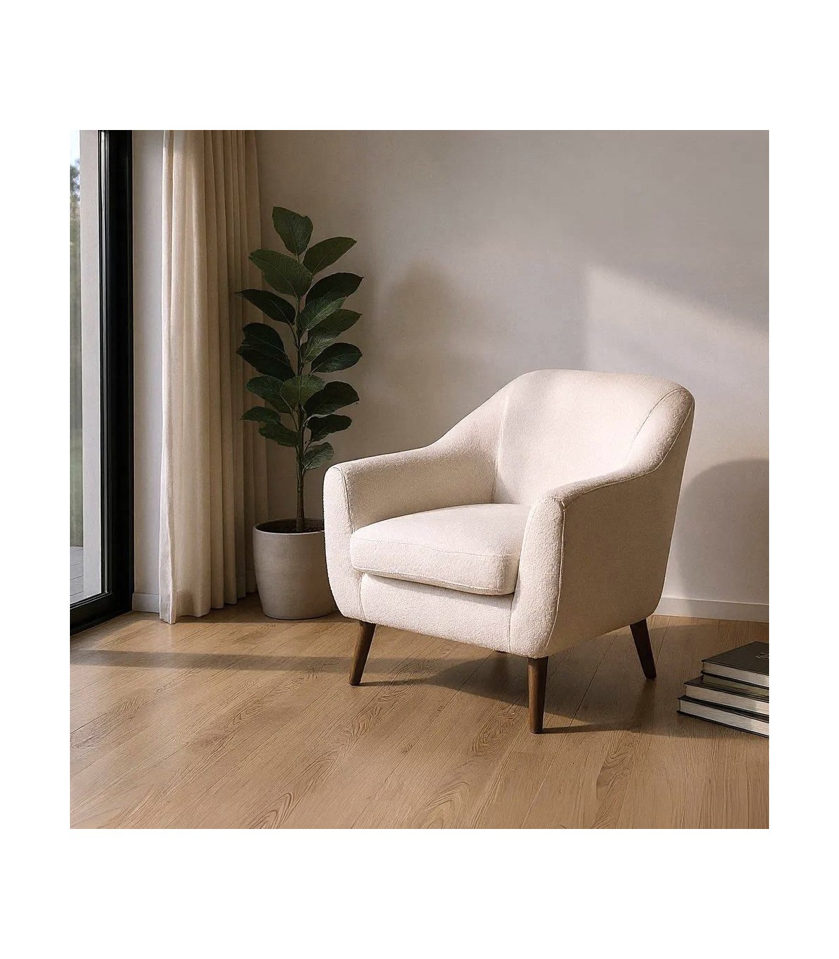 Butaca de líneas suaves con estructura de madera de caucho y tapizado en bouclé blanco de textura cálida; el cojín desenfundable con cremallera facilita el mantenimiento diario. Su asiento envolvente y respaldo amable invitan a descansar en un rincón de lectura o junto al sofá, aportando confort real sin perder ligereza visual.