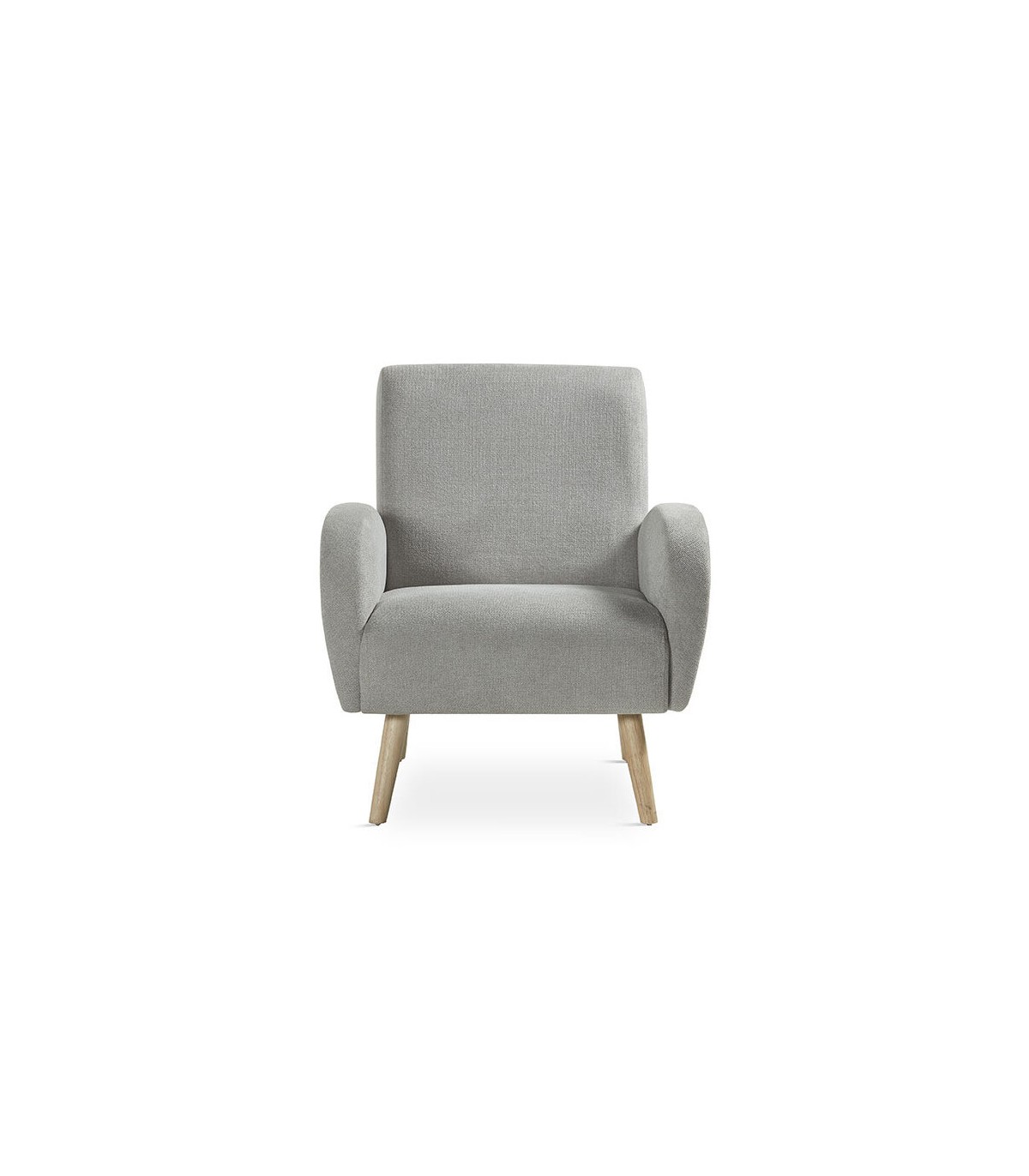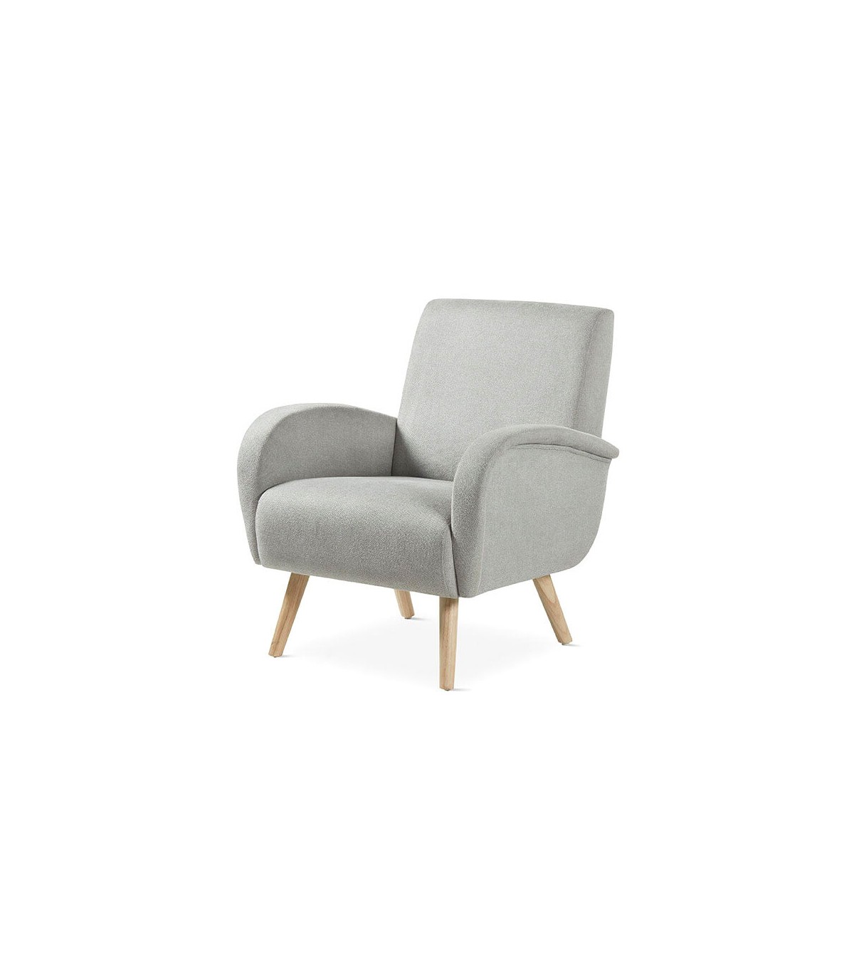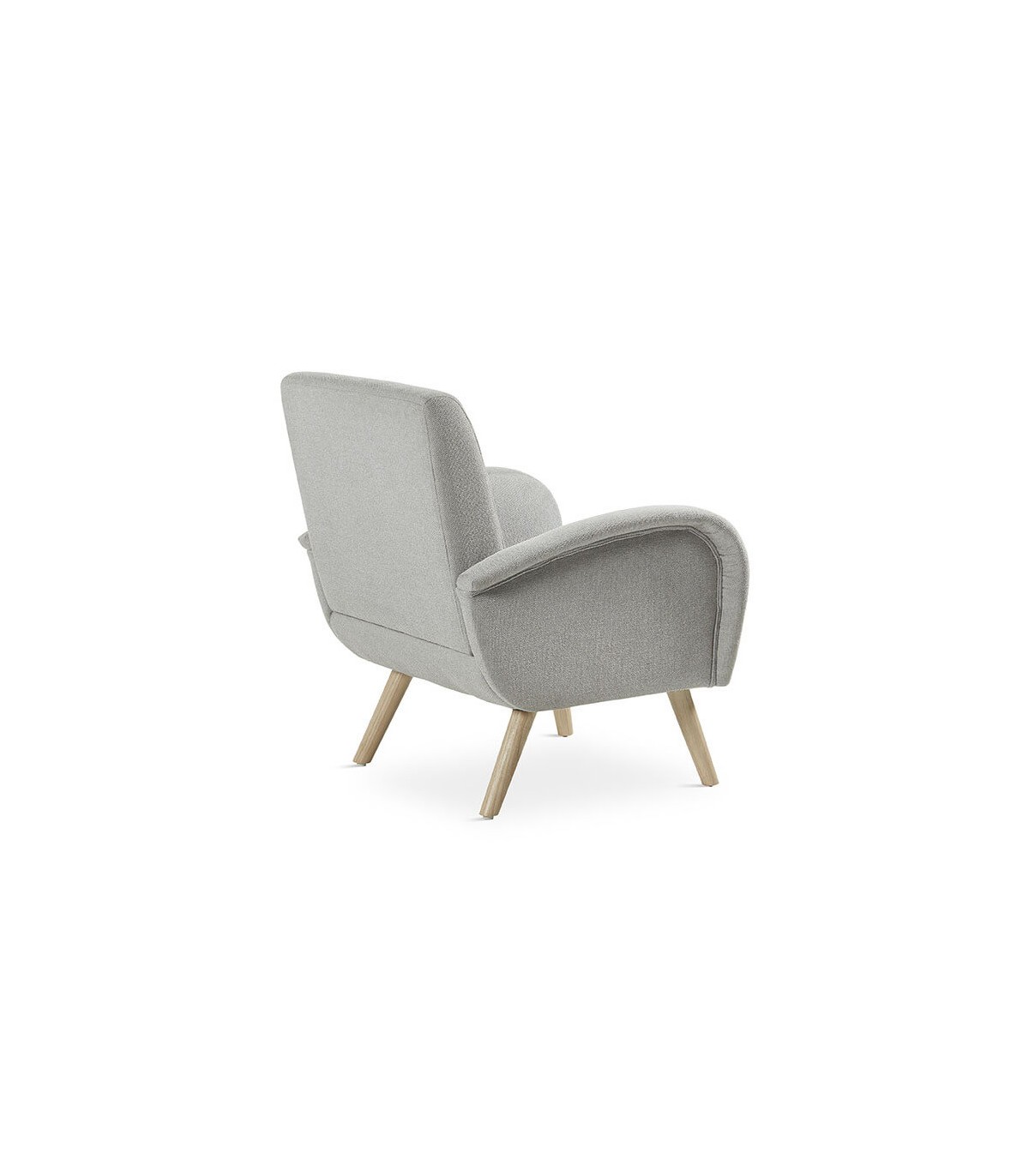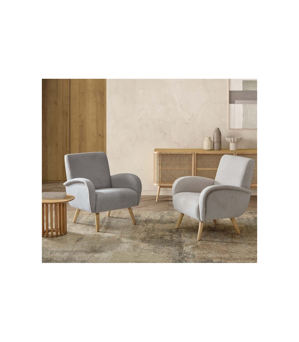 Butaca de estilo nórdico tapizado en gris con las patas en madera acabado natural, un sillón muy cómodo que encaja bien en varios estilos de decoración.