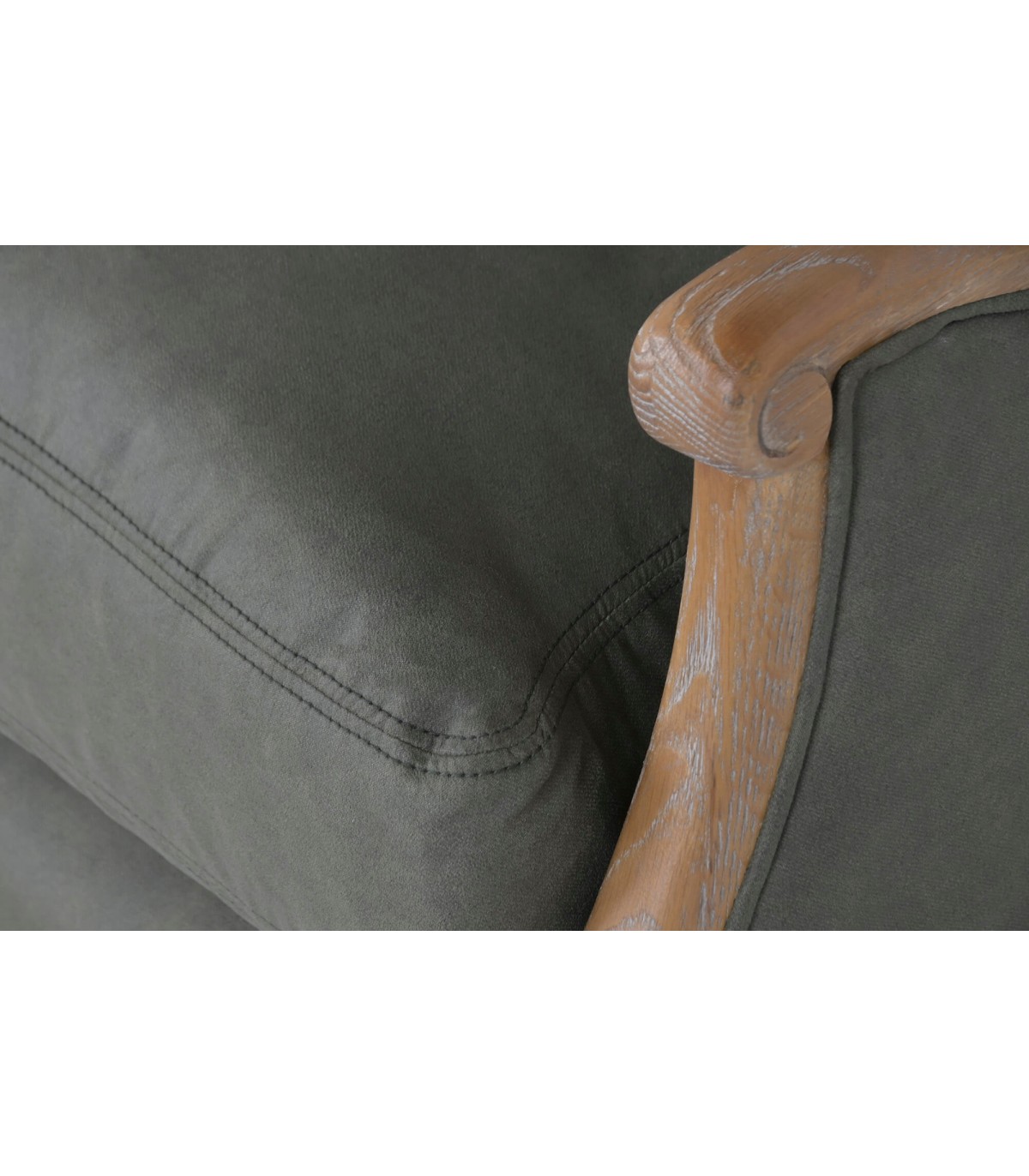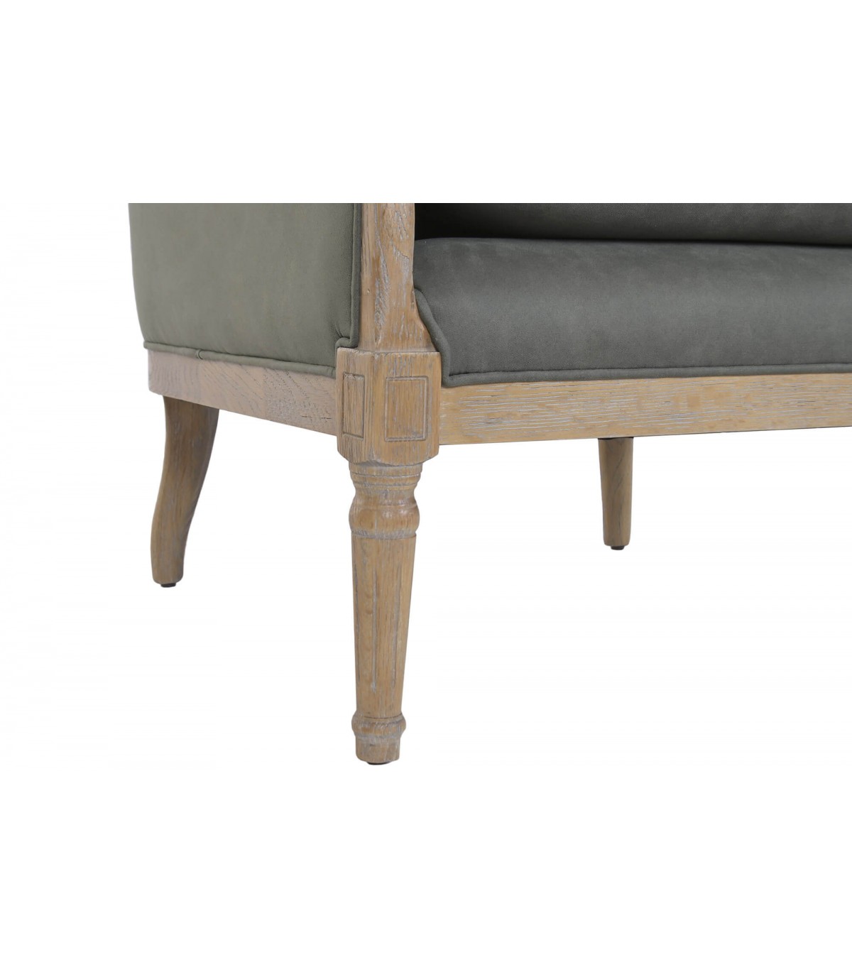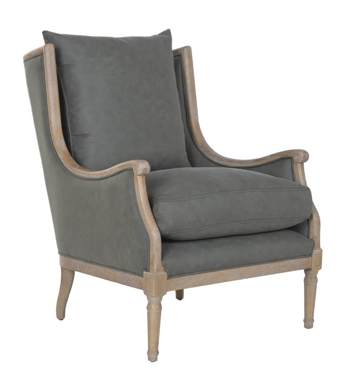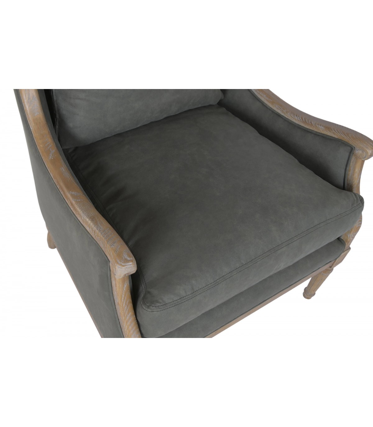 El tapizado en loneta gris es sobrio y fácil de combinar con distintos estilos decorativos. La madera tallada con acabado natural patinado refuerza su carácter artesanal. Es una pieza ideal para salones, rincones de lectura o dormitorios con un aire clásico y cuidado.