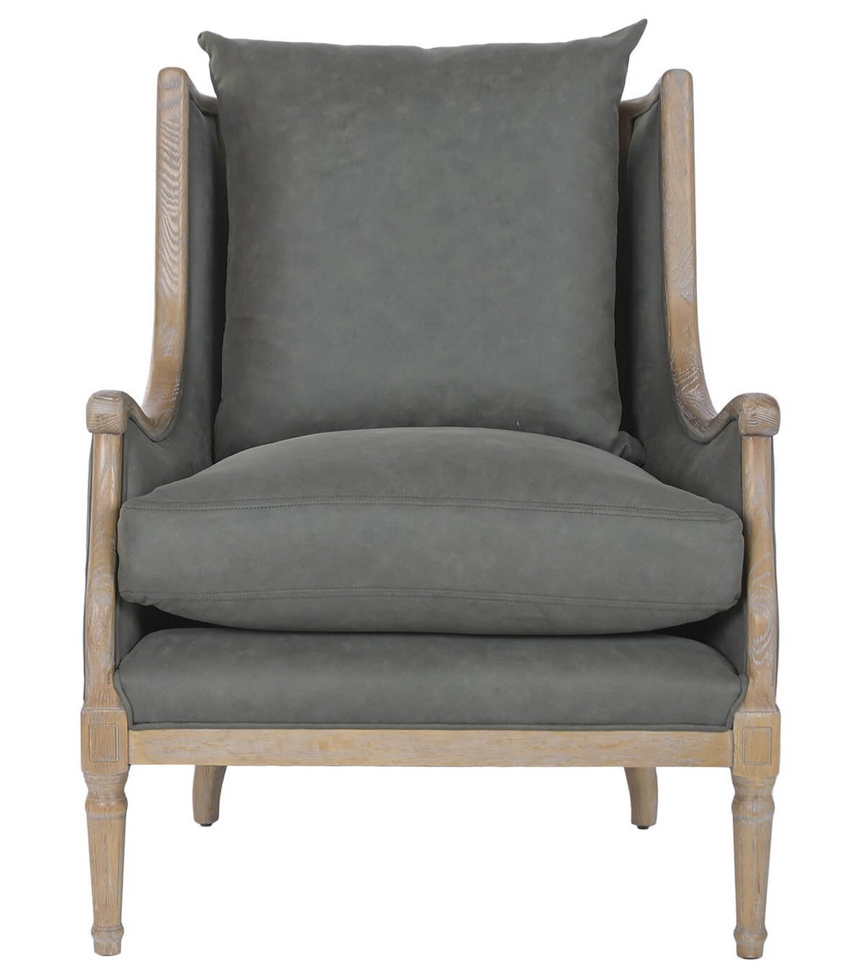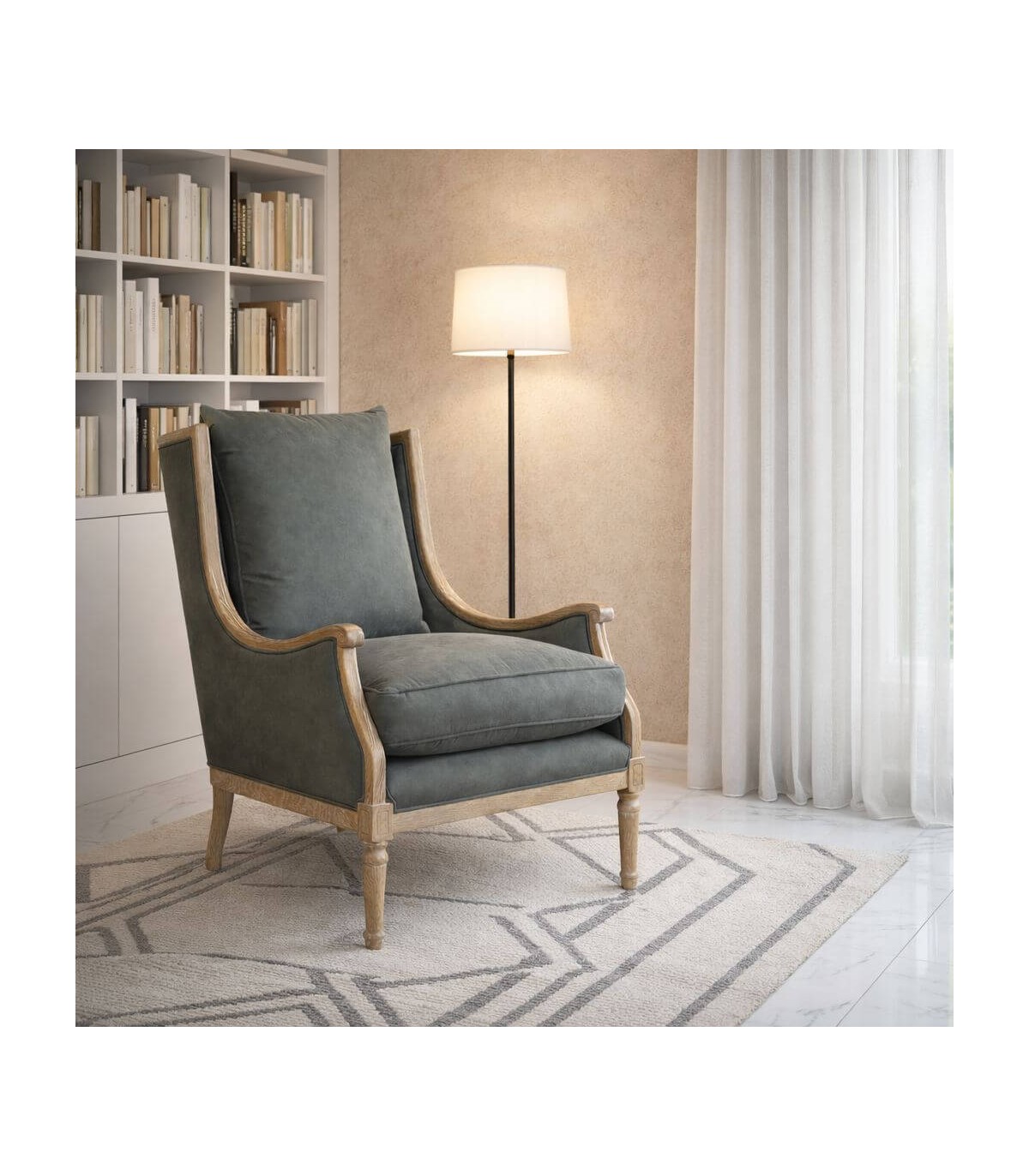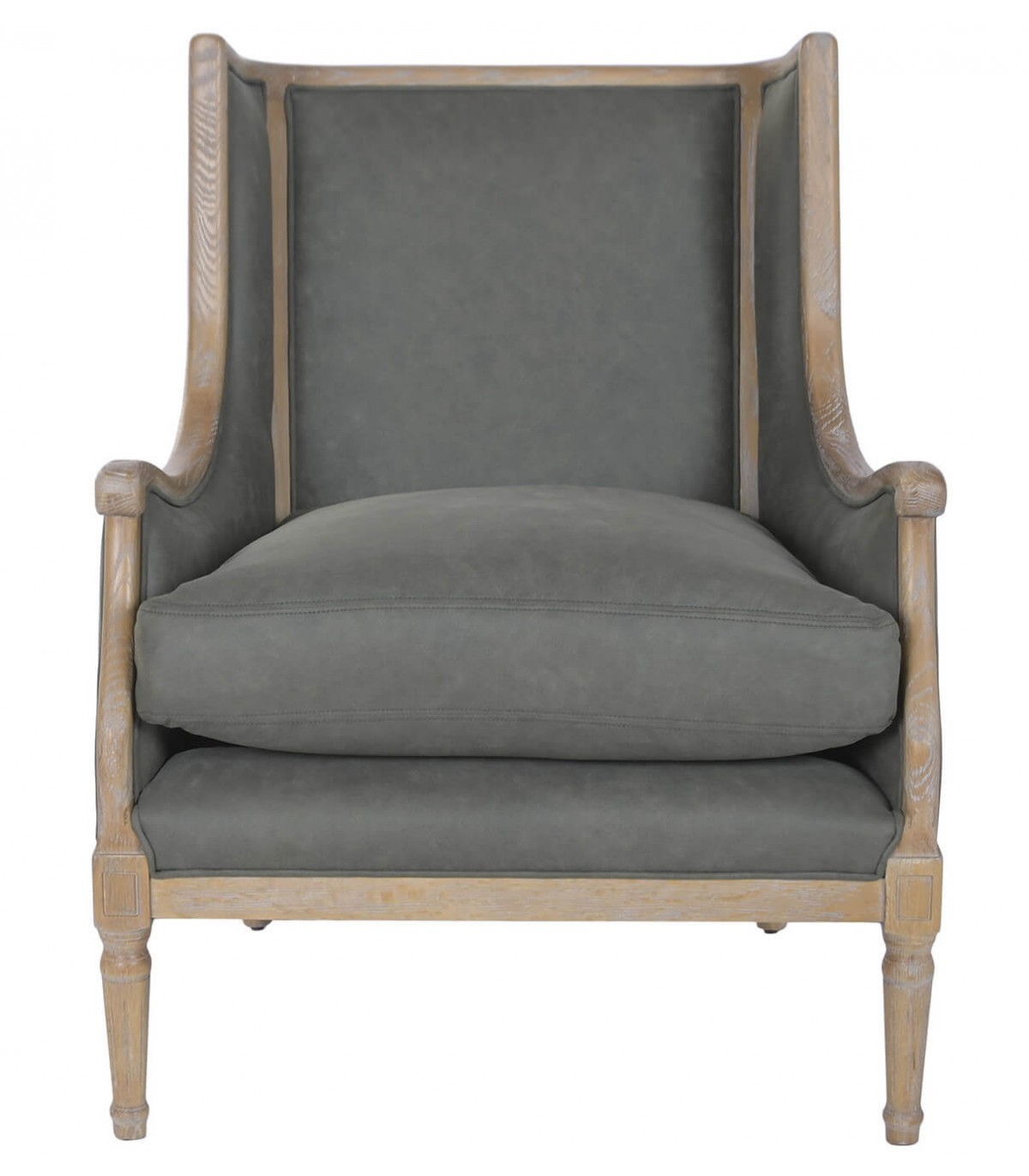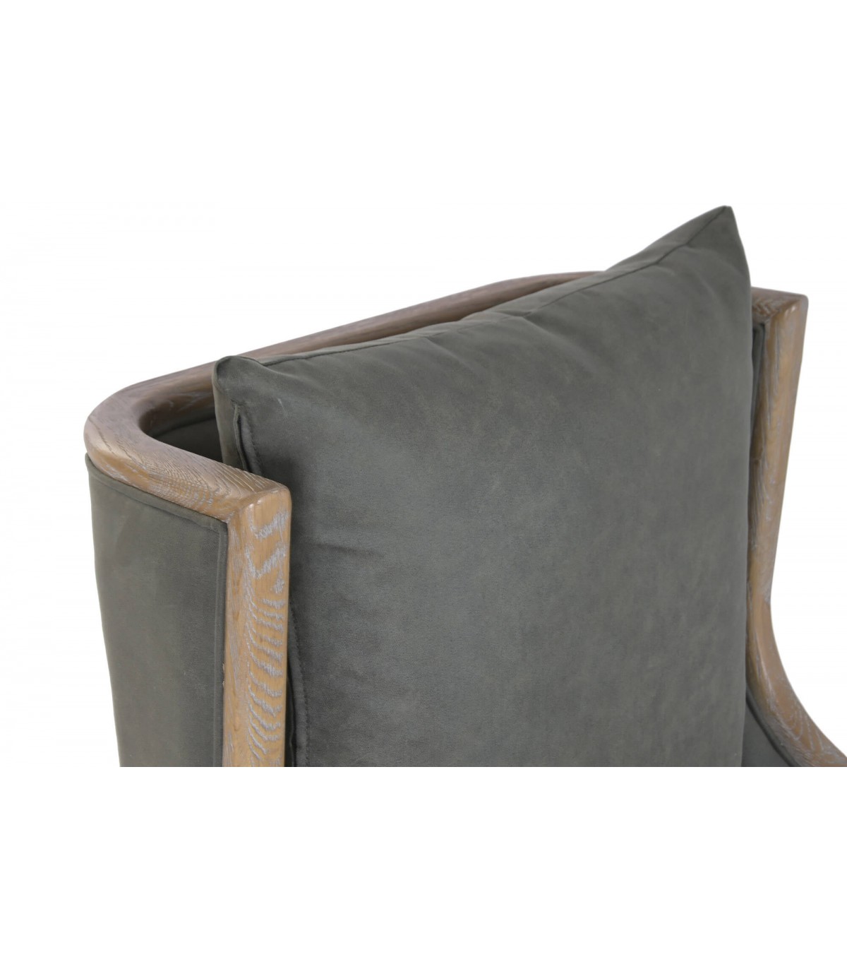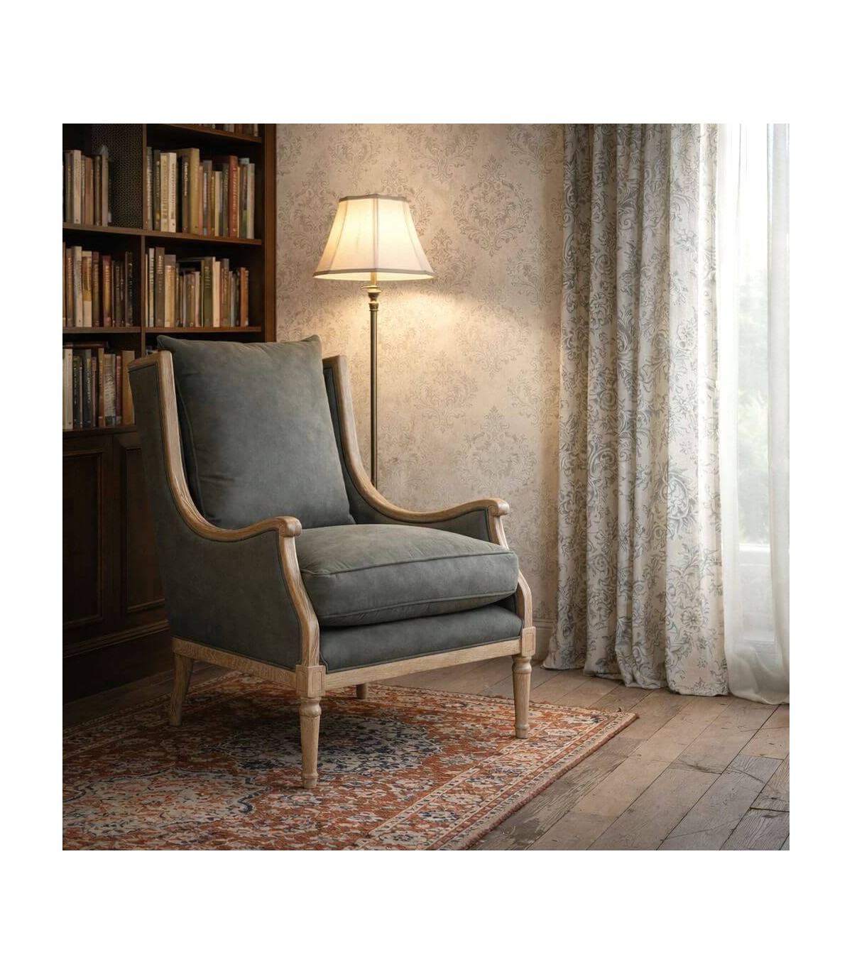 El tapizado en loneta gris es sobrio y fácil de combinar con distintos estilos decorativos. La madera tallada con acabado natural patinado refuerza su carácter artesanal. Es una pieza ideal para salones, rincones de lectura o dormitorios con un aire clásico y cuidado.