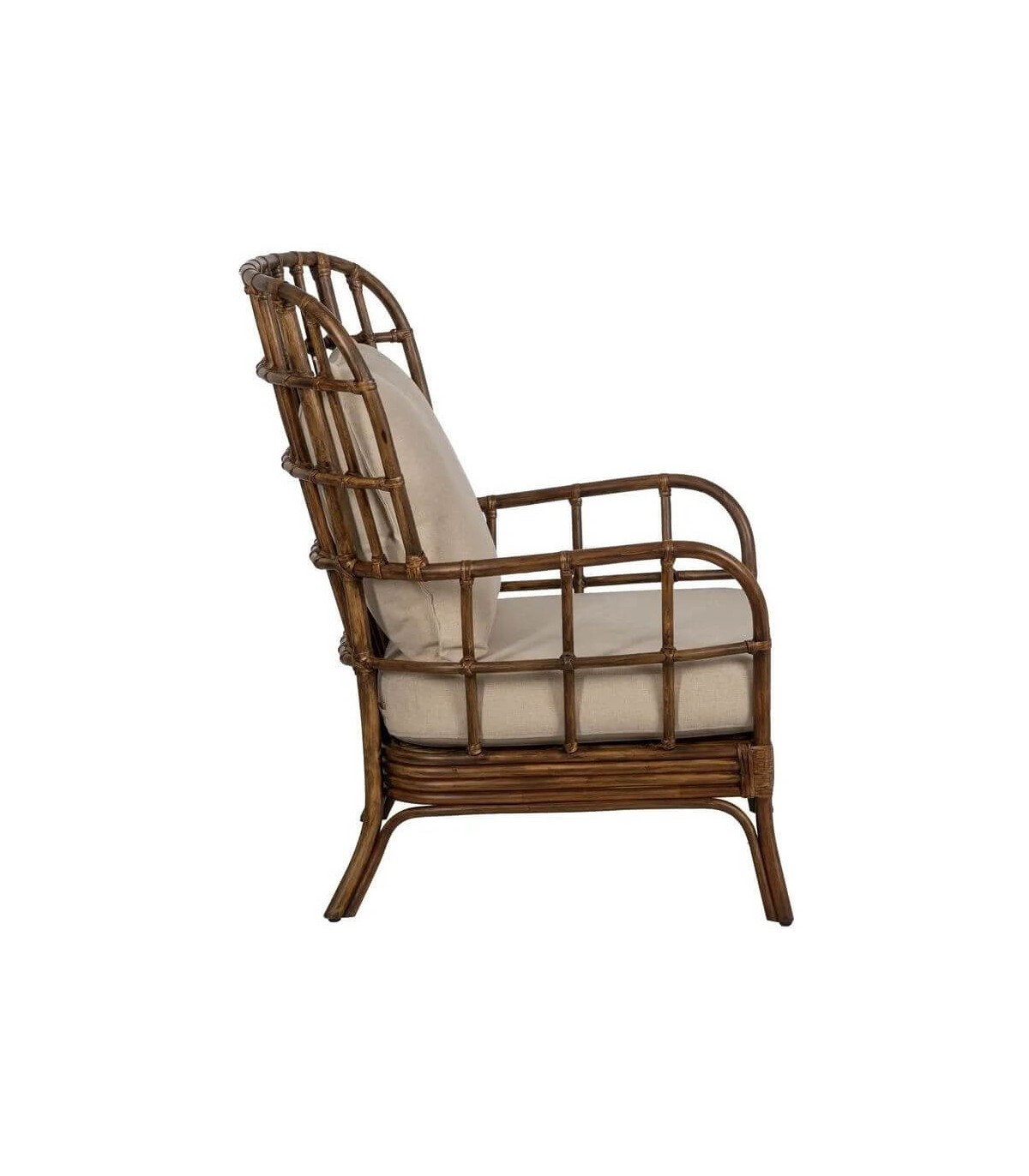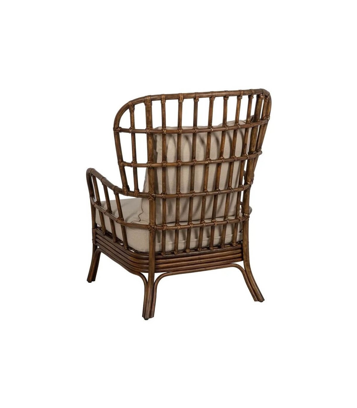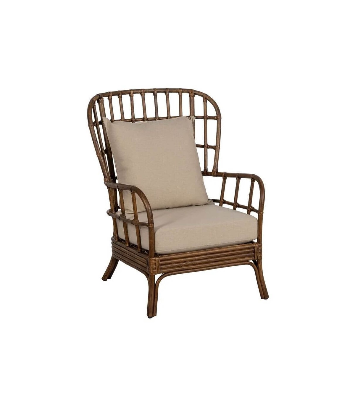 Diseñada para ofrecer confort y belleza natural, esta butaca combina estructura artesanal de ratán trenzado a mano con suaves cojines desenfundables en textil beige. Su silueta envolvente y respaldo alto aportan una gran comodidad, mientras que el acabado en nogal realza su carácter colonial.