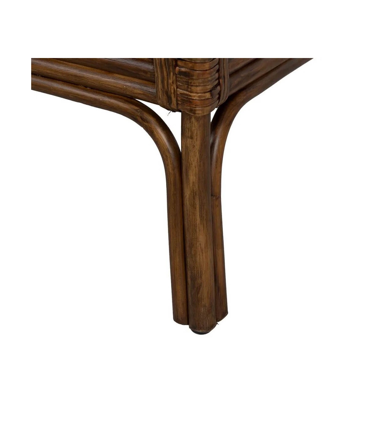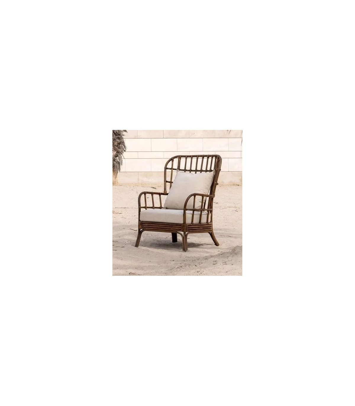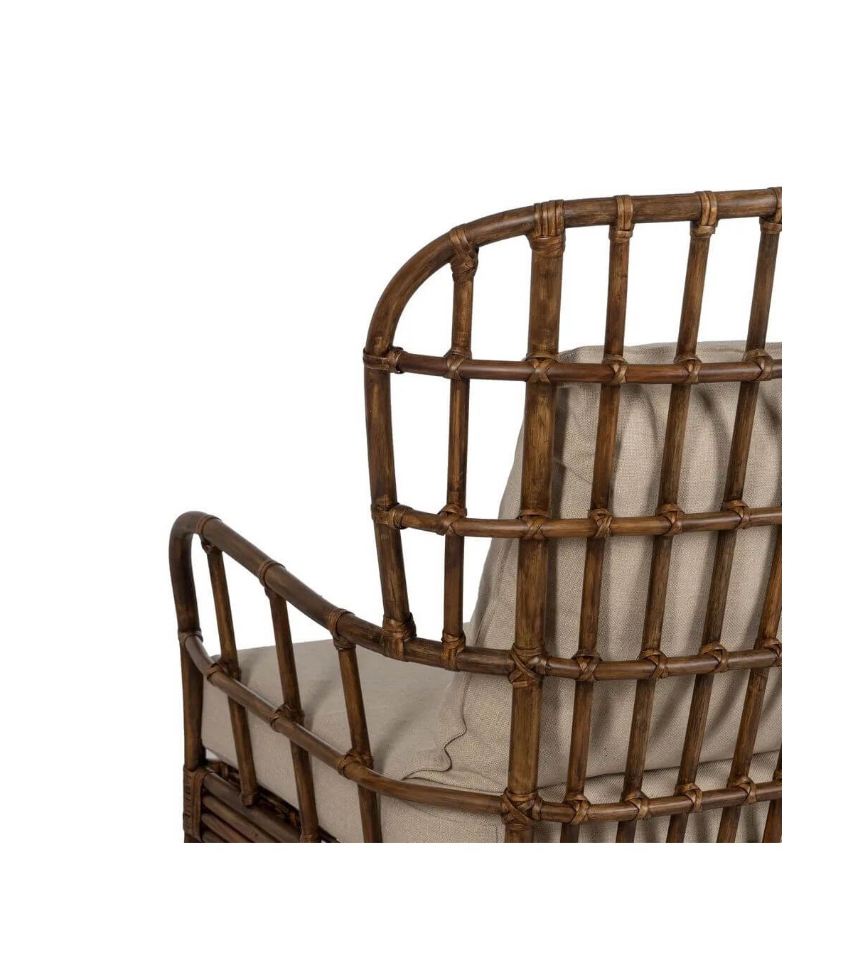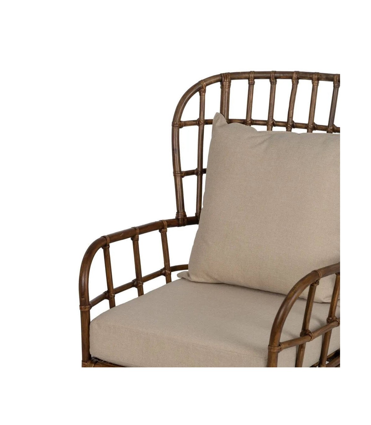 Diseñada para ofrecer confort y belleza natural, esta butaca combina estructura artesanal de ratán trenzado a mano con suaves cojines desenfundables en textil beige. Su silueta envolvente y respaldo alto aportan una gran comodidad, mientras que el acabado en nogal realza su carácter colonial.