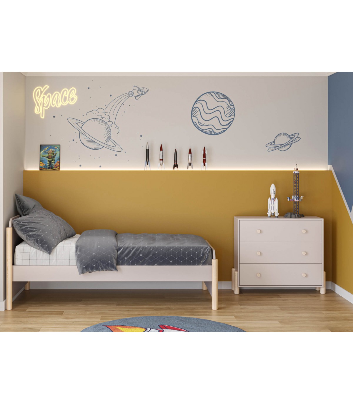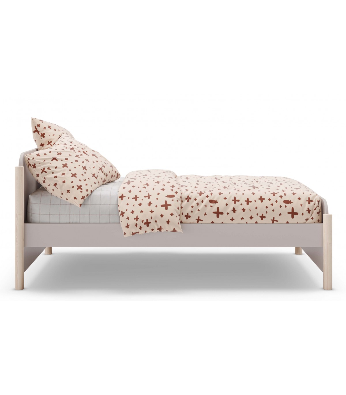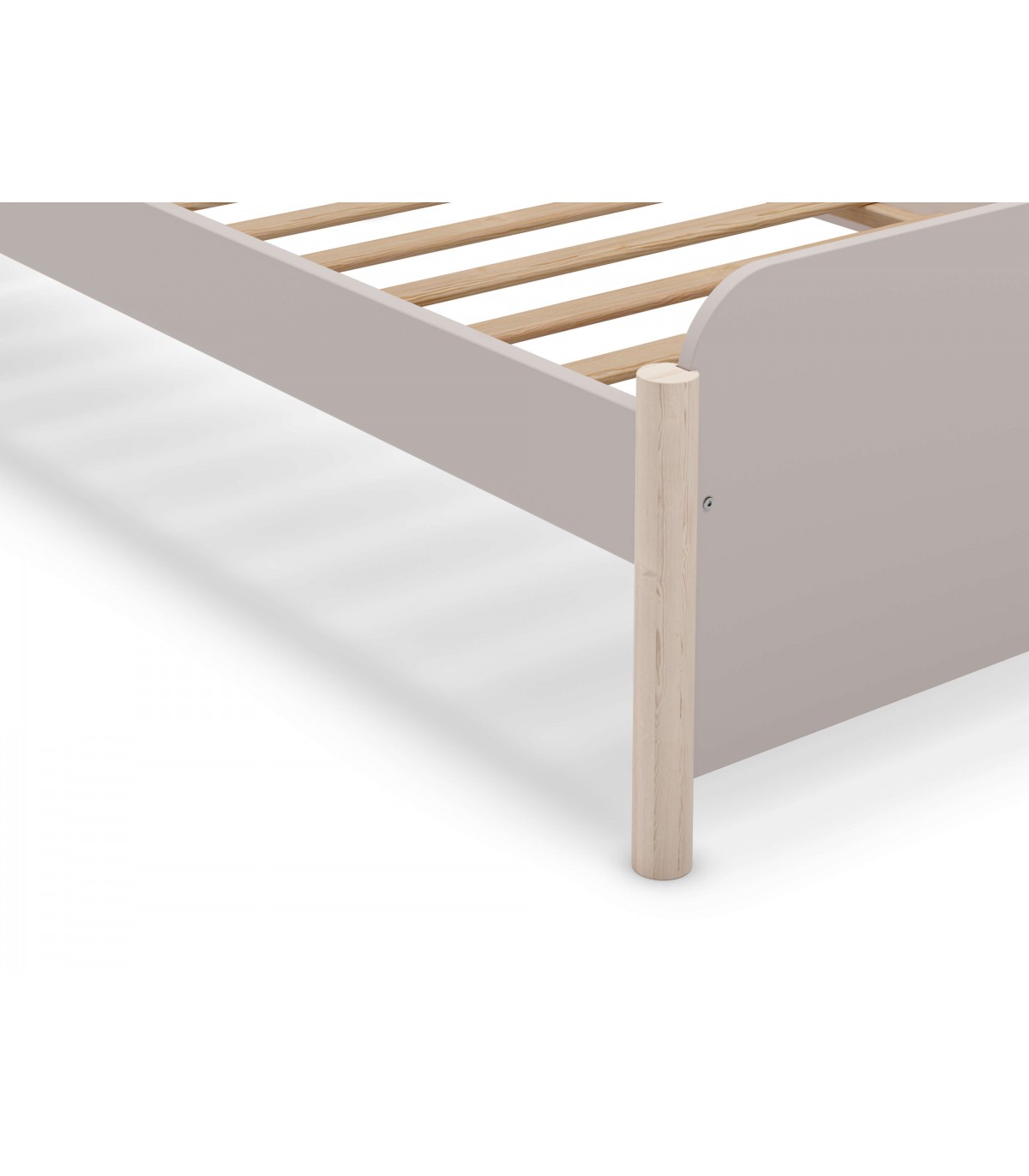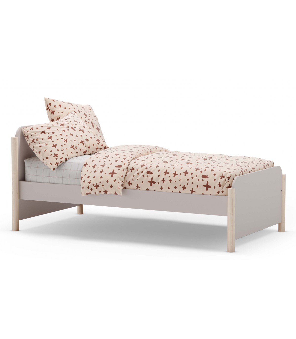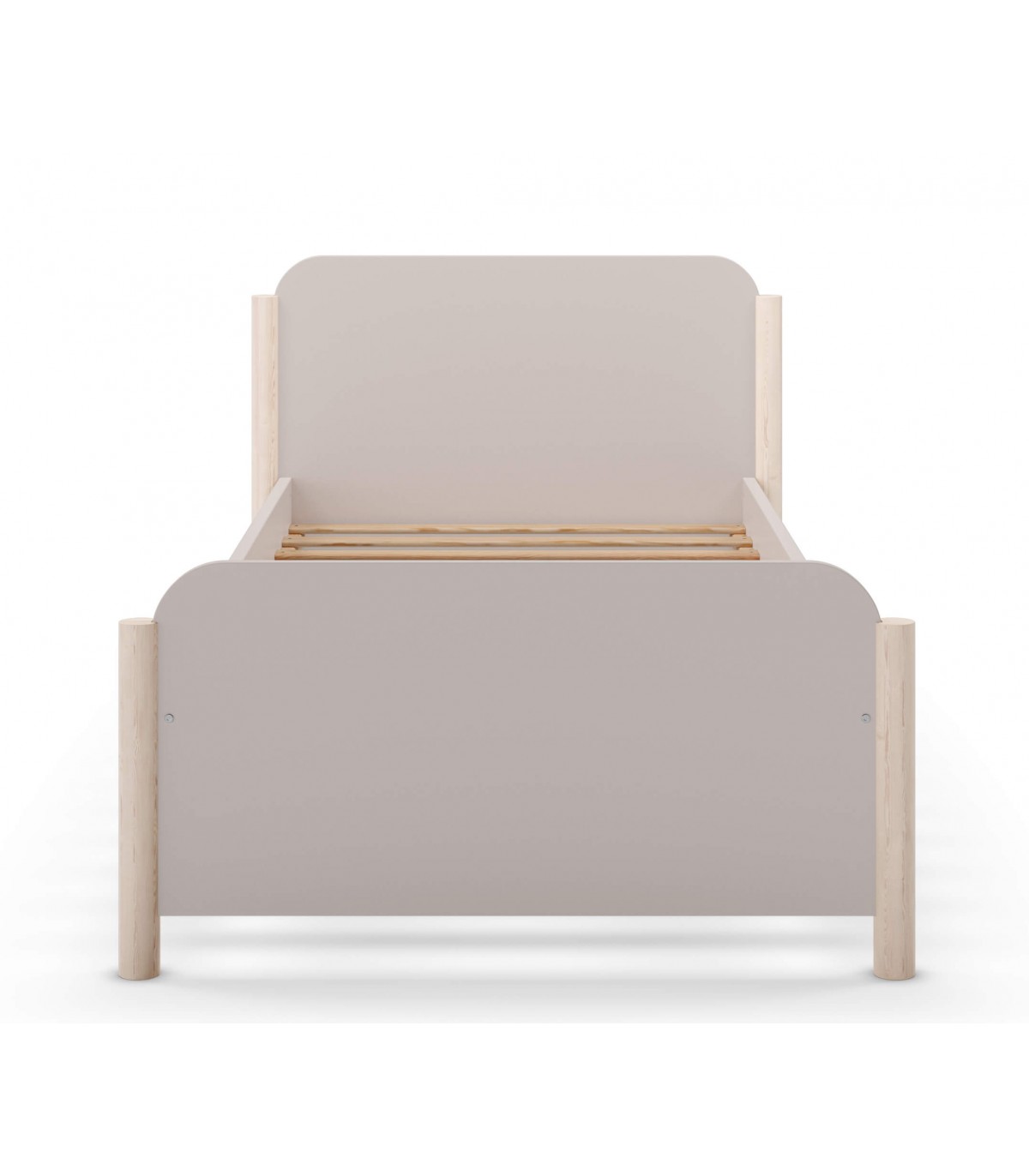 Cama individual Lonea realizada en madera de pino natural y mdf lacado en color topo, una cama perfecta para habitaciones juveniles o para instalaciones, de diseño sencillo y original.