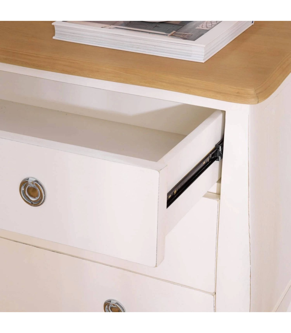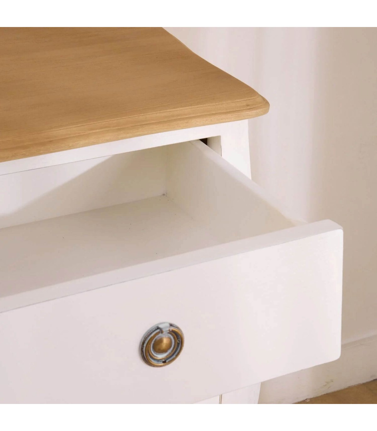 Las líneas curvas y los tiradores metálicos aportan un aire artesanal y bohemio lleno de personalidad. Perfecta para ambientes románticos o de inspiración mediterránea, donde la luz y la calma son protagonistas. Una pieza funcional y decorativa que equilibra belleza, textura y autenticidad en cada detalle.
