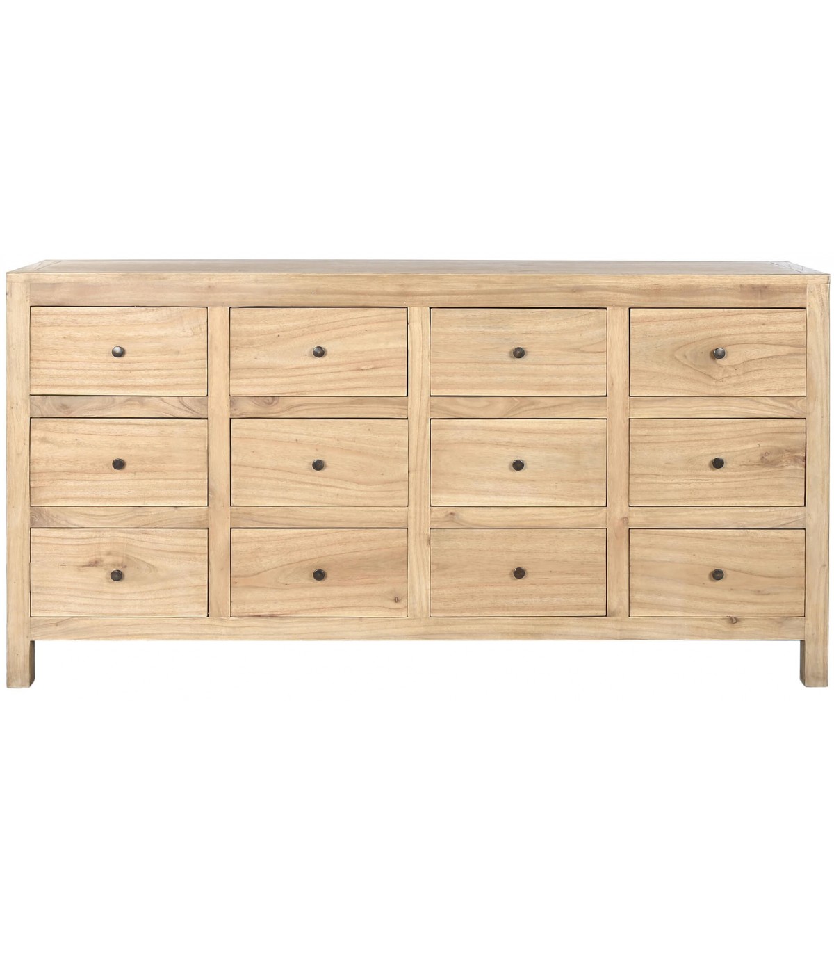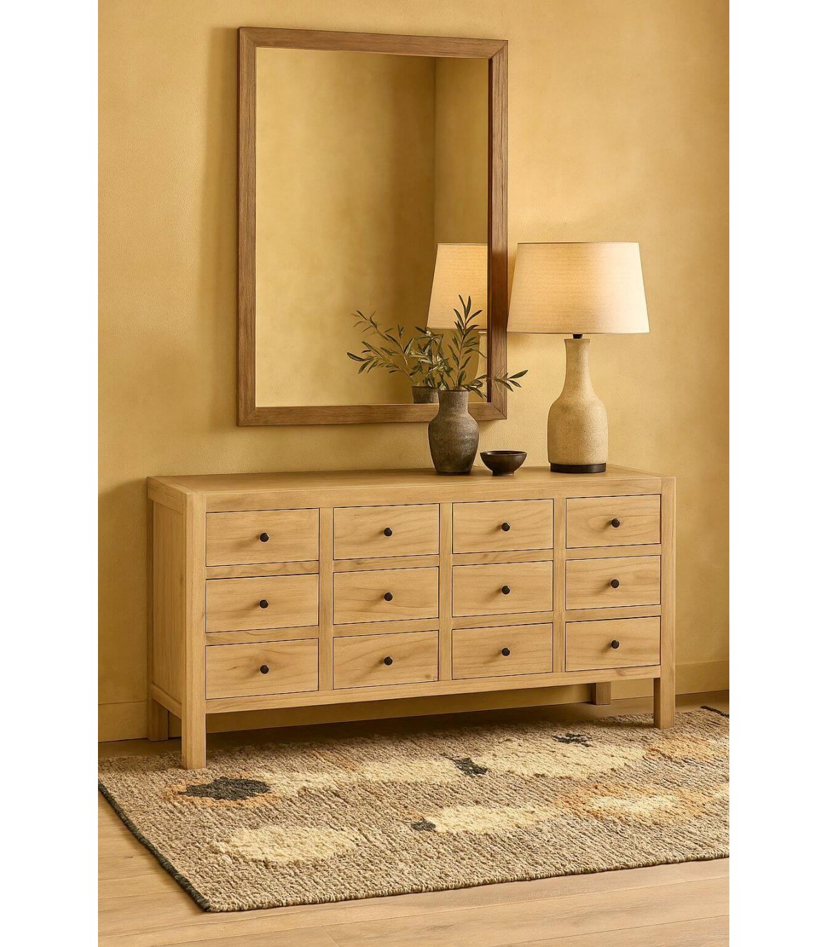 Con sus doce cajones funcionales y una estructura de líneas puras, esta cómoda XXL es ideal para quienes buscan almacenaje con carácter natural. Fabricada en madera de mindi, su acabado natural destaca las vetas y aporta calidez al espacio, mientras que los tiradores metálicos dorados con pátina negra añaden un sutil contraste boho-industrial.