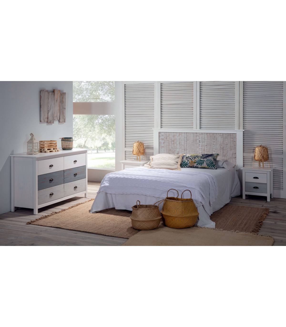 Cómoda de estilo nódico, sencilla con un toque muy personal y buena calidad y gran capacidad, los cajones van con guías, existen las mesitas de noche y el cabecero a juego.