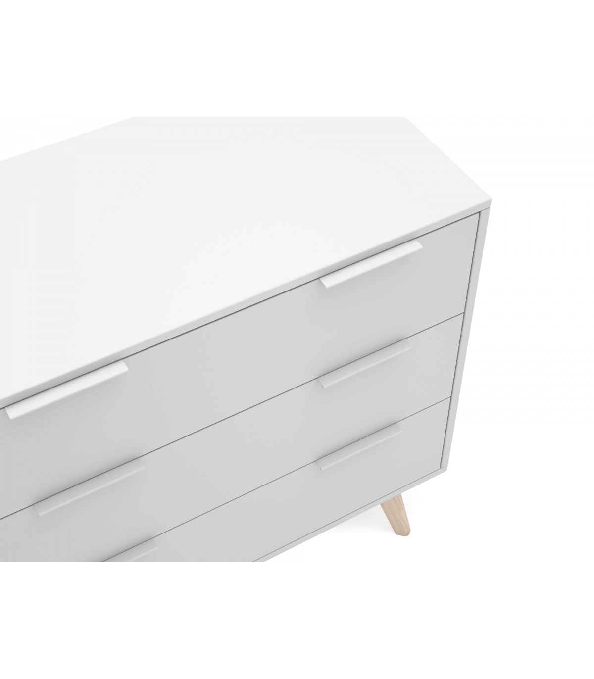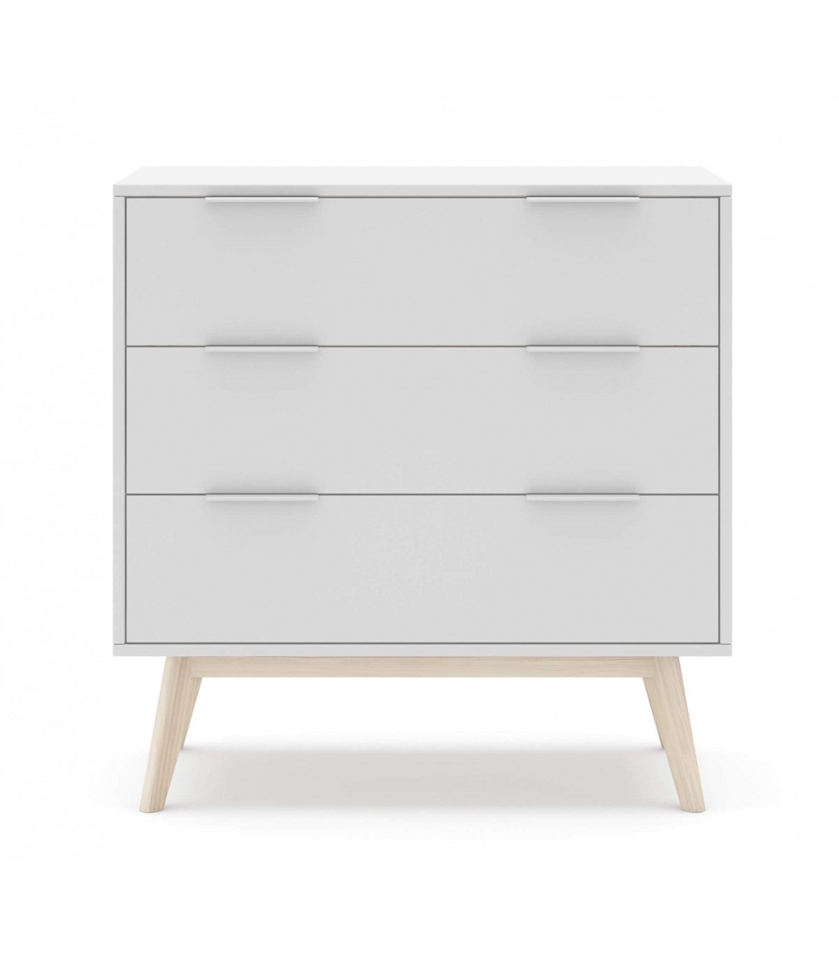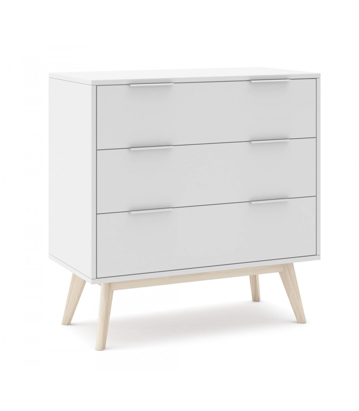 Cómoda pequeña línea nórdica lacado en color blanco y madera natural con 3 cajones, de buena presencia y capacidad, el lacado en color blanco y el contraste con la madera natural le da un aspecto muy fresco y actual.