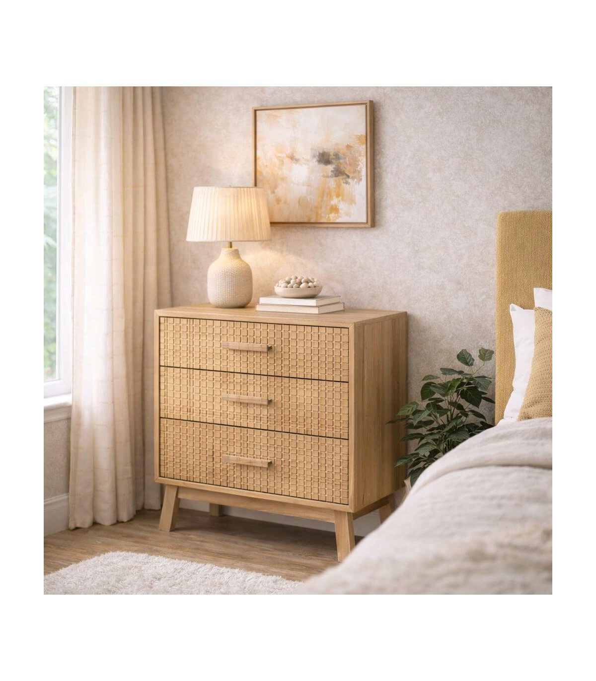 Inspirada en la serenidad funcional de los interiores nórdicos, esta cómoda pequeña aporta equilibrio visual y calidez al dormitorio. La madera de pino transmite una sensación natural y acogedora que envuelve el conjunto. Los tres cajones con frente tallado crean un efecto sutil y decorativo que realza su presencia.