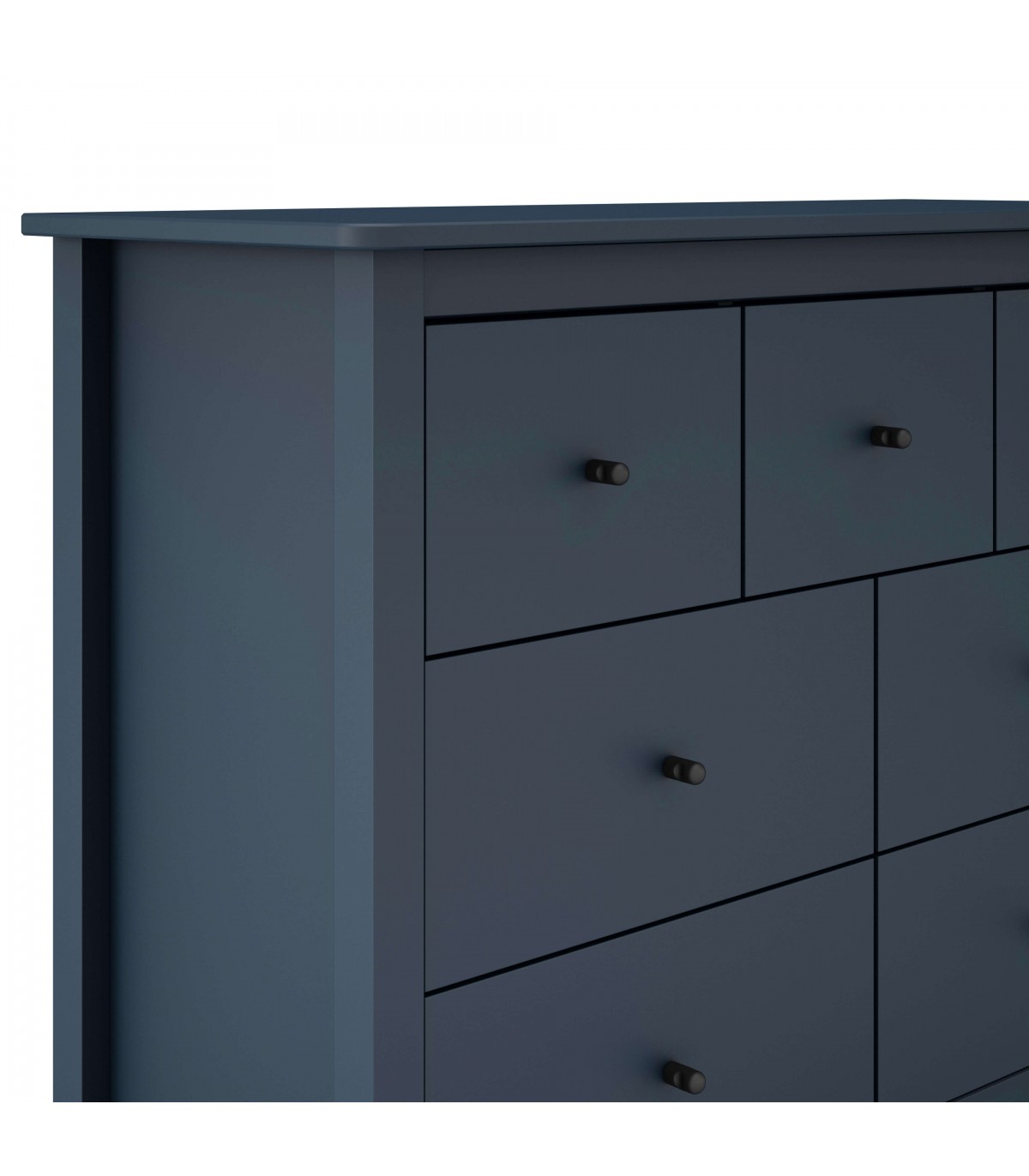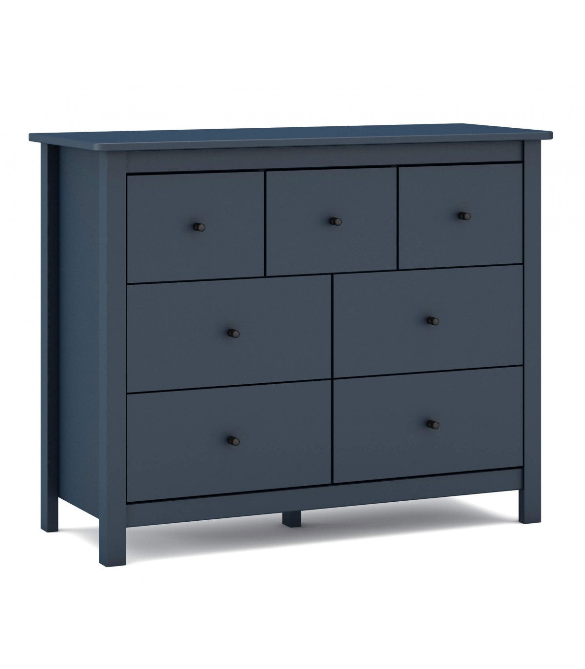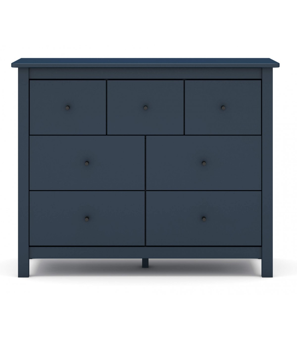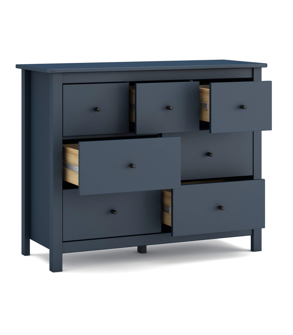 Cómoda realizada en pino lacado en color azul con los tiradores negros, de gran capacidad con sus 7 cajones, perfecta para un dormitorio o como mueble auxiliar, para los que quieren un mueble práctico y decorativo, ideal para darle una nota de color a decoraciones planas.