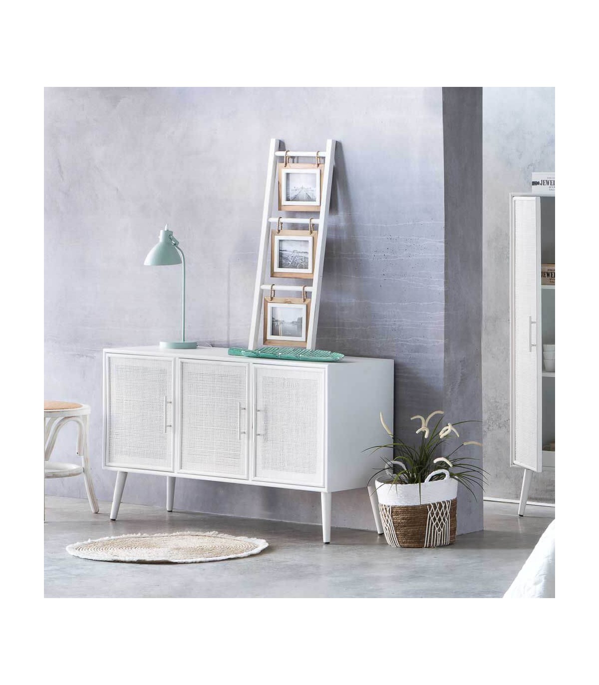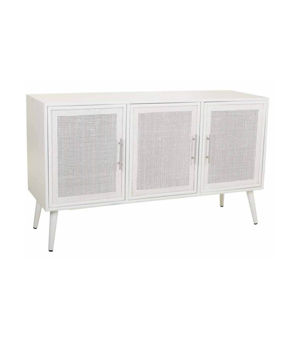 Aparador de nuestra colección Denia, una colección que se caracteriza por la luminosidad que le aporta el blanco lacado con ese pequeño detalle del tirador cromado y el ratán que le da un toque contemporáneo, una colección pensada para darle ese toque natural sofisticado en tu dormitorio o tu salón.
