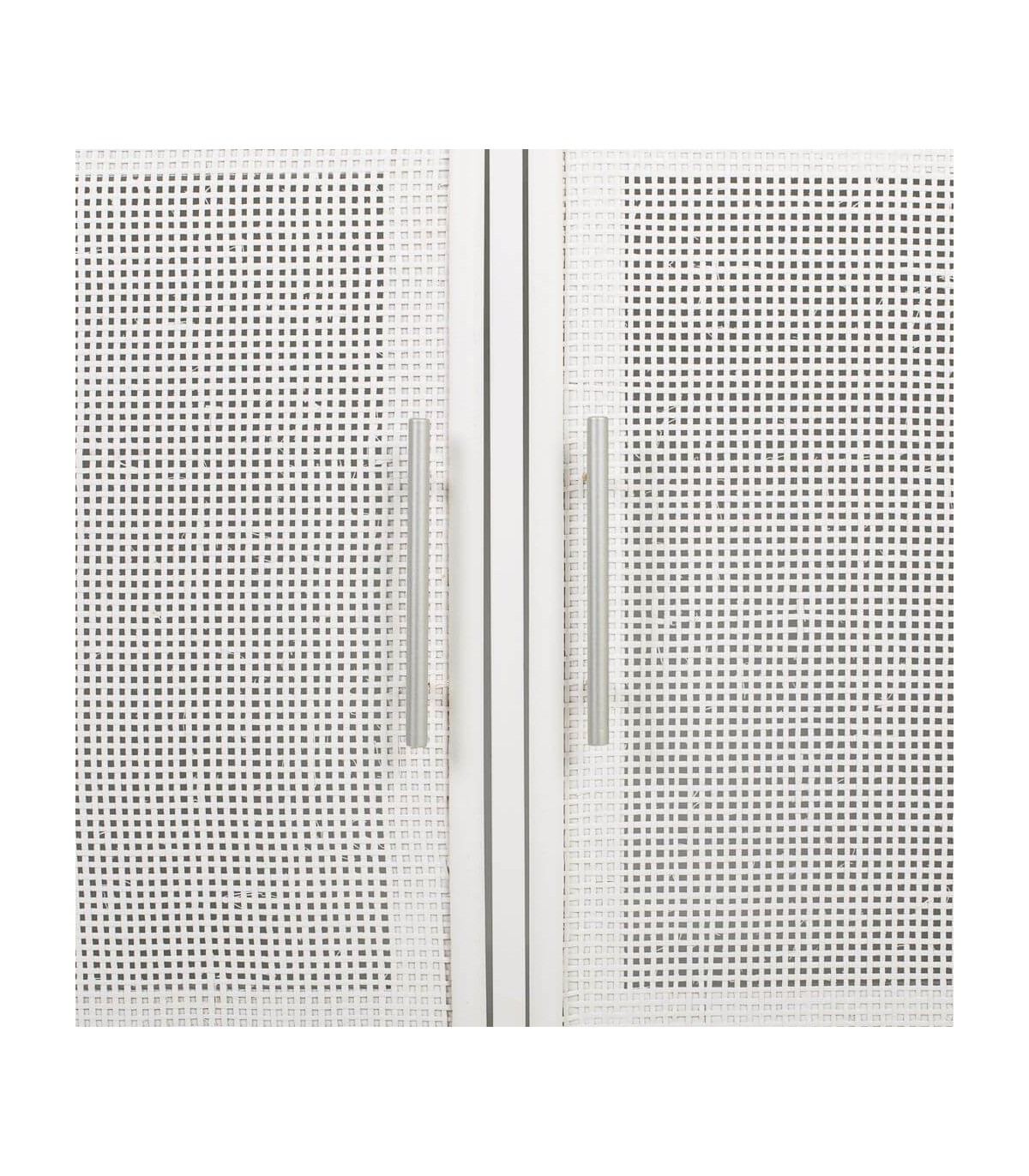 Acabado, madera color blanco, ratán blanco, metal cromado.