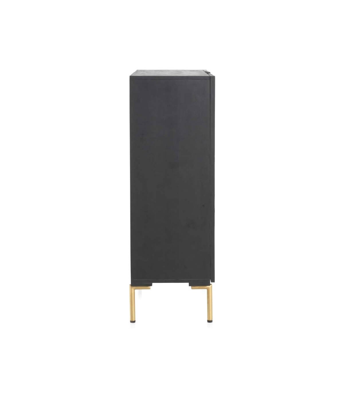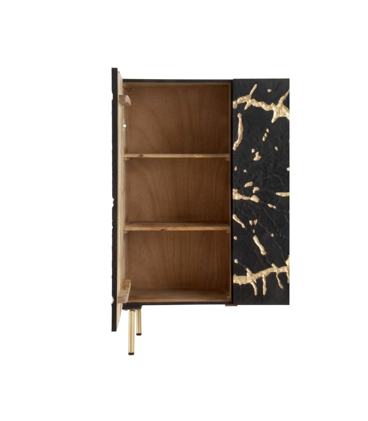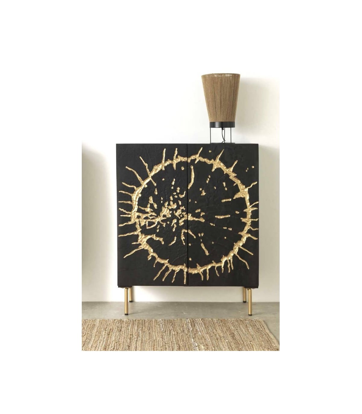 Armario realizado en madera de mango tallado artesanalmente acabado en negro y oro. Un mueble de capacidad con un gran trabajo decorativo, un mueble singular que encaja muy bien en cualquier decoración.