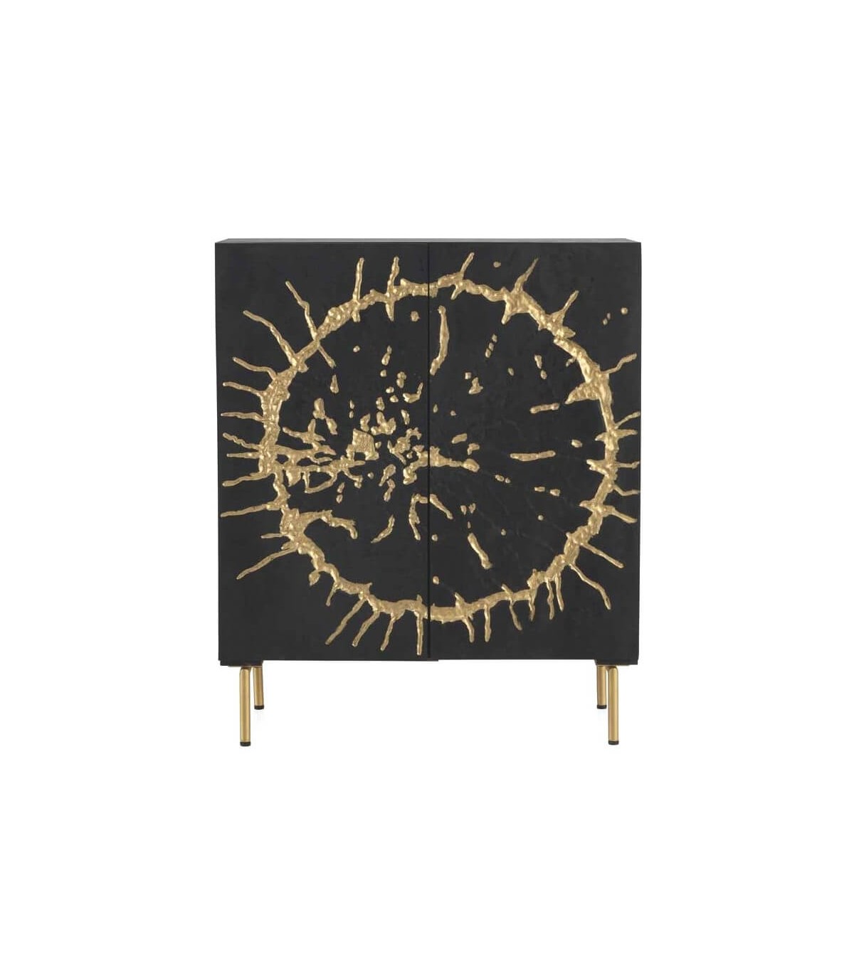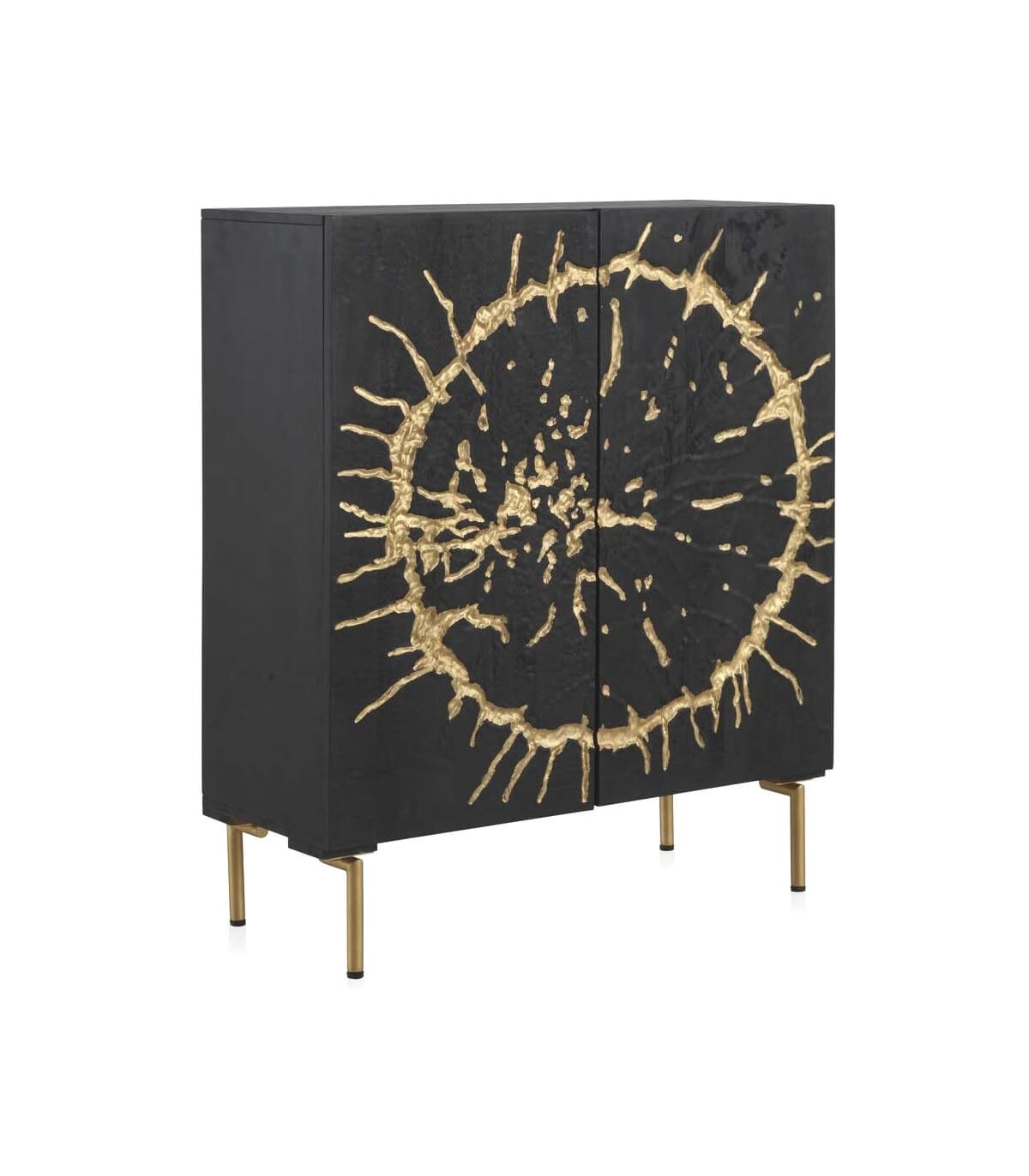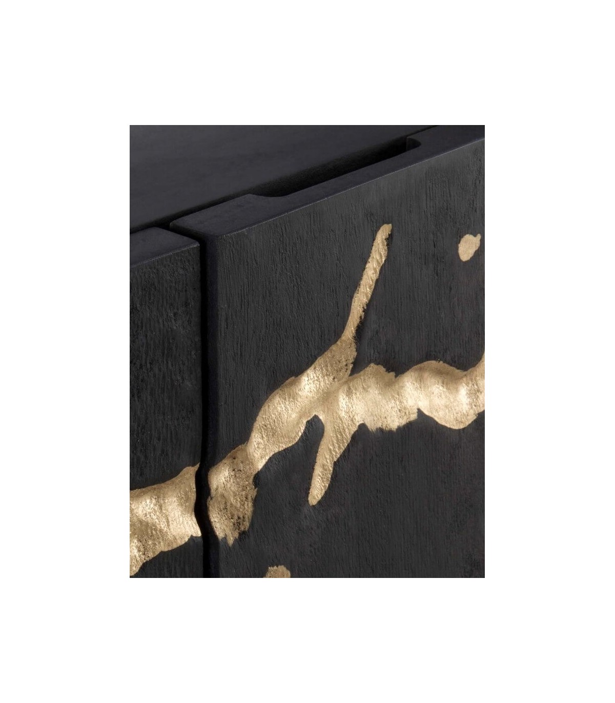 Armario realizado en madera de mango tallado artesanalmente acabado en negro y oro. Un mueble de capacidad con un gran trabajo decorativo, un mueble singular que encaja muy bien en cualquier decoración.