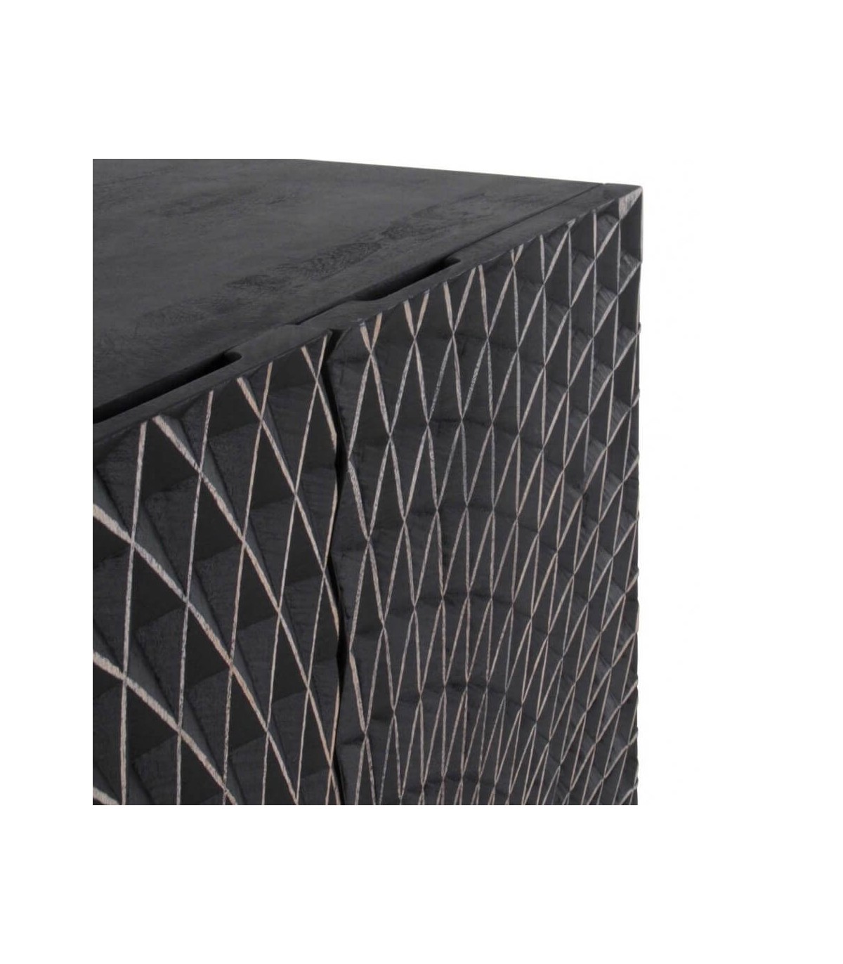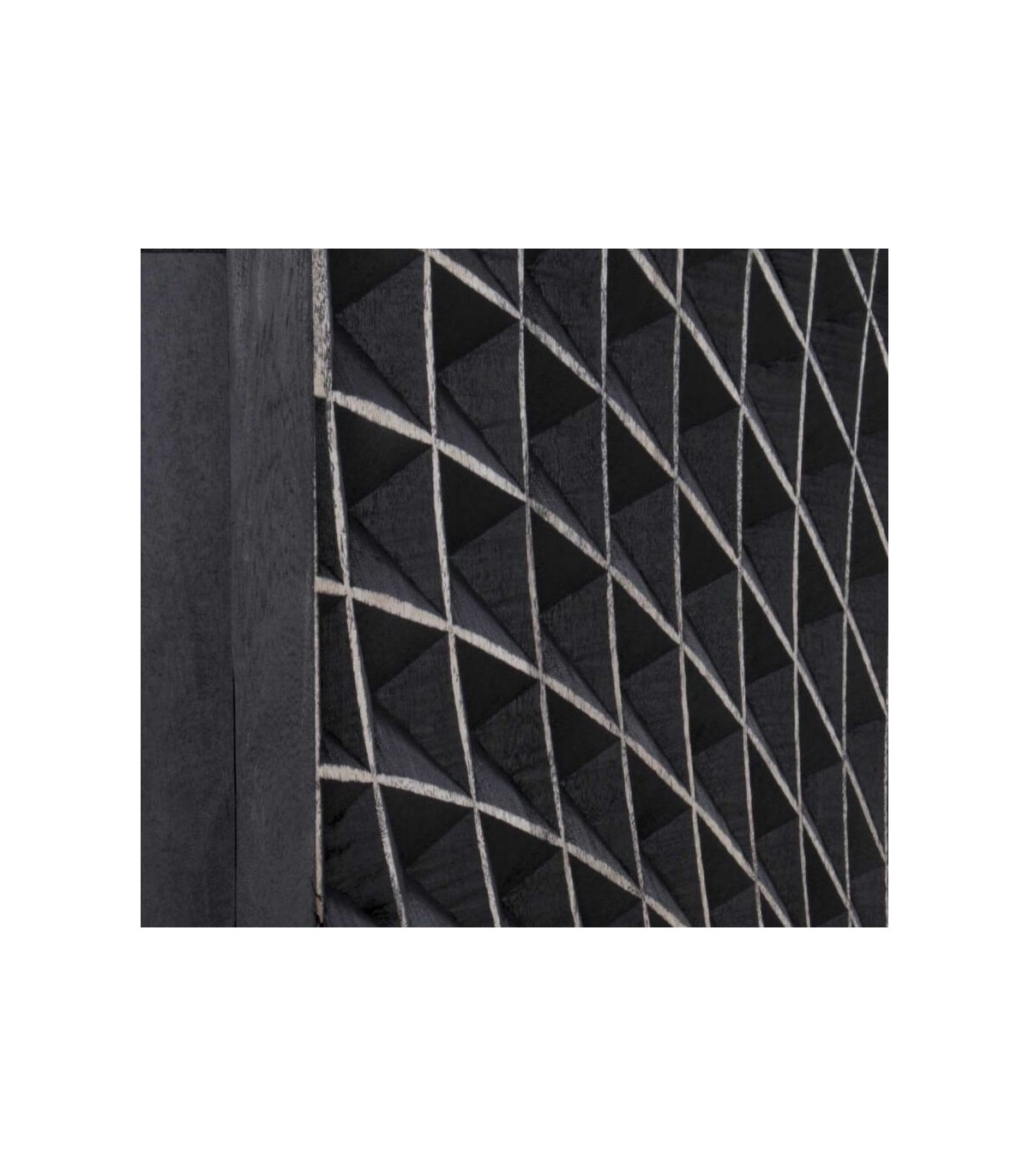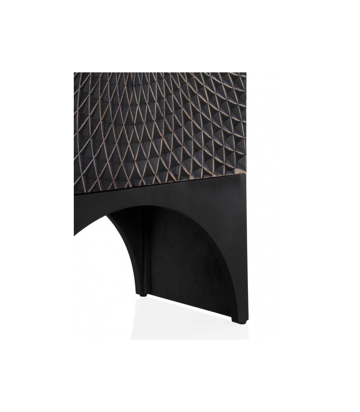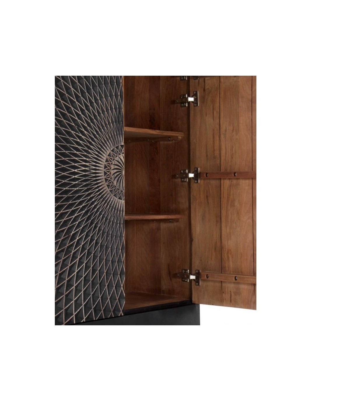 Armario realizado en madera de mango tallado artesanalmente acabado en negro. Un mueble de capacidad con un gran trabajo decorativo, un mueble singular que encaja muy bien en cualquier decoración.