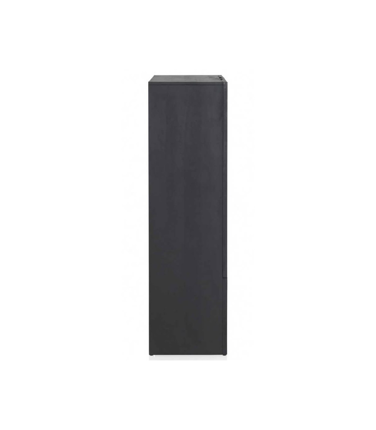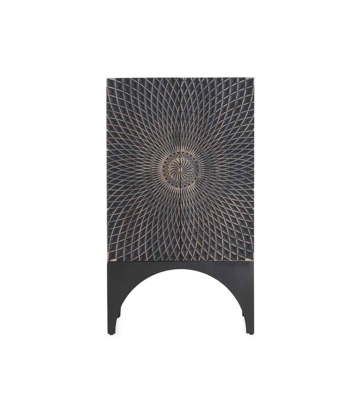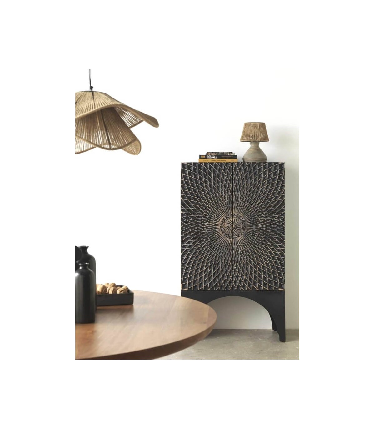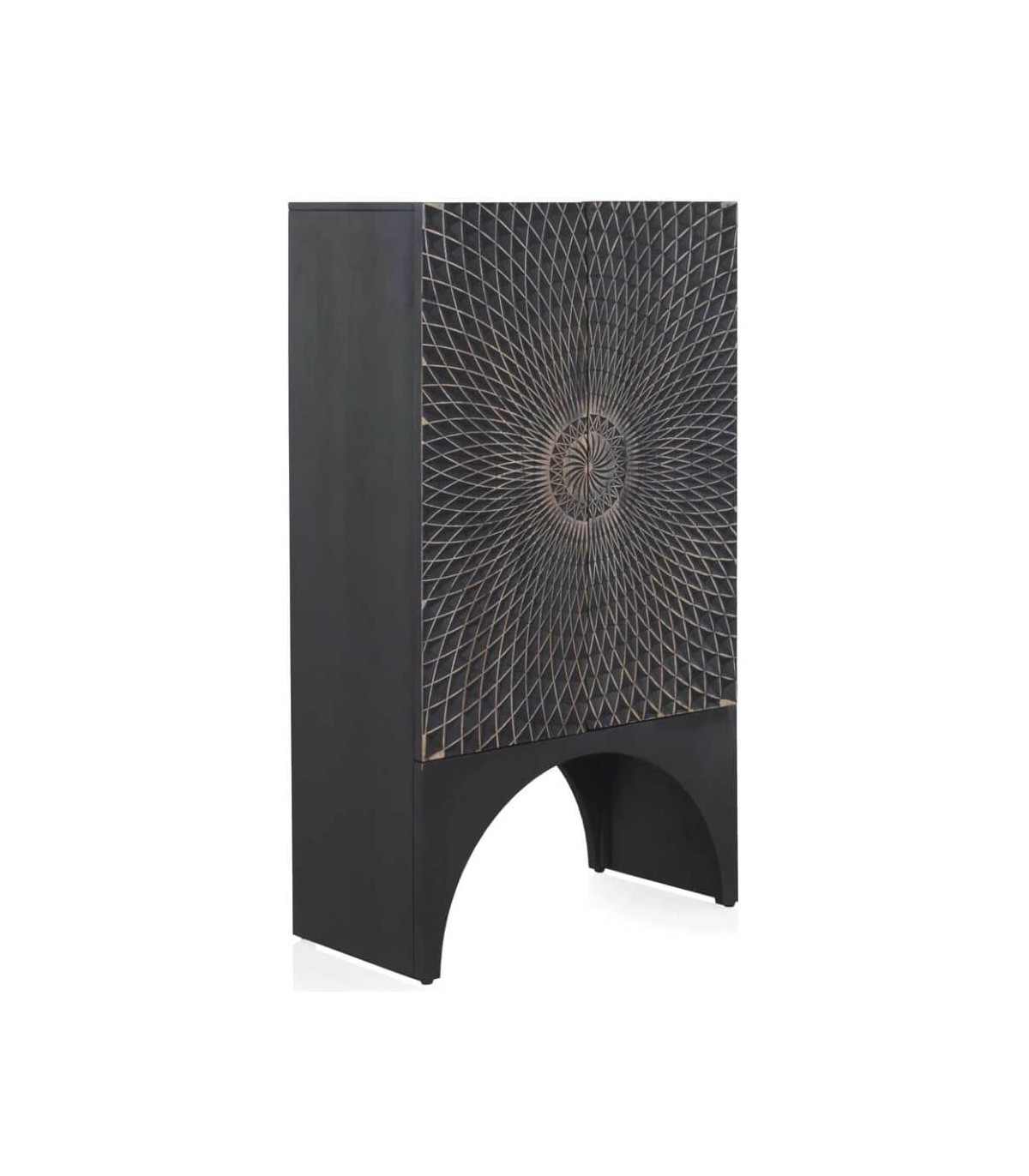 Armario realizado en madera de mango tallado artesanalmente acabado en negro. Un mueble de capacidad con un gran trabajo decorativo, un mueble singular que encaja muy bien en cualquier decoración.