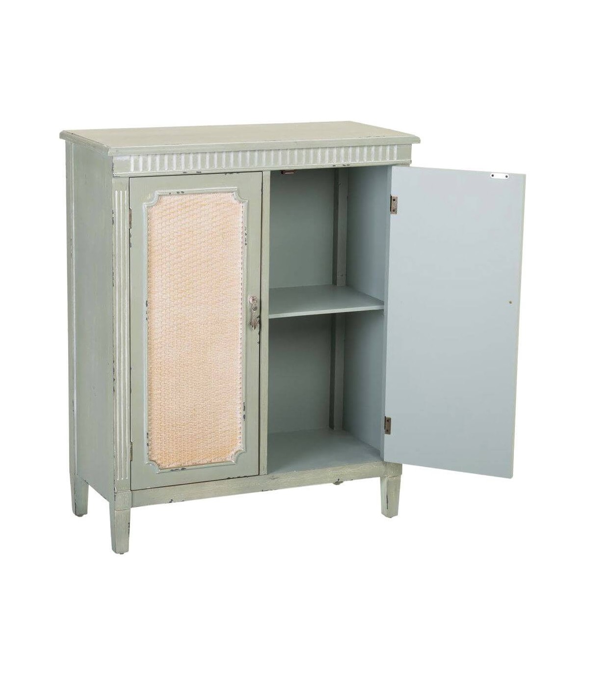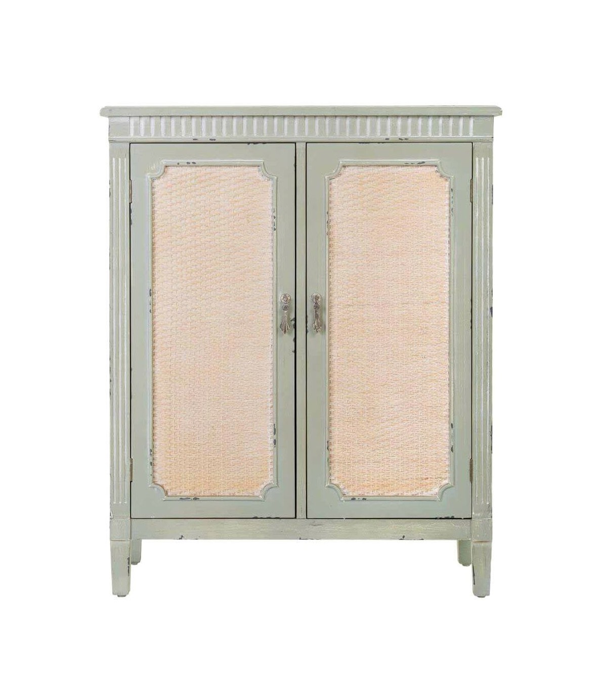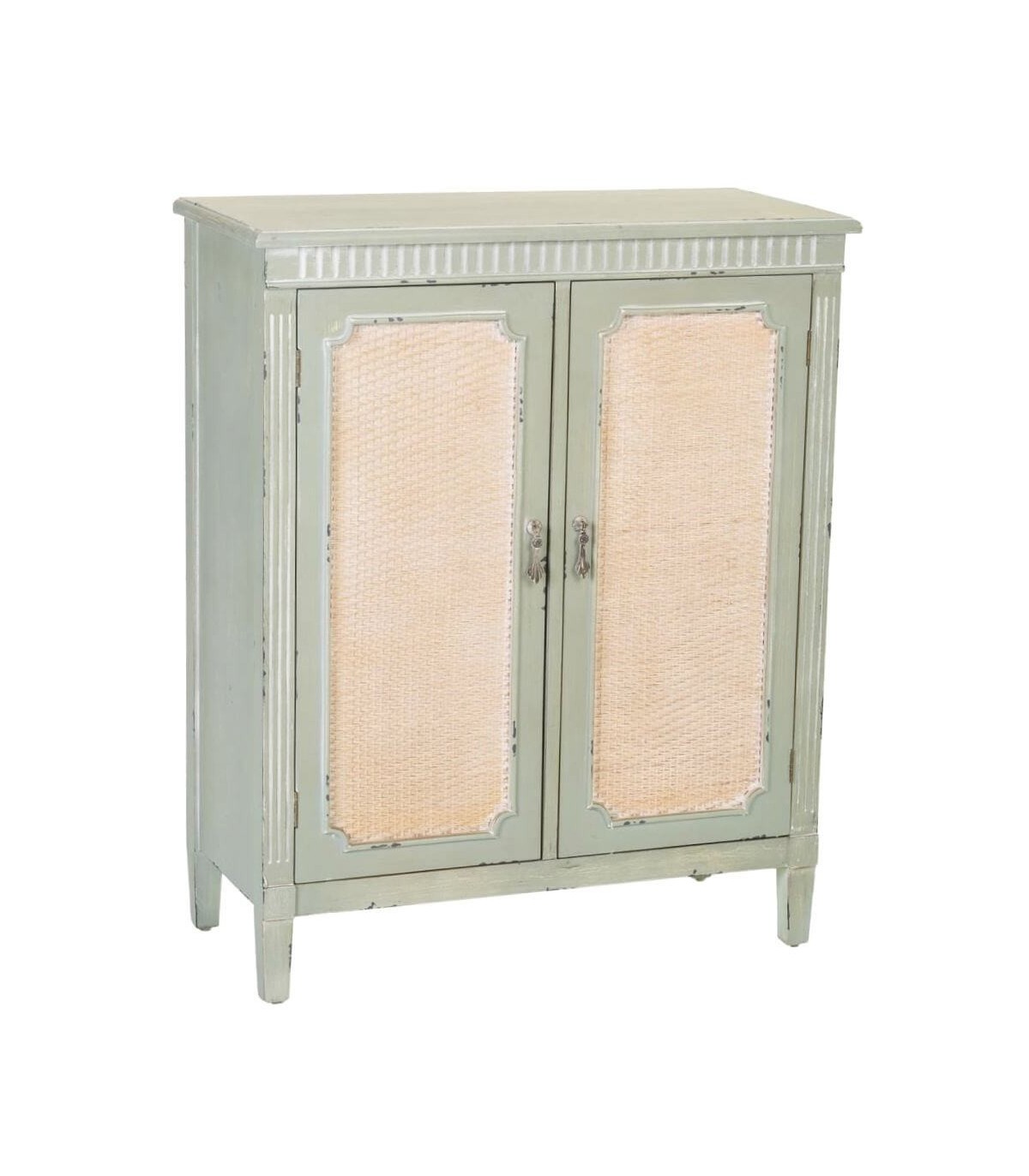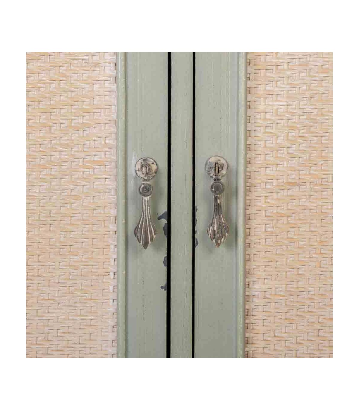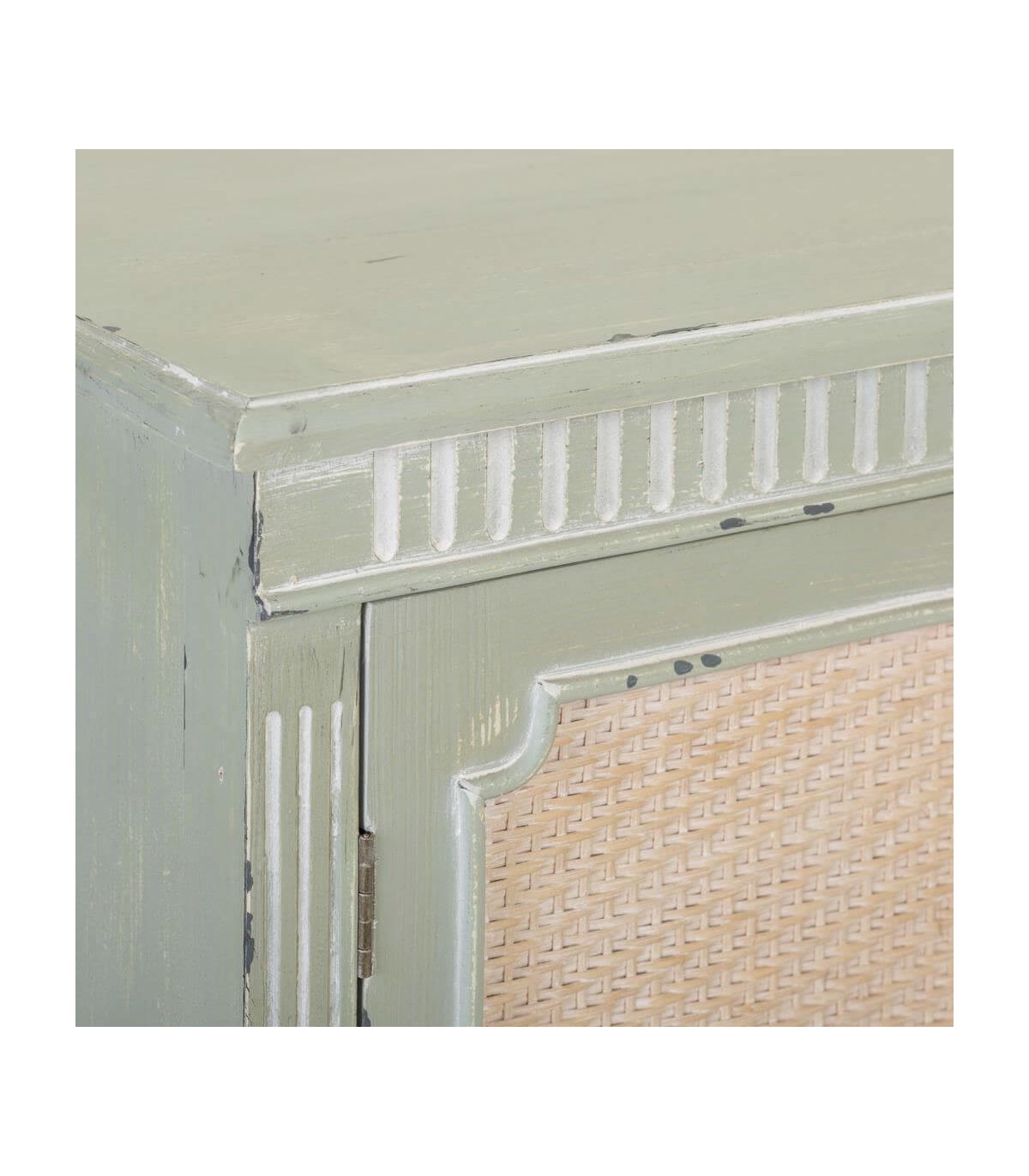 Acabado, artesanal, madera con detalles tallados a mano lacada en verde musgo vintage, ratán natural, tiradores bronce.