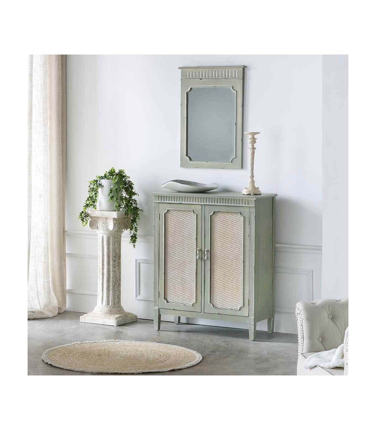 Taquillón de nuestra colección Solea. Una colección de aires clásicos con un toque vintage, realizada en verde o blanco vintage de manera artesanal lo que le da un plus de autenticidad, el ratán y la talla la enriquece, perfecta para tu dormitorio, tu salón o como muebles auxiliares.