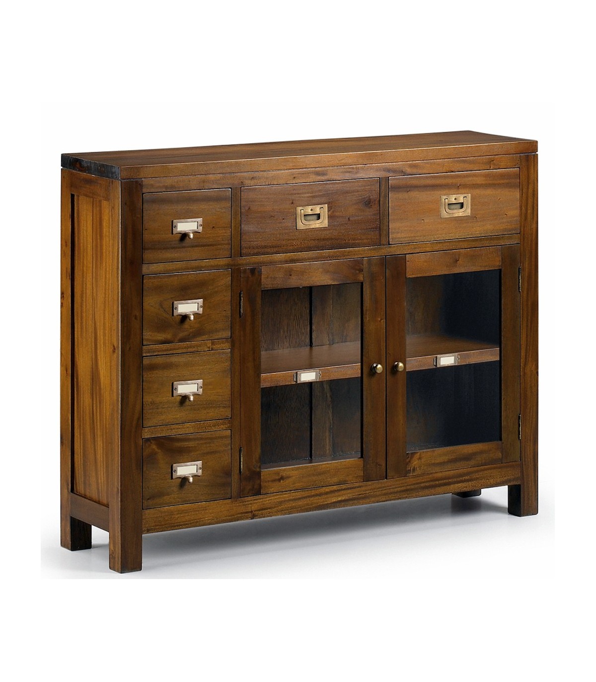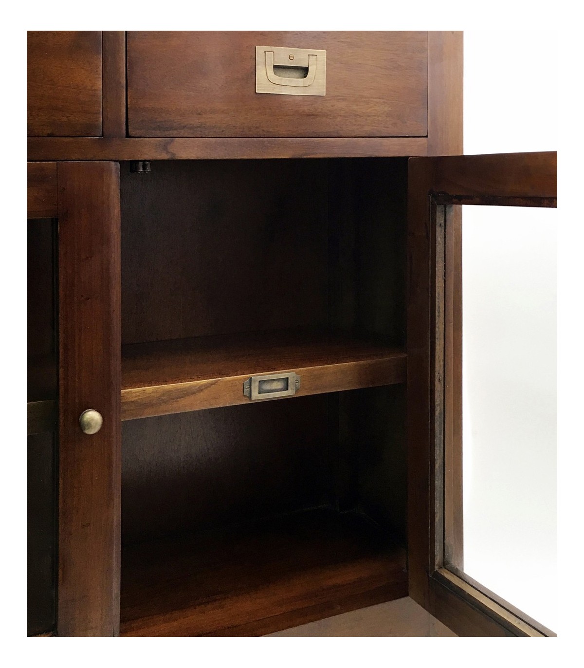 - Consola, 4 cajones pequeños, 2 cajones medianos, 2 puertas de cristal, estilo colonial.