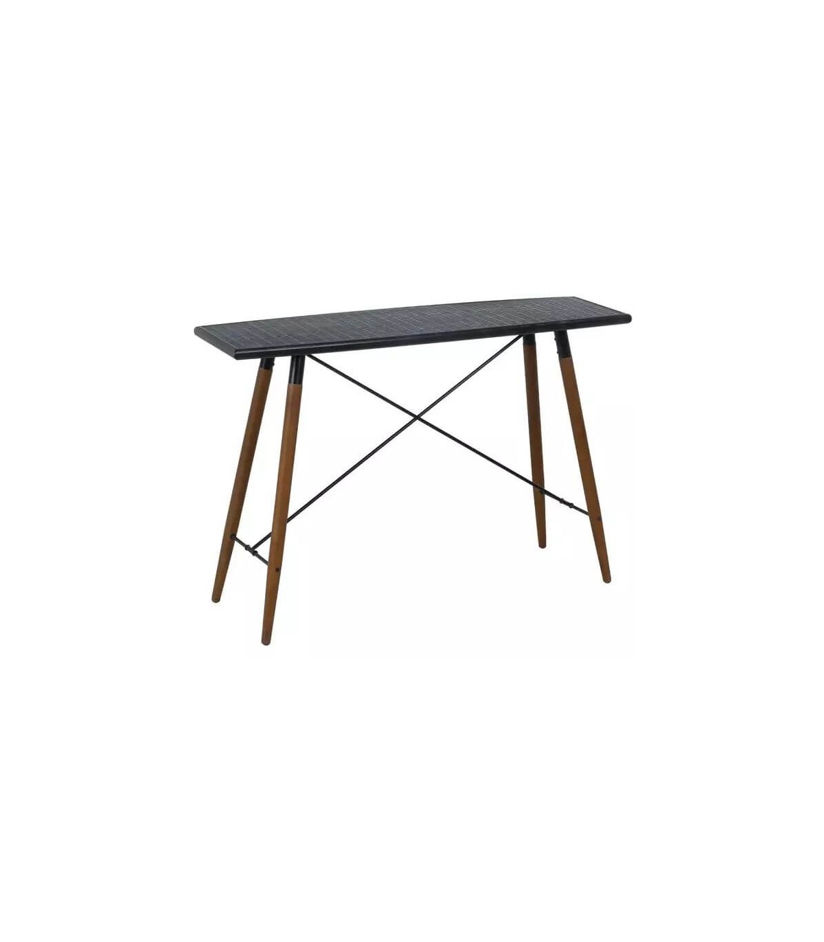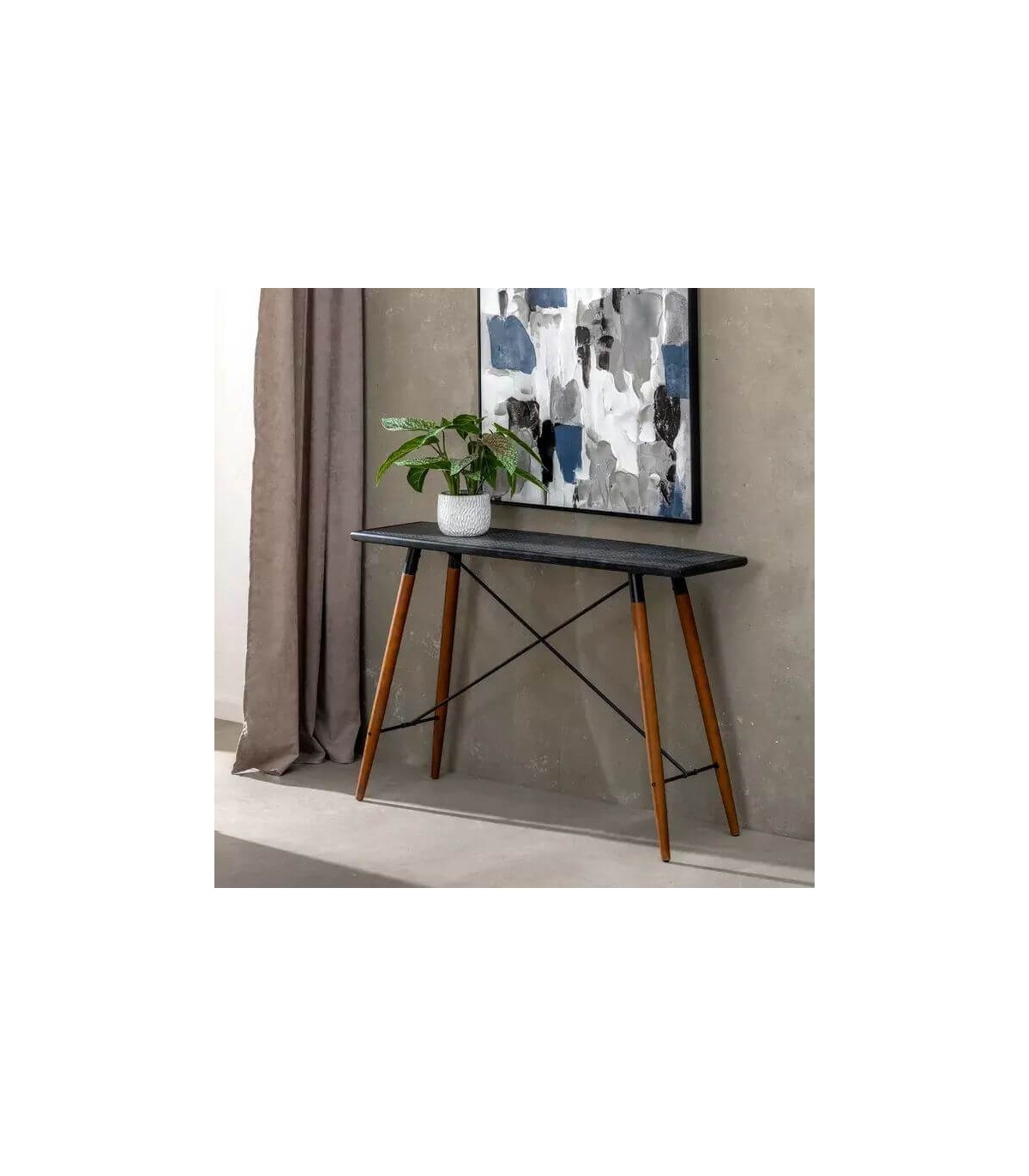 Consola sencilla con las patas en madera teñida color cerezo y la tapa en metal negro, de estilo industrial, una consola ligera que viste mucho.