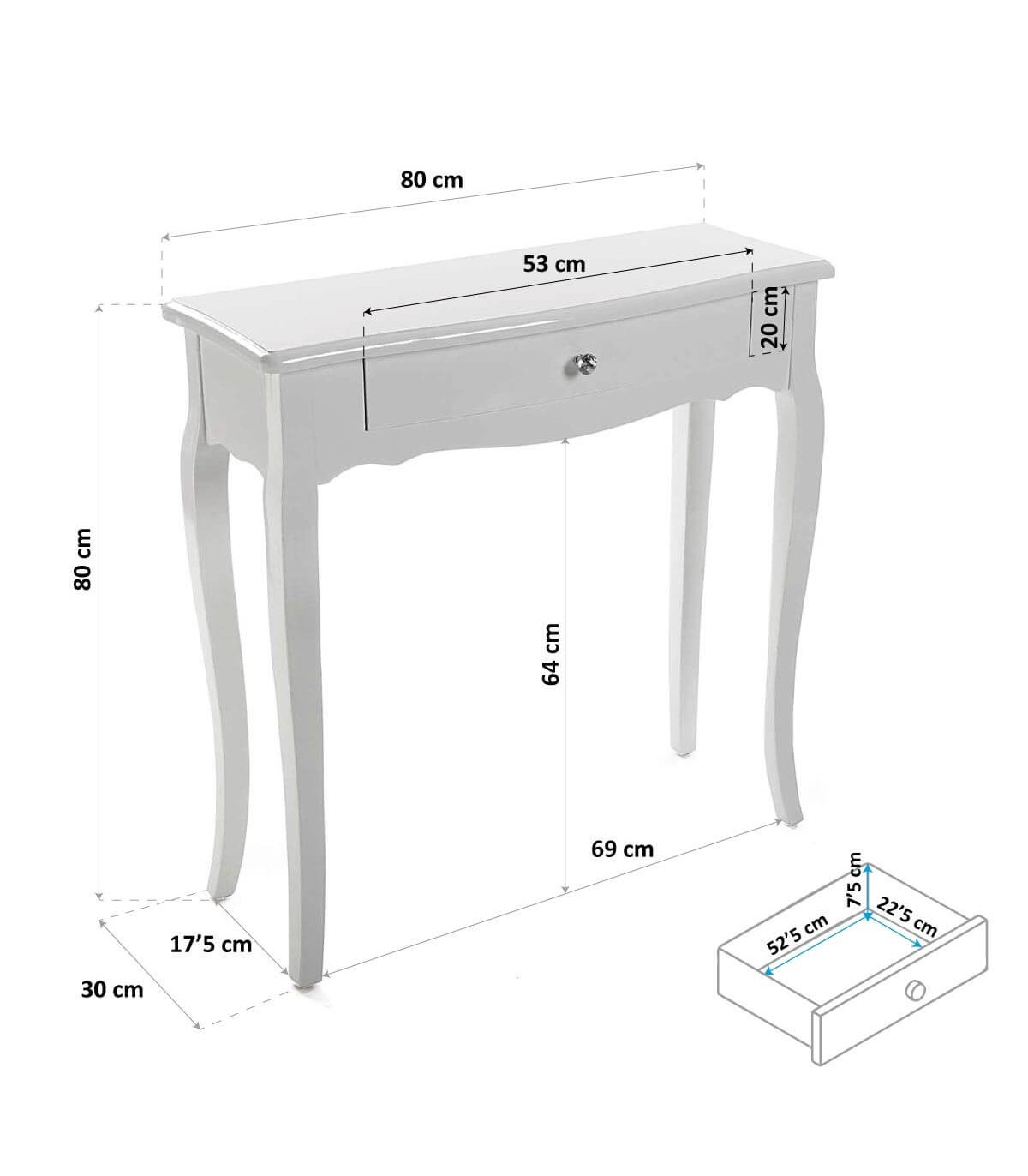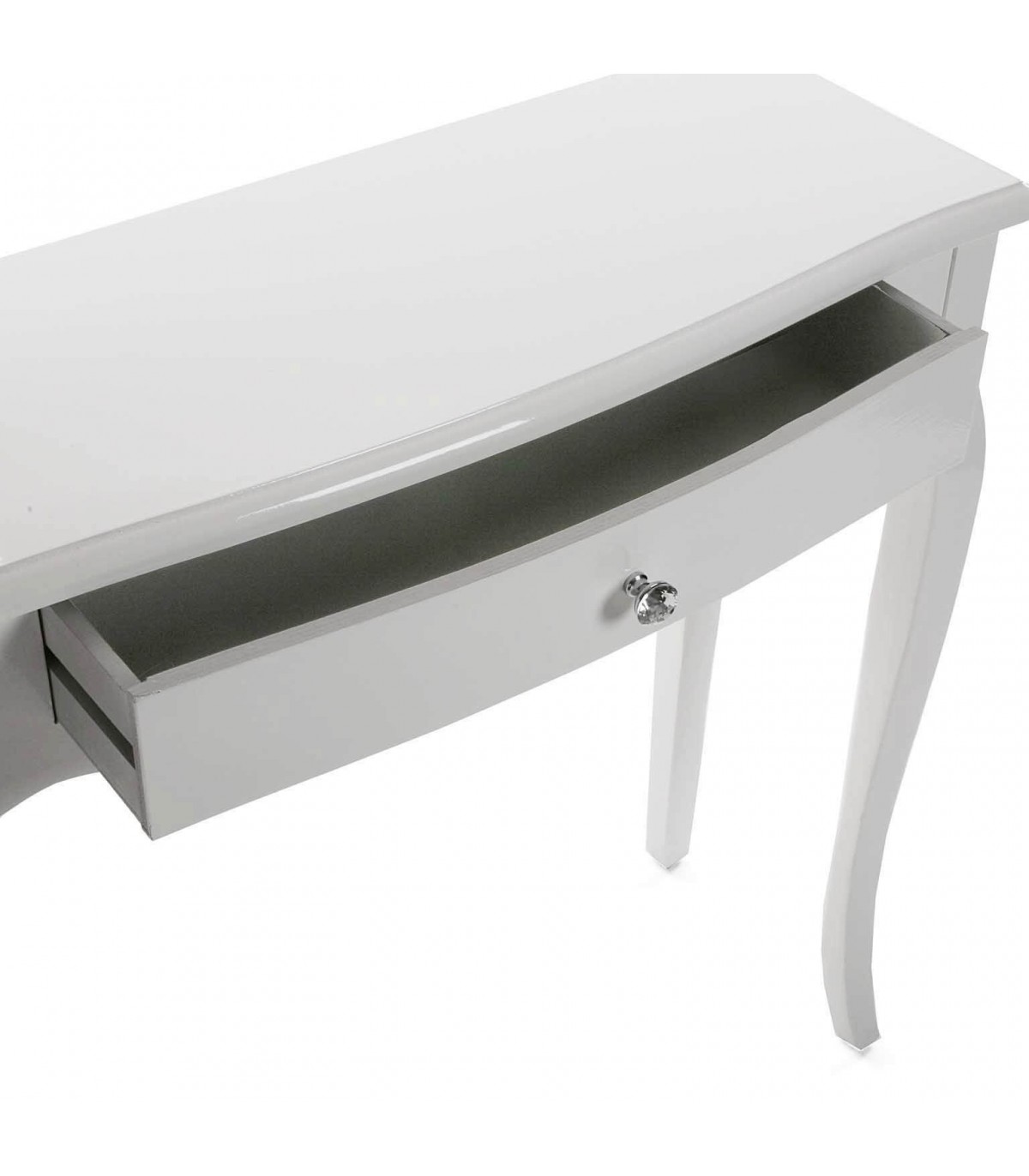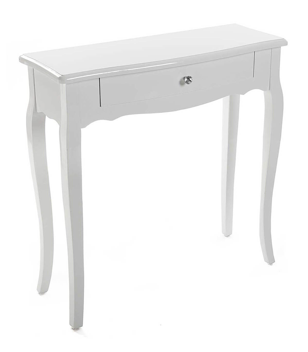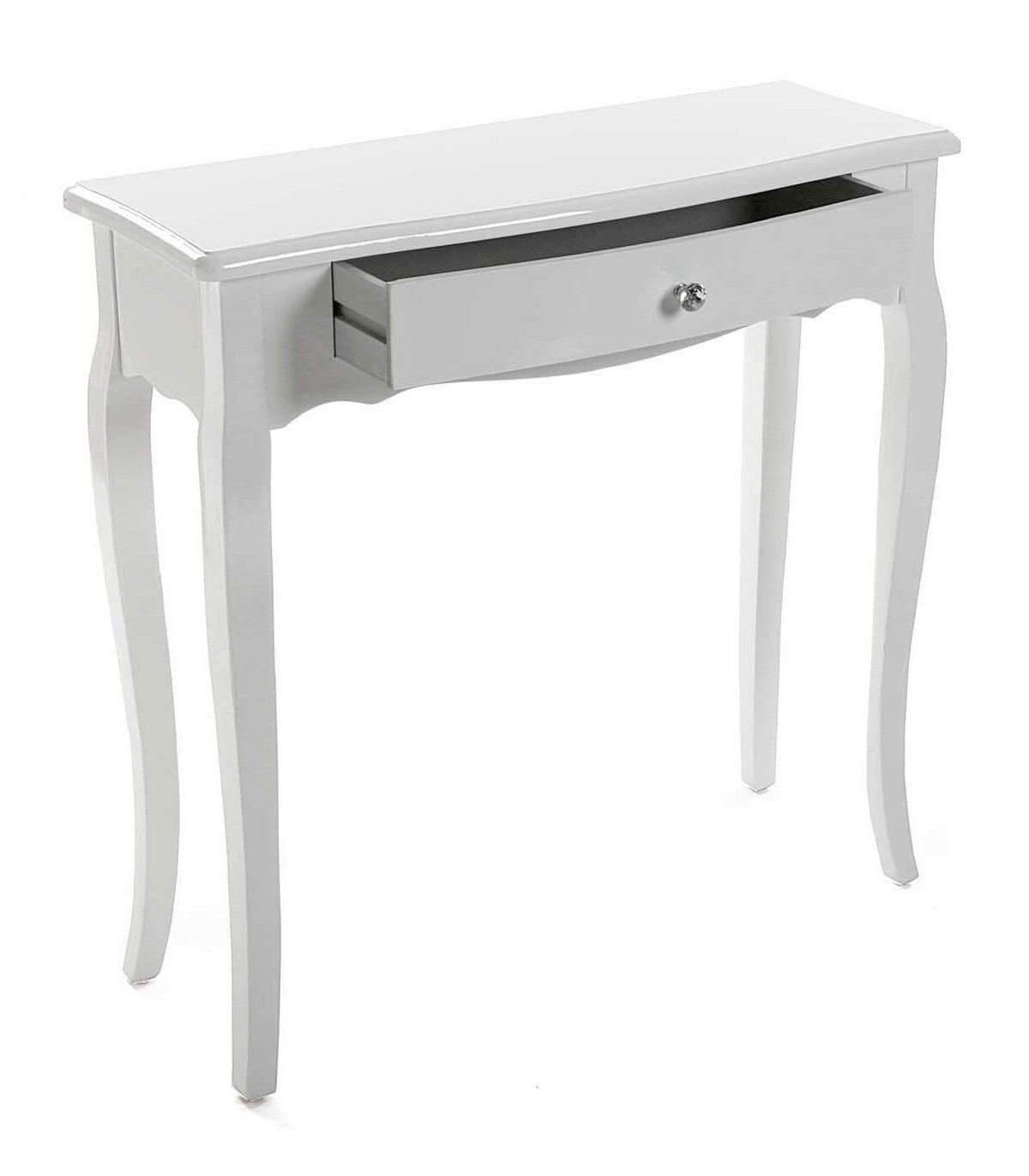 Consola con 1 cajón, realizada en madera lacada en blanco, con los tiradores en cristal tallado y plata, una de estilo clásico romántico sencilla con la luminosidad que aporta el lacado en blanco.