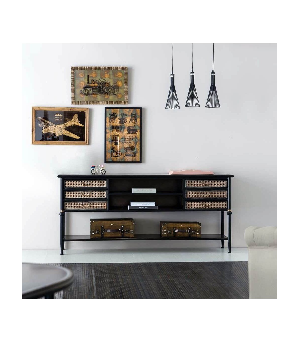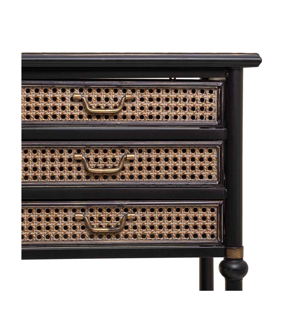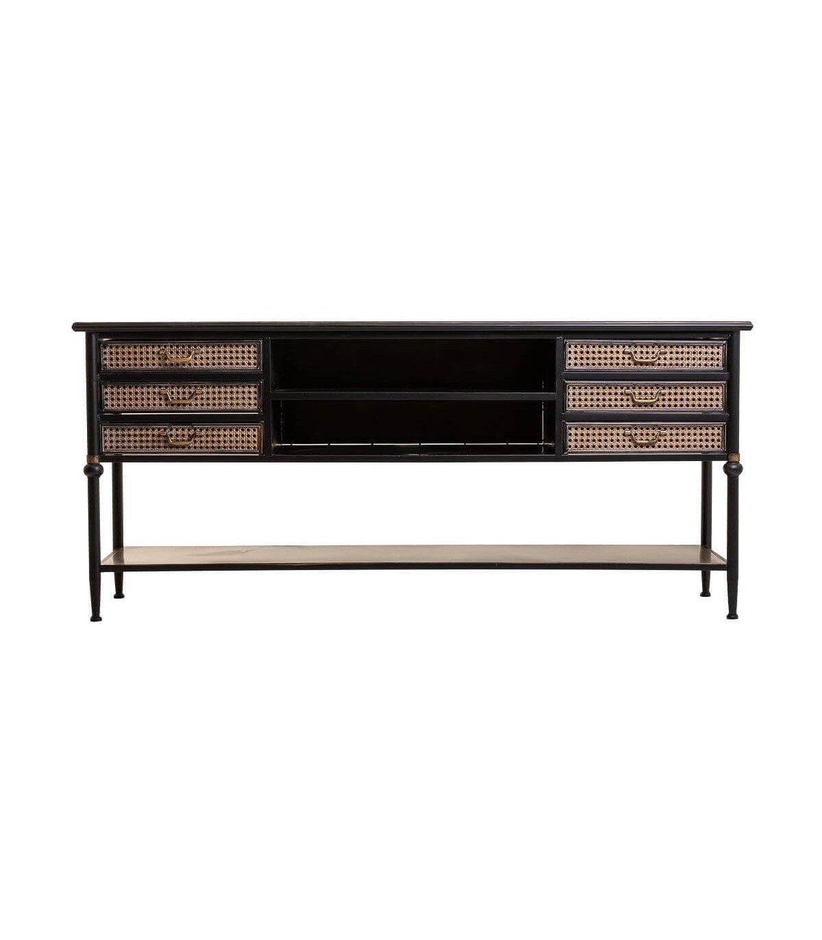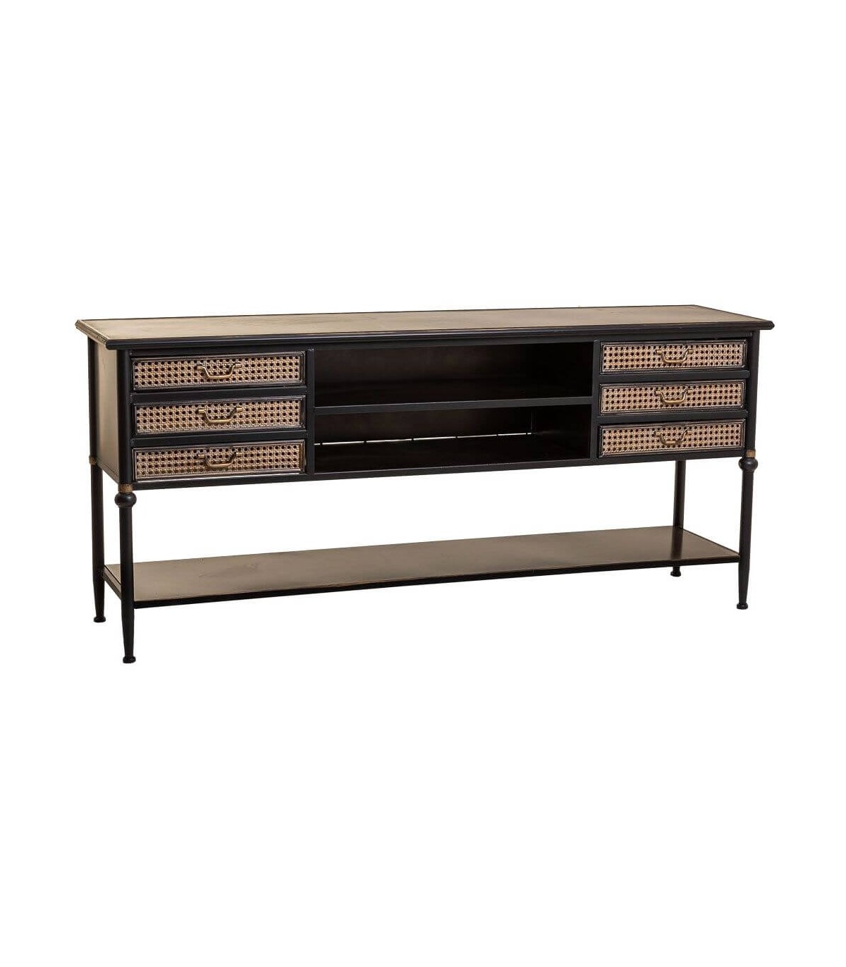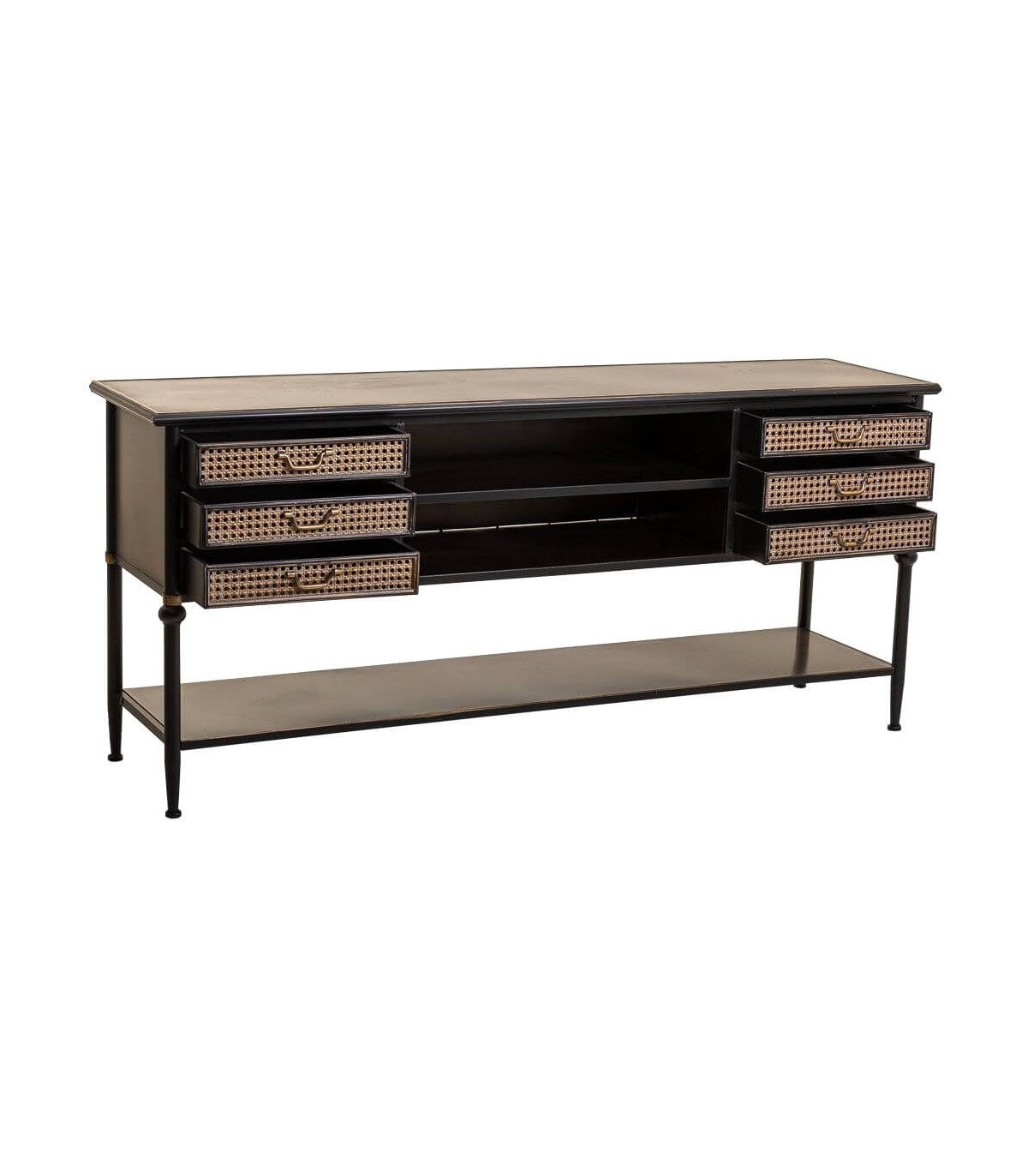 Consola de nuestra colección de muebles Alka, una colección a caballo entre el estilo industrial y el estilo colonial, realizada en metal, jugando con la estructura en acabado negro y detalles de frentes en oro viejo imitando ratán, una colección muy robusta y decorativa, un mueble hecho para durar.