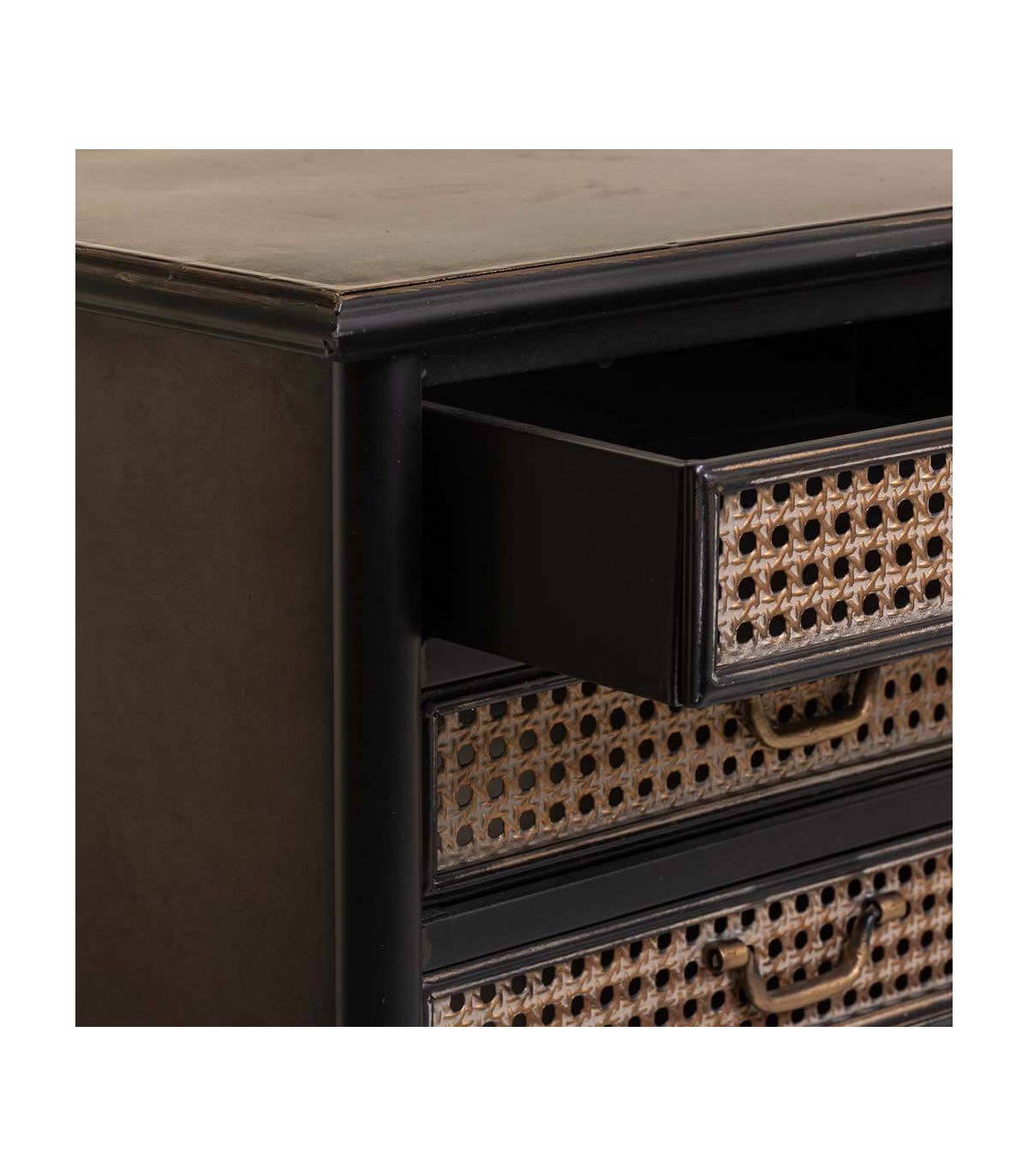 - Acabado, estructura metálica acabado negro, frente puertas y cajones acabado oro viejo.