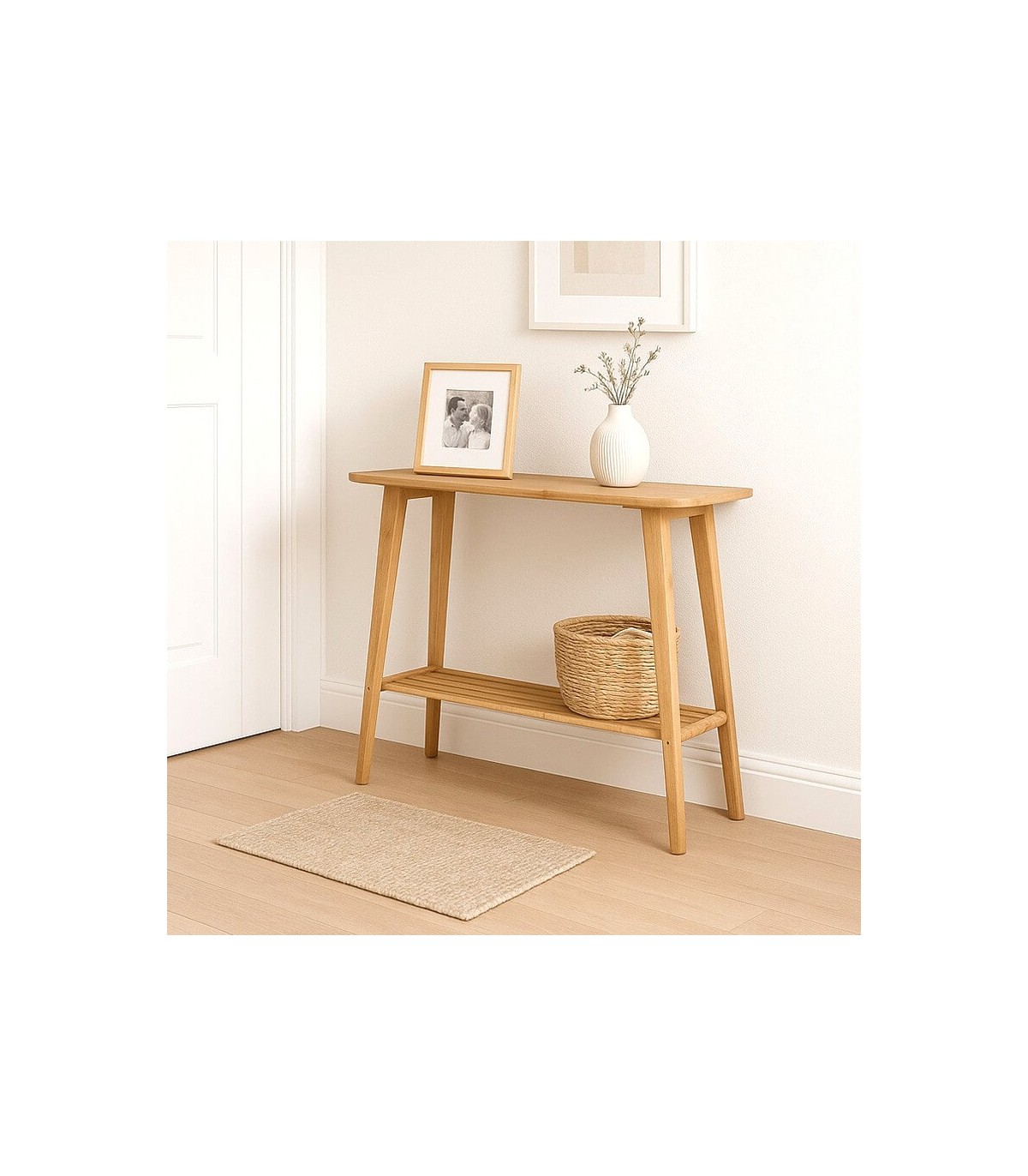 Consola pequeña de líneas ligeras y proporciones equilibradas que transmite serenidad y naturalidad en el ambiente. Su diseño limpio refleja la esencia del estilo nórdico, donde la funcionalidad se une a la belleza simple de la madera clara.