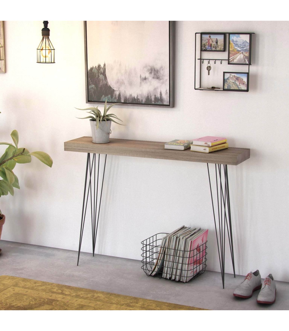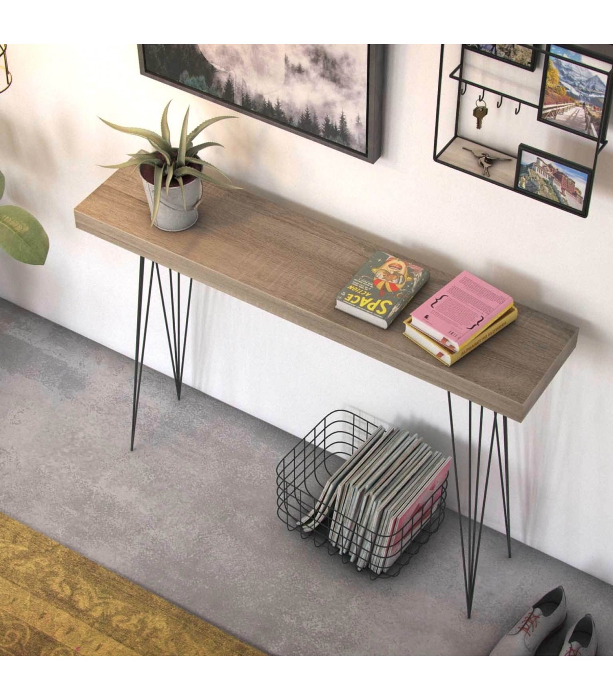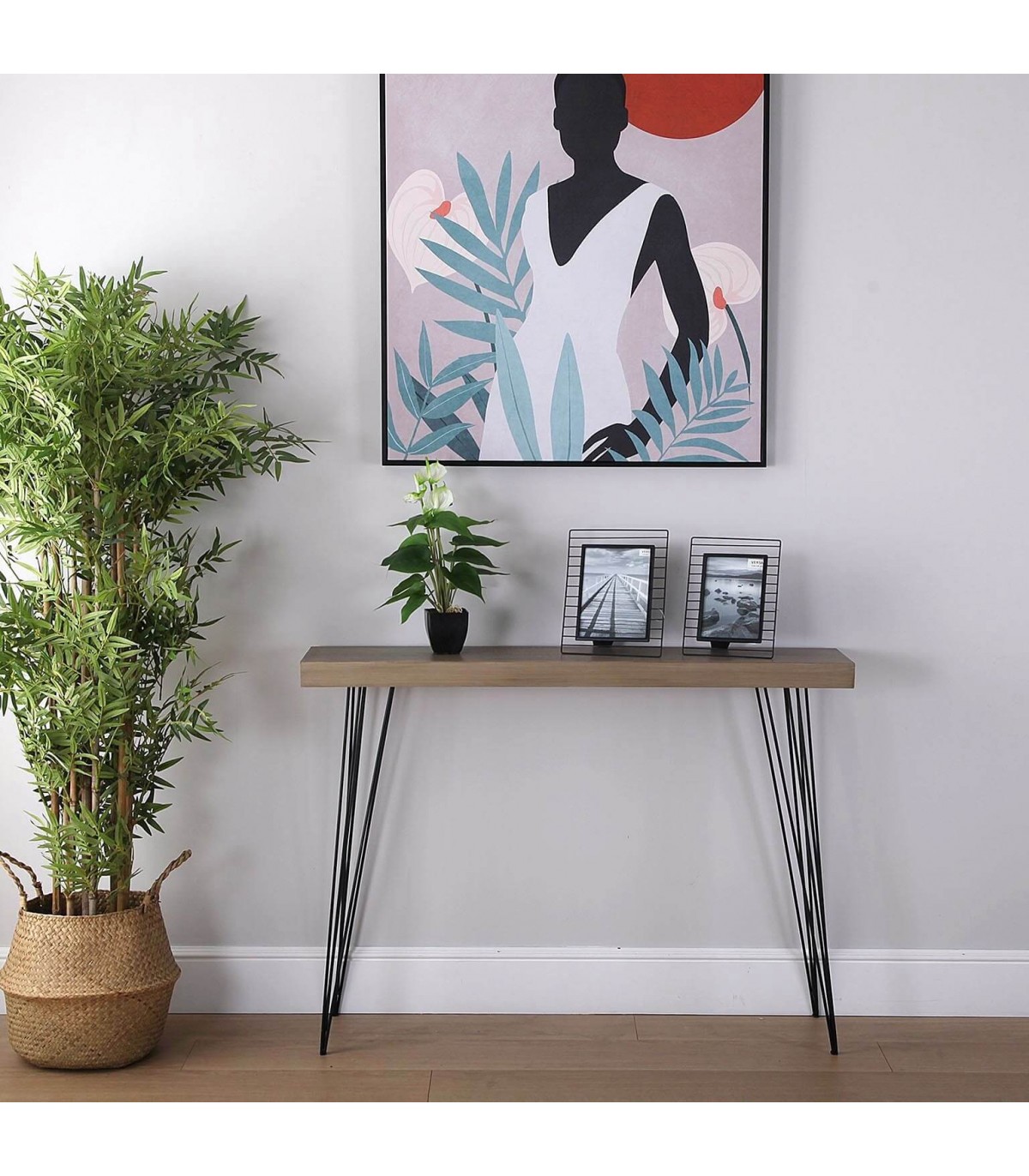 Consola de entrada de estilo industrial, realizada en metal negro y madera imitación roble, una consola ligera pero con mucha presencia, perfecta para tu entrada.
