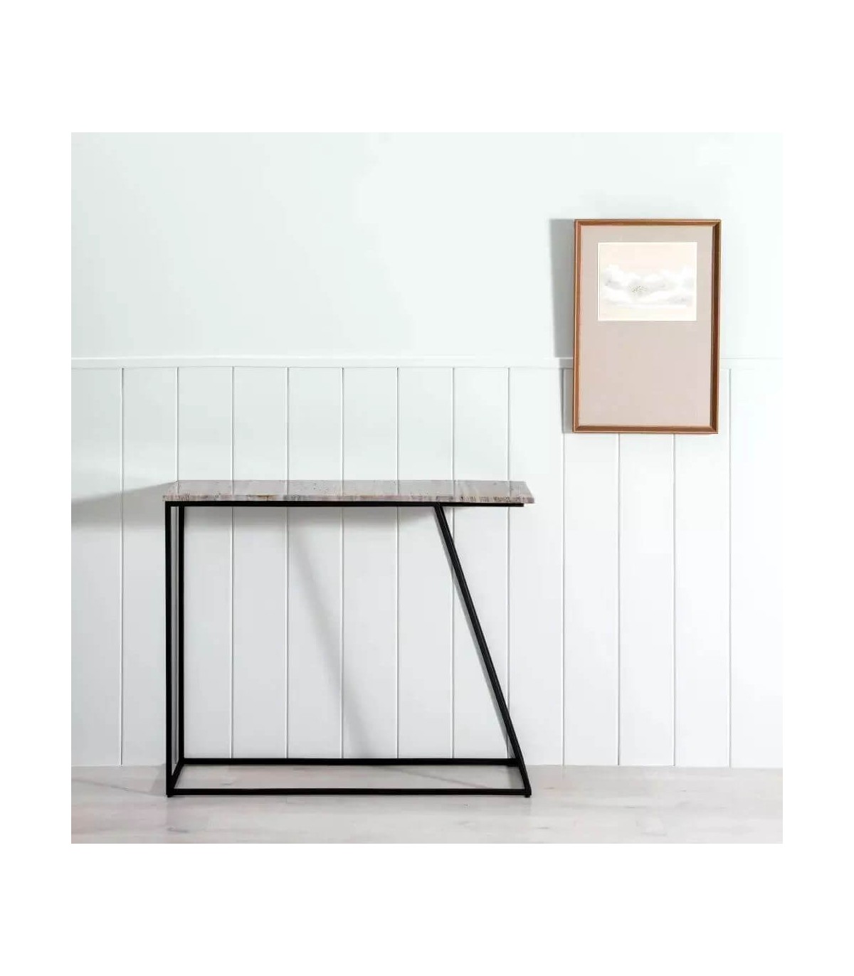 Consola de entrada realizada en metal negro con la tapa en mármol de color topo, una consola de entrada muy original y decorativa, perfecta para tu entrada.