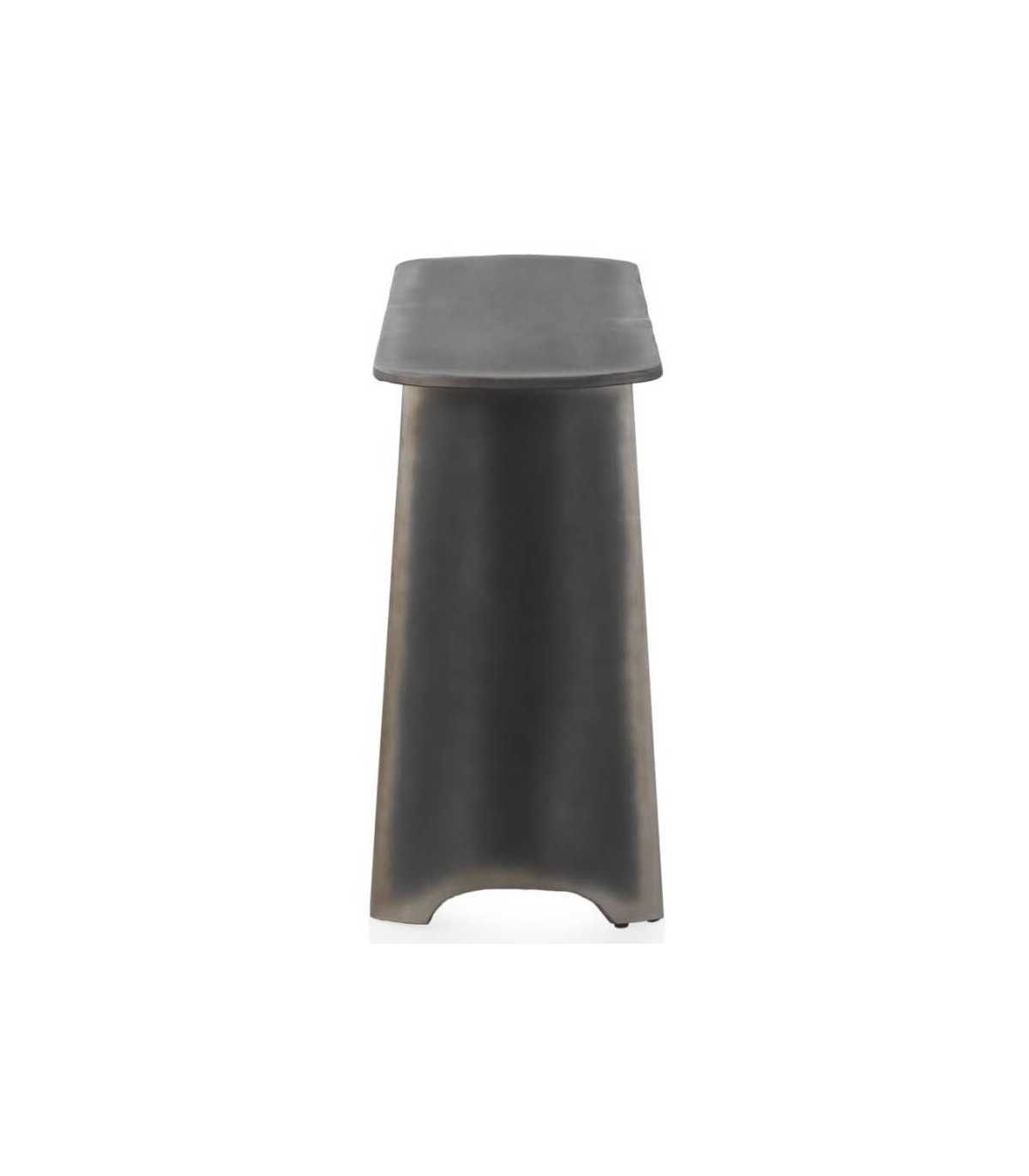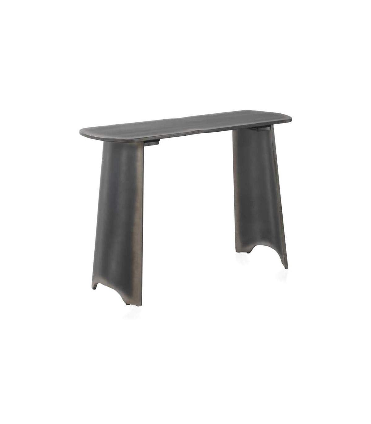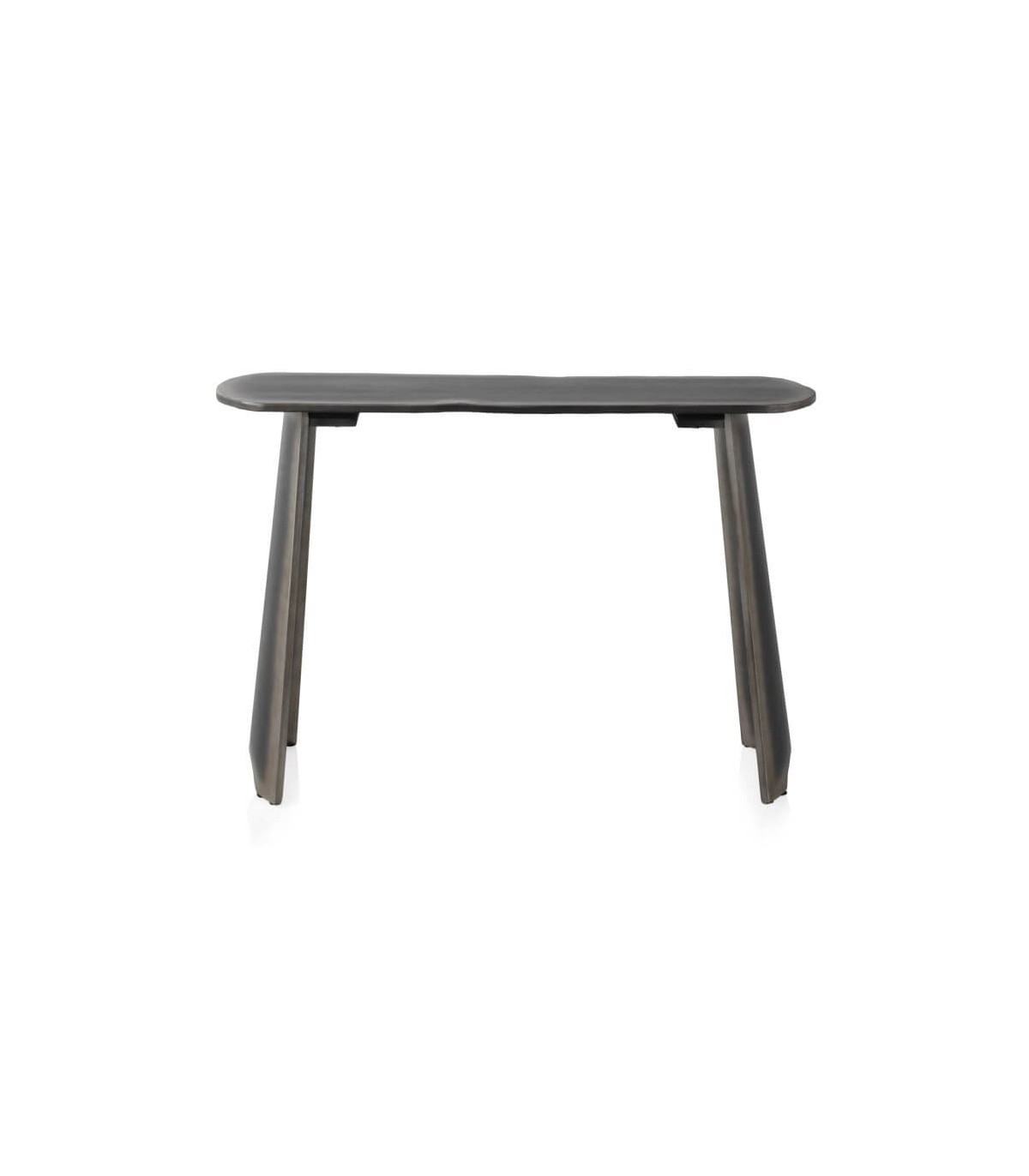 Consola de entrada muy original realizada en madera imitando metal lacada en gris envejecido, con formas irregulares, un toque especial de estilo industrial para tu entrada.