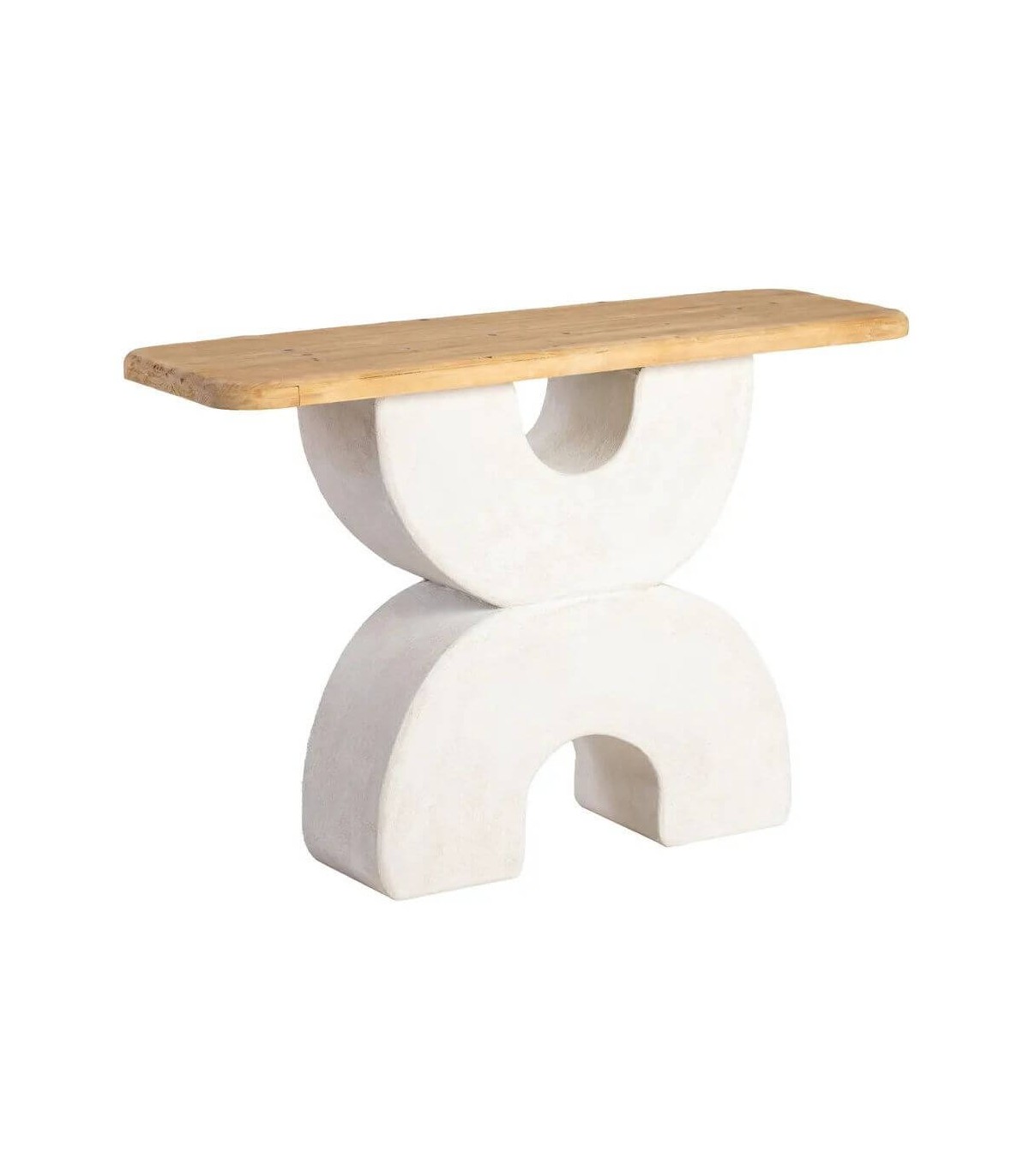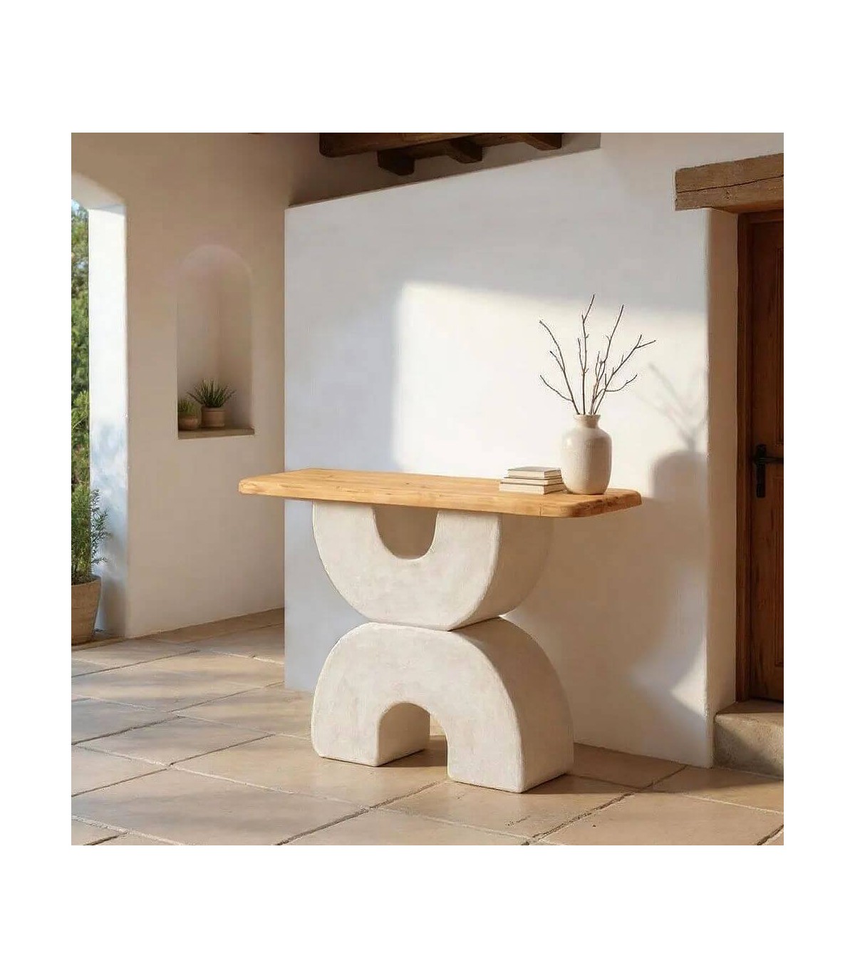 Esta consola de entrada aporta ligereza, calma y naturalidad al ambiente gracias a su diseño inspirado en la arquitectura mediterránea. Su estructura blanca efecto yeso recuerda a los muros encalados de las casas ibicencas, mientras que la tapa en madera natural suaviza y equilibra el conjunto con un toque acogedor.