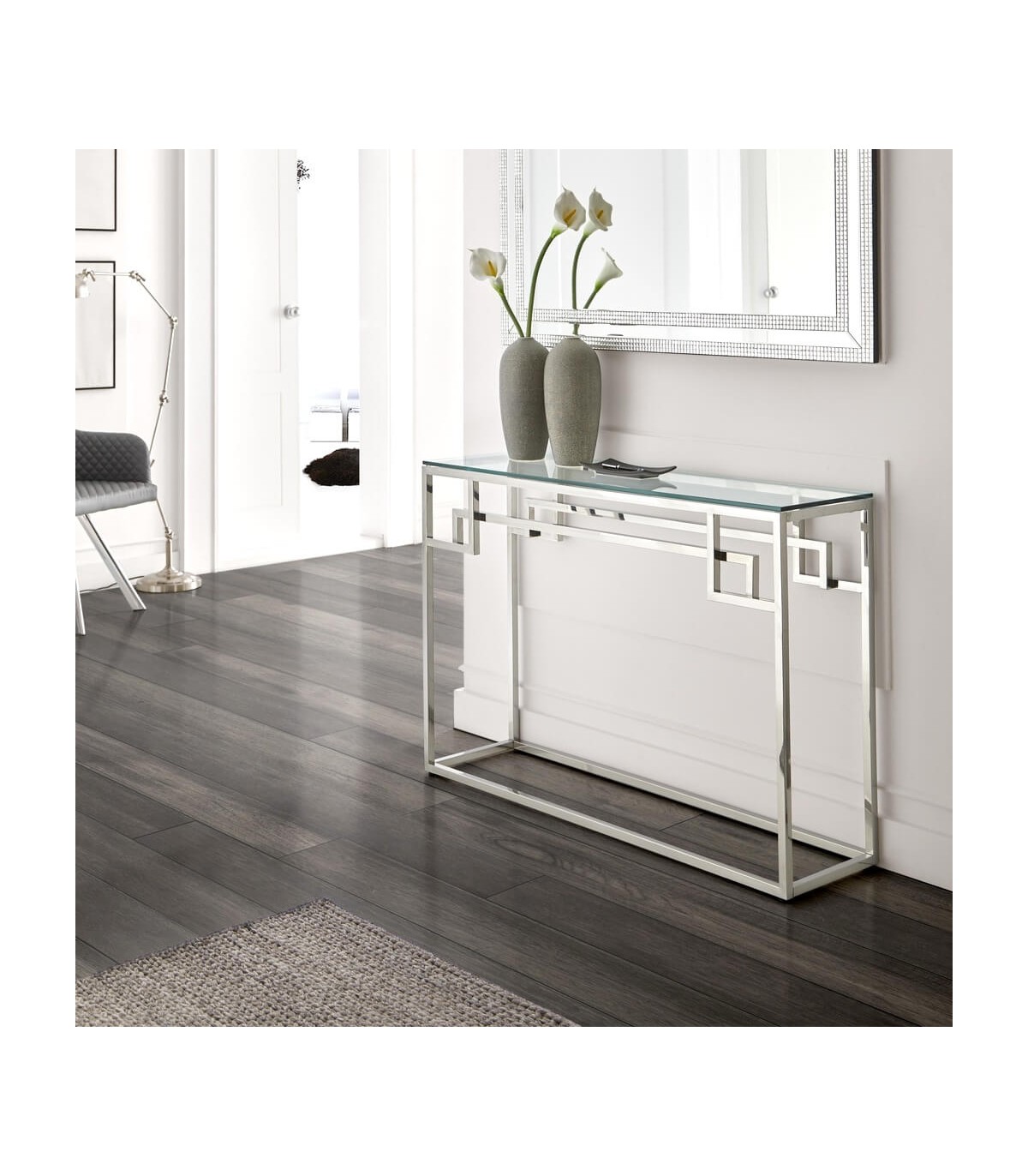 Consola de entrada realizada en acero inoxidable cromado y cristal templado, una consola ligera visualmente, perfecta para combinar con muchos estilos de decoración y para lucir en una gran entrada.