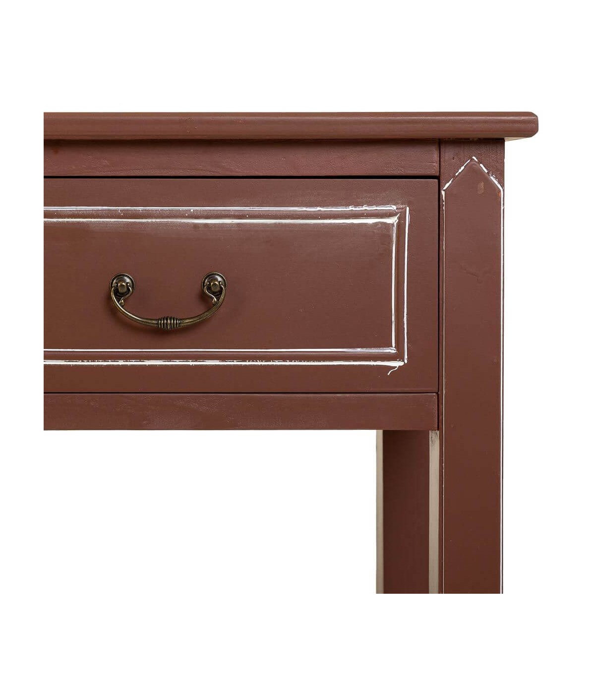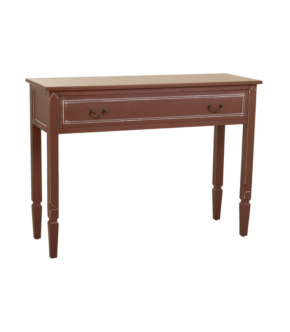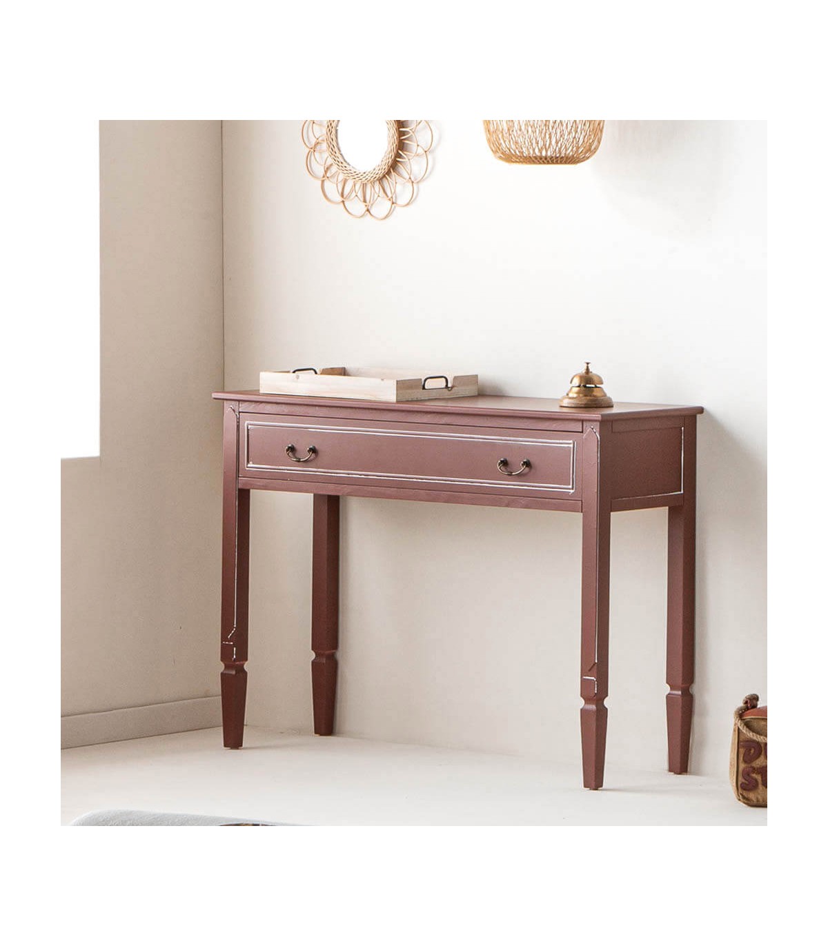 Consola de entrada realizada en madera de pino pintada en marrón con una pátina blanca para realzar las molduras y 1 práctico cajón, de estilo chic, perfecta para darle color a la entrada.