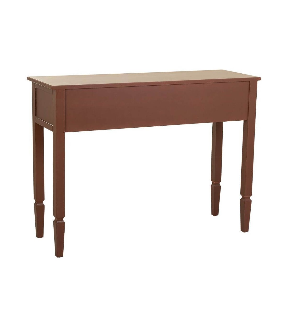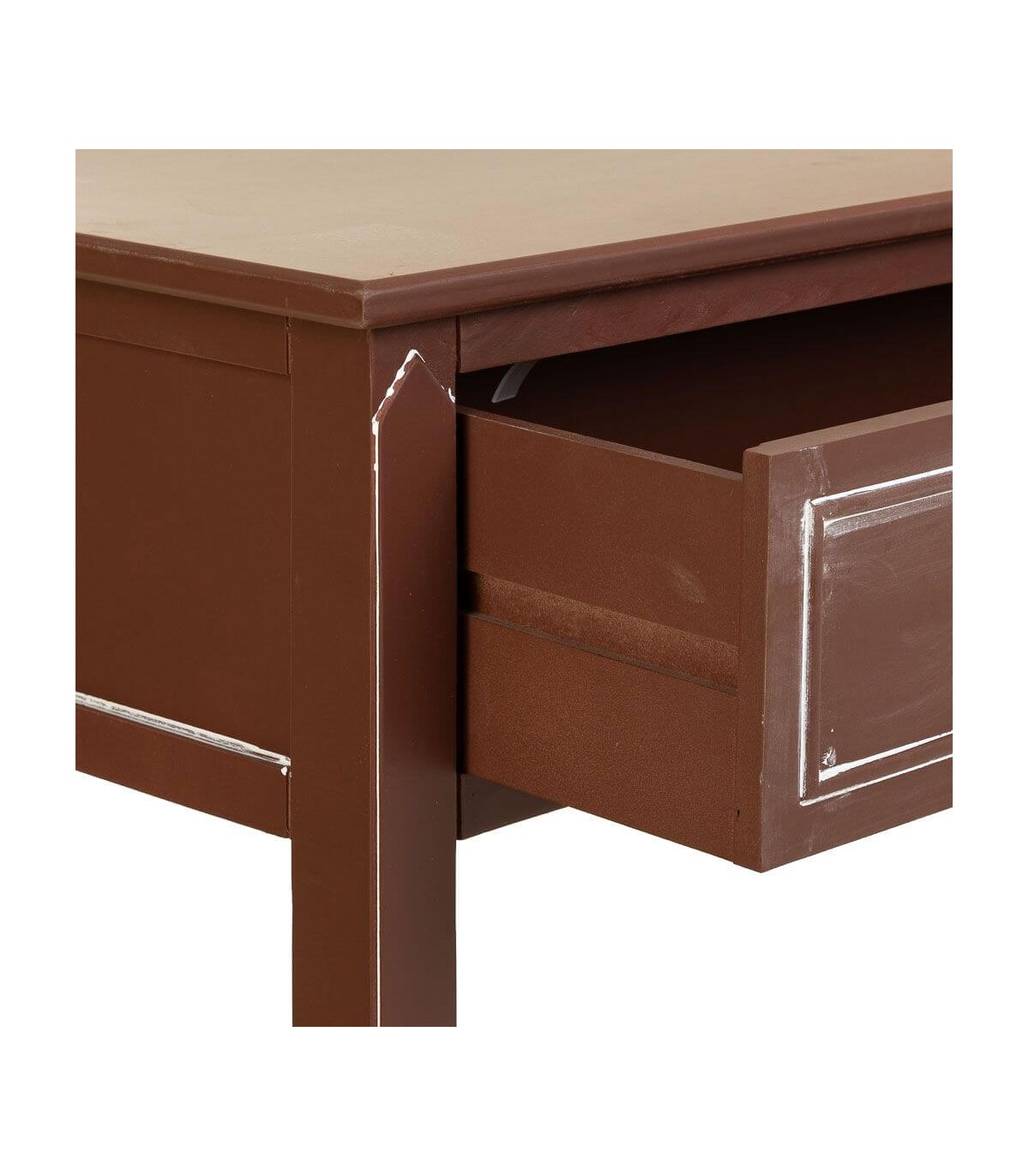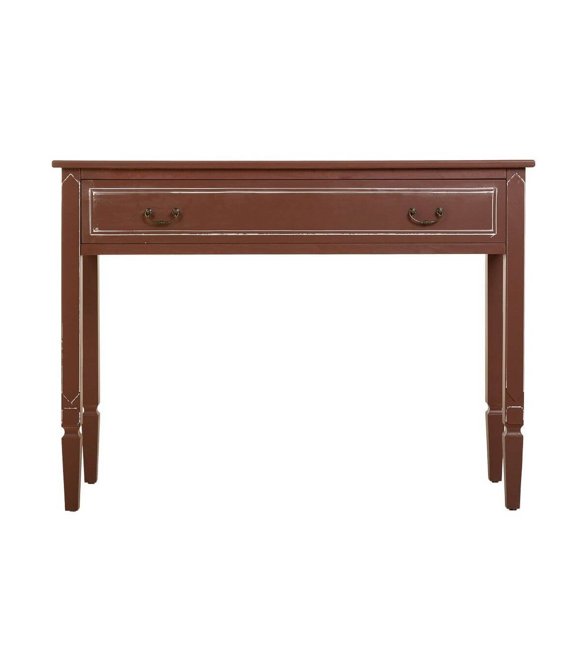 Consola de entrada realizada en madera de pino pintada en marrón con una pátina blanca para realzar las molduras y 1 práctico cajón, de estilo chic, perfecta para darle color a la entrada.