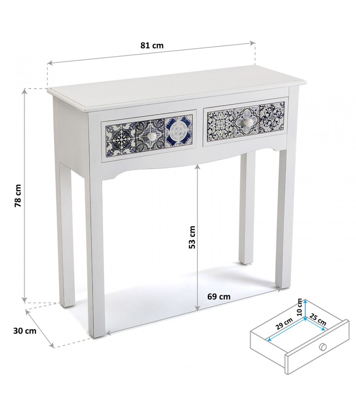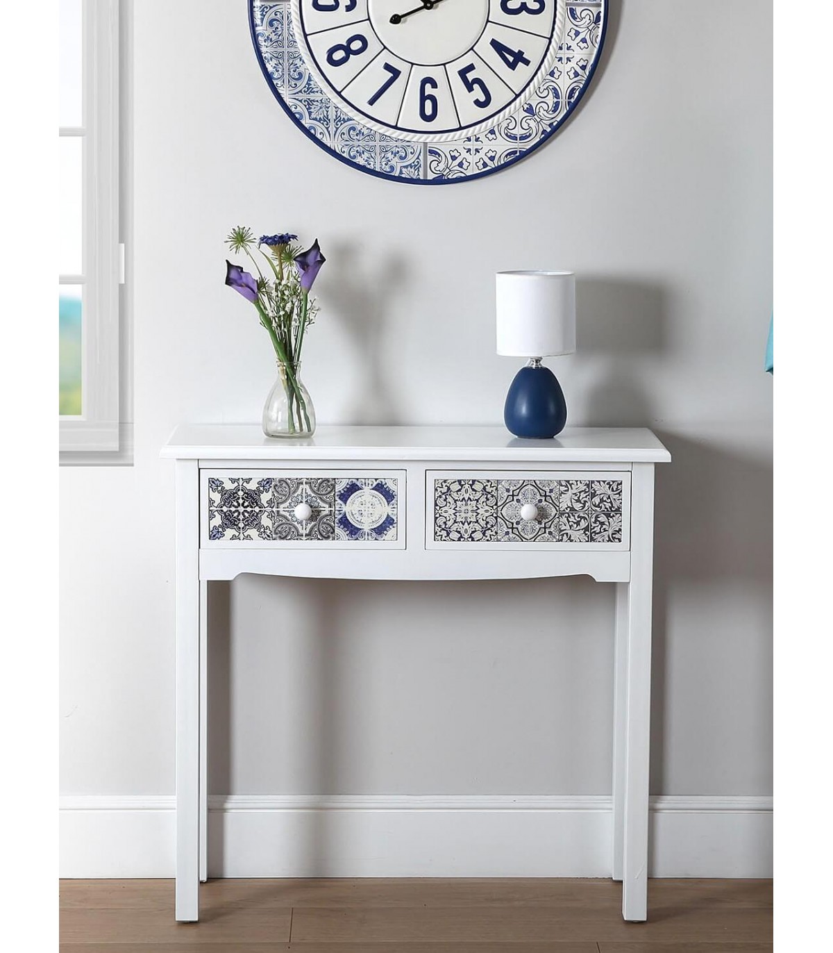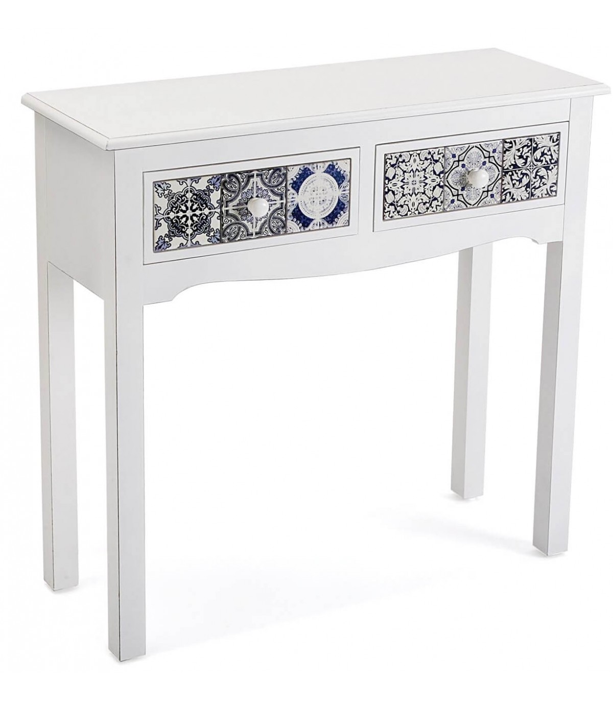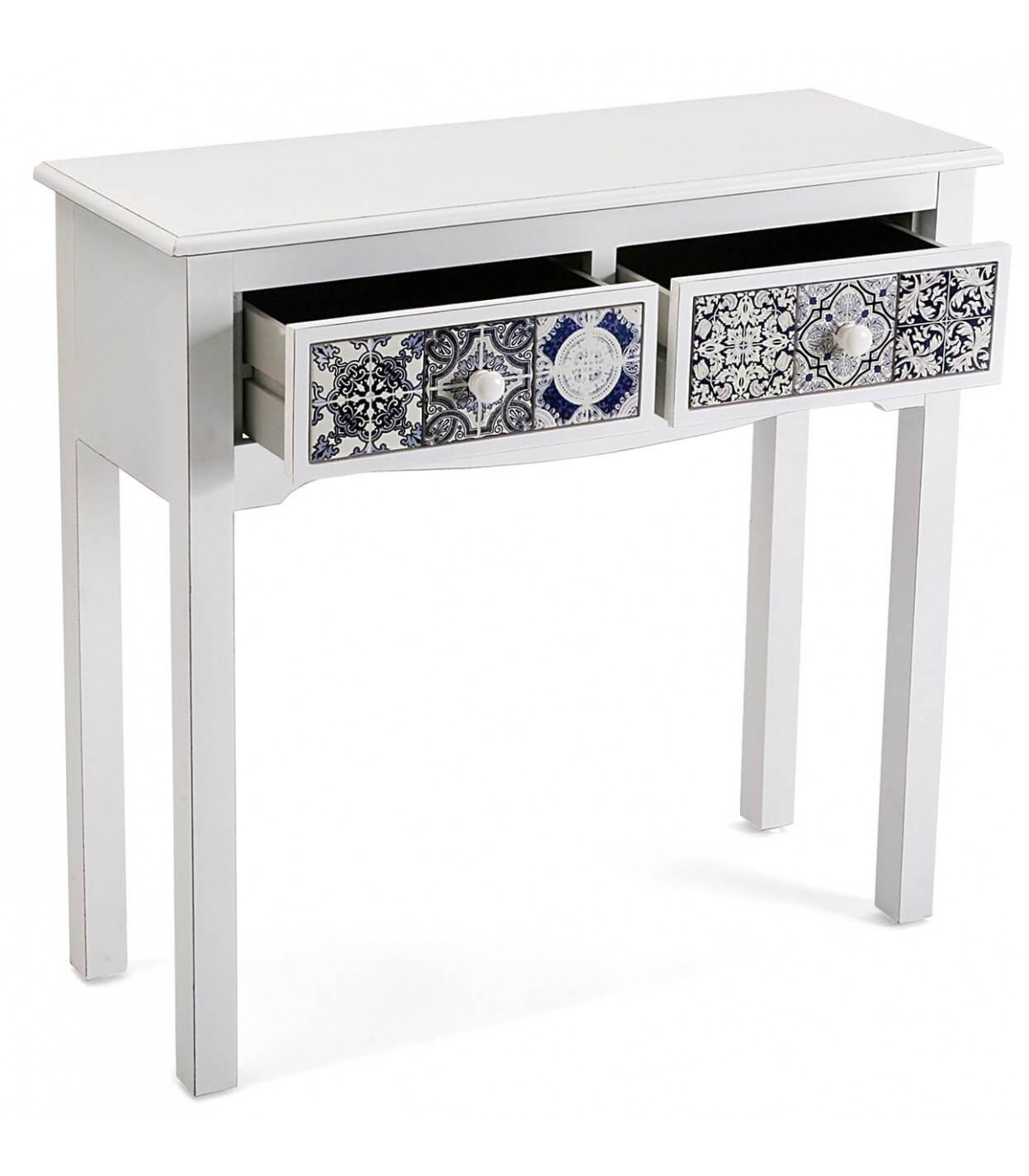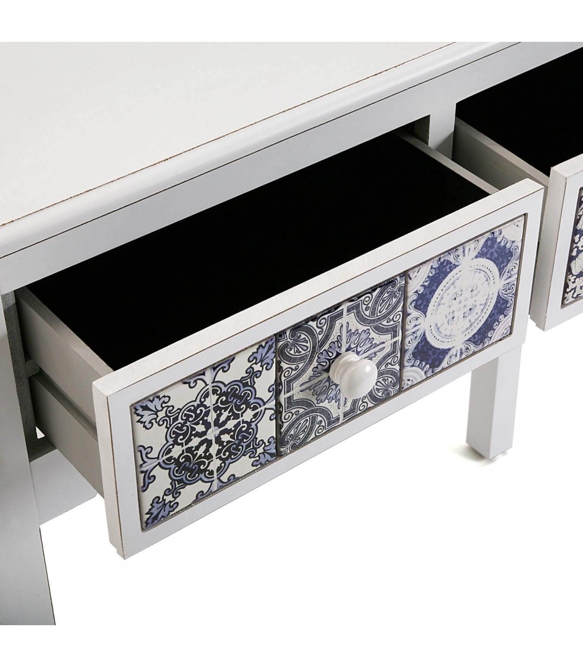Esta consola blanca aporta frescura y carácter gracias a sus cajones decorados con azulejos cerámicos en tonos azul y negro. La estructura estilizada y el diseño limpio contrastan con el rico detalle ornamental de los frontales, creando un efecto visual vibrante y elegante.