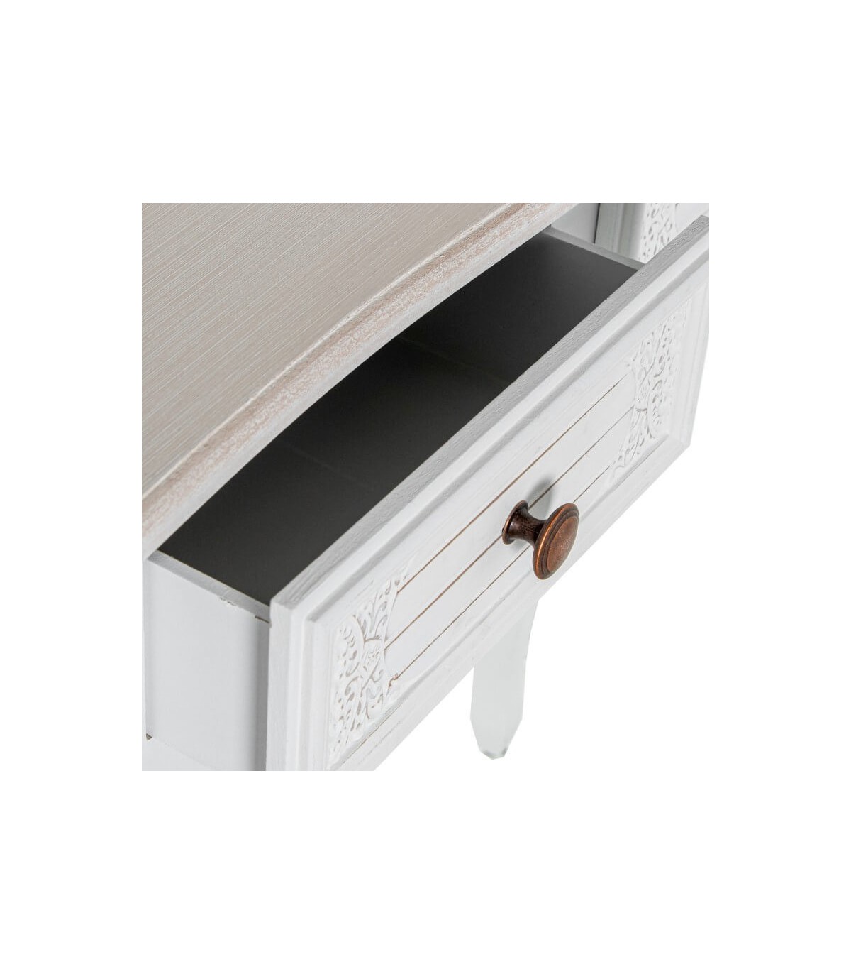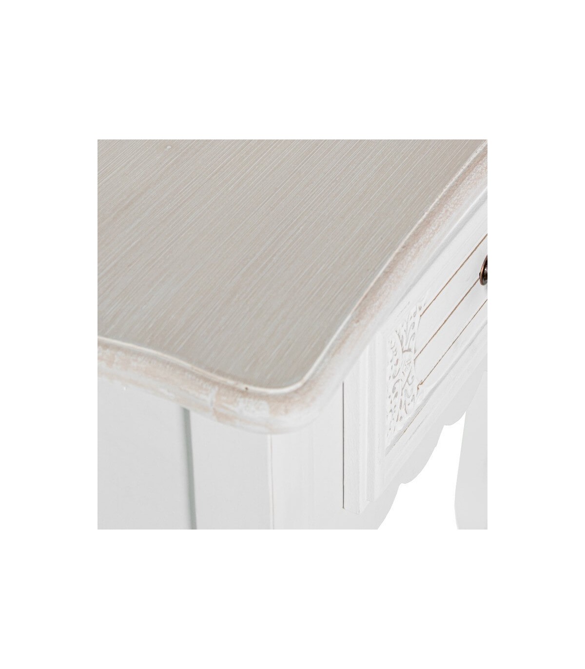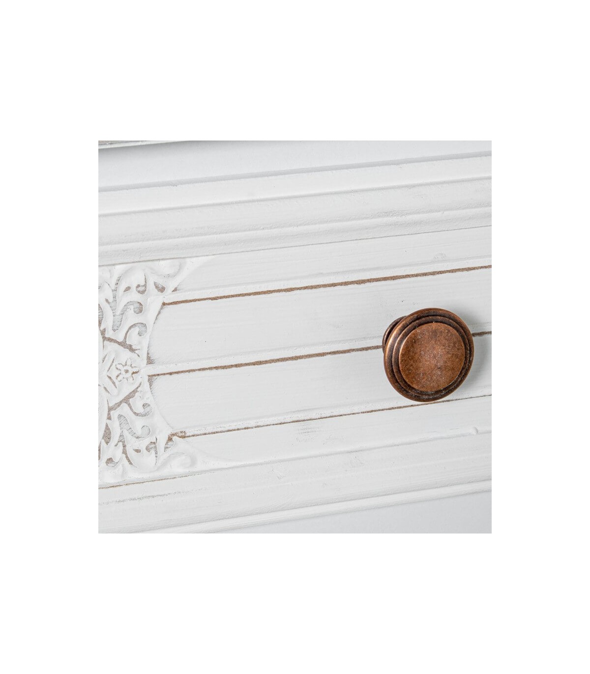 🎨 Acabado: Madera tallada color blanco rozado, tapa color beige patinada en blanco, tiradores metal cobre