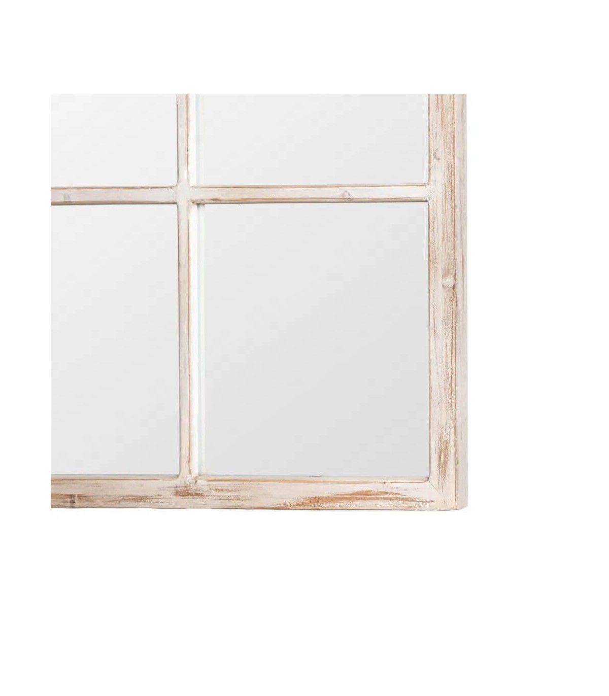 Espejo vestidor de gran formato con diseño efecto ventana y estética boho luminosa. La estructura de madera de abeto aporta ligereza visual y un aire natural muy decorativo. La división en cuarterones recuerda a antiguas carpinterías, aportando profundidad y carácter al espacio.