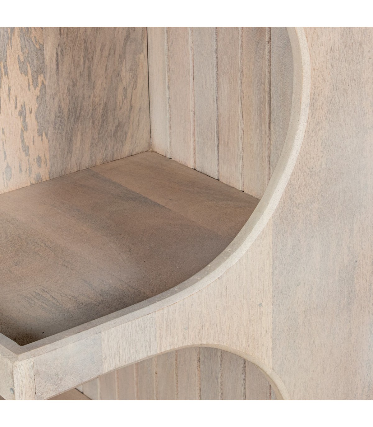 Inspirada en la limpieza visual de los interiores contemporáneos, esta estantería baja aporta orden y ligereza al espacio. La madera maciza de mango transmite una sensación cálida y natural que envuelve el conjunto. Sus huecos abiertos crean un ritmo equilibrado y decorativo que realza su presencia.