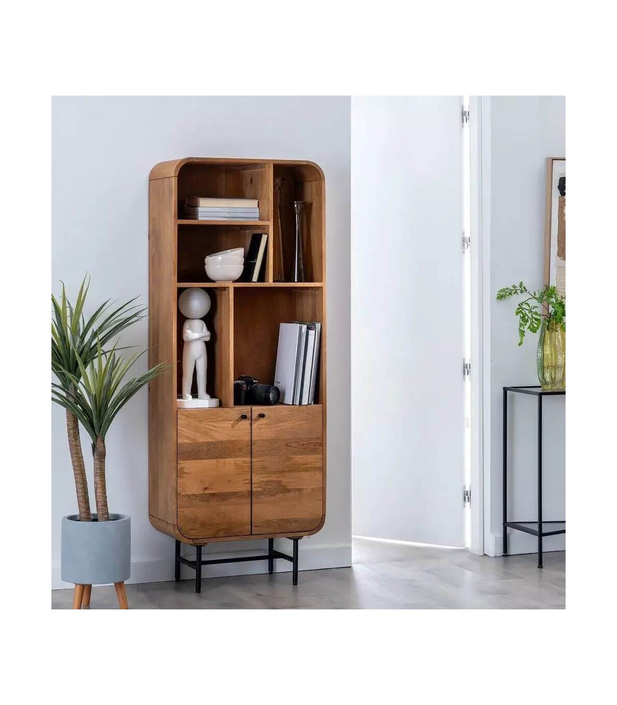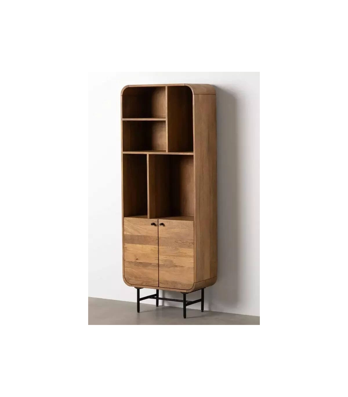 Librería estantería con 2 puertas realizada en madera maciza de mango con las esquinas redondeadas y metal negro. Forma parte de una colección de muebles pensada para tu salón con alguna pieza auxiliar para tu dormitorio, realizada en madera maciza de mango natural y metal negro con todas las esquinas redondeadas de estilo colonial con un punto industrial.