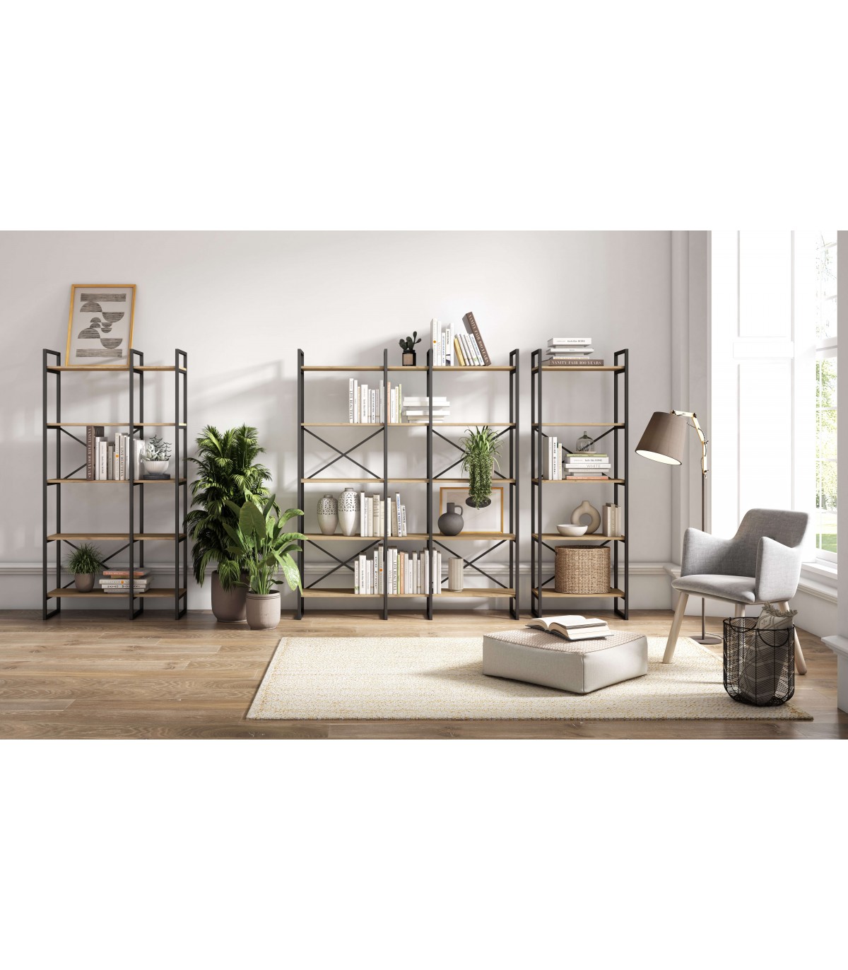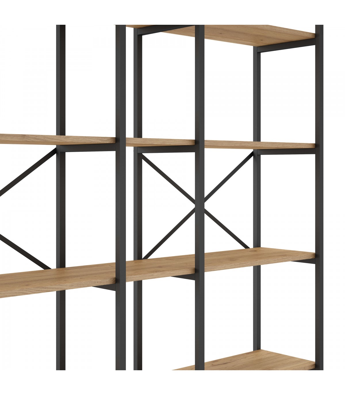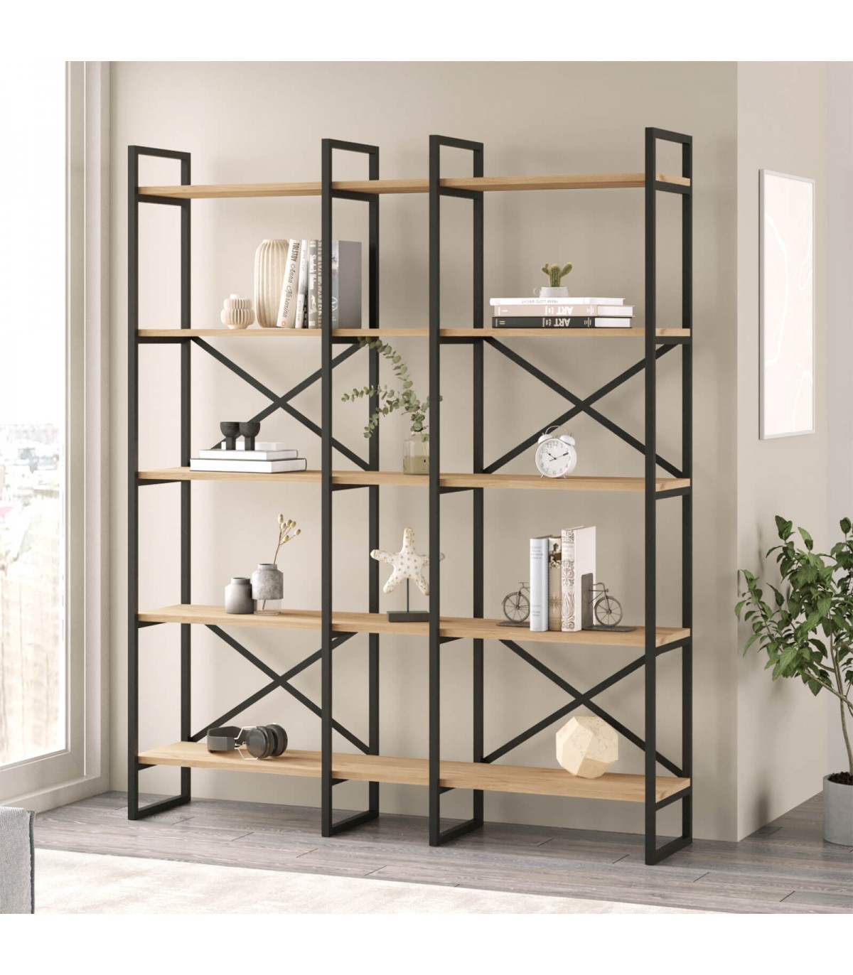 Librería estantería estable y robusta, realizada en madera mdf imitación roble natural, metal negro, ideal para una habitación, salón o despacho.