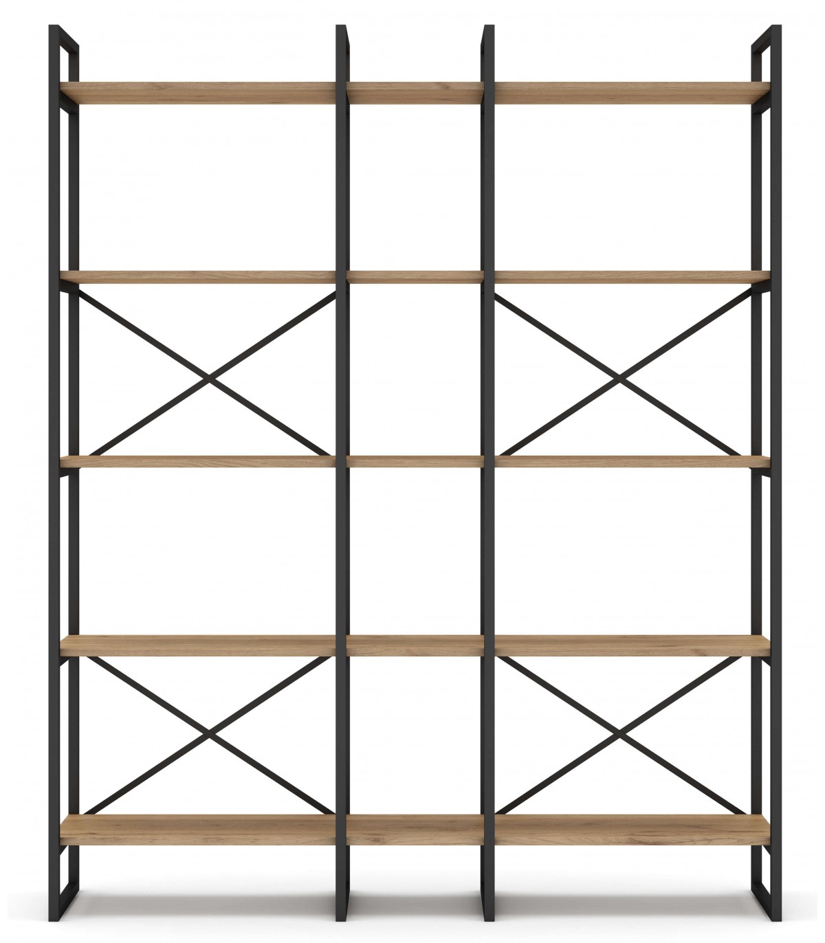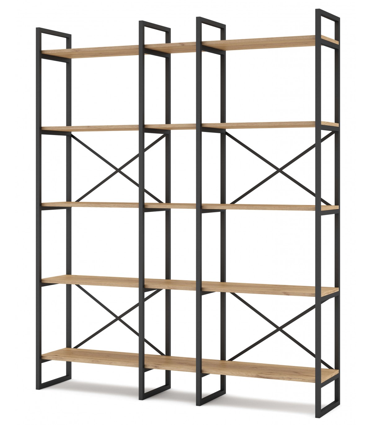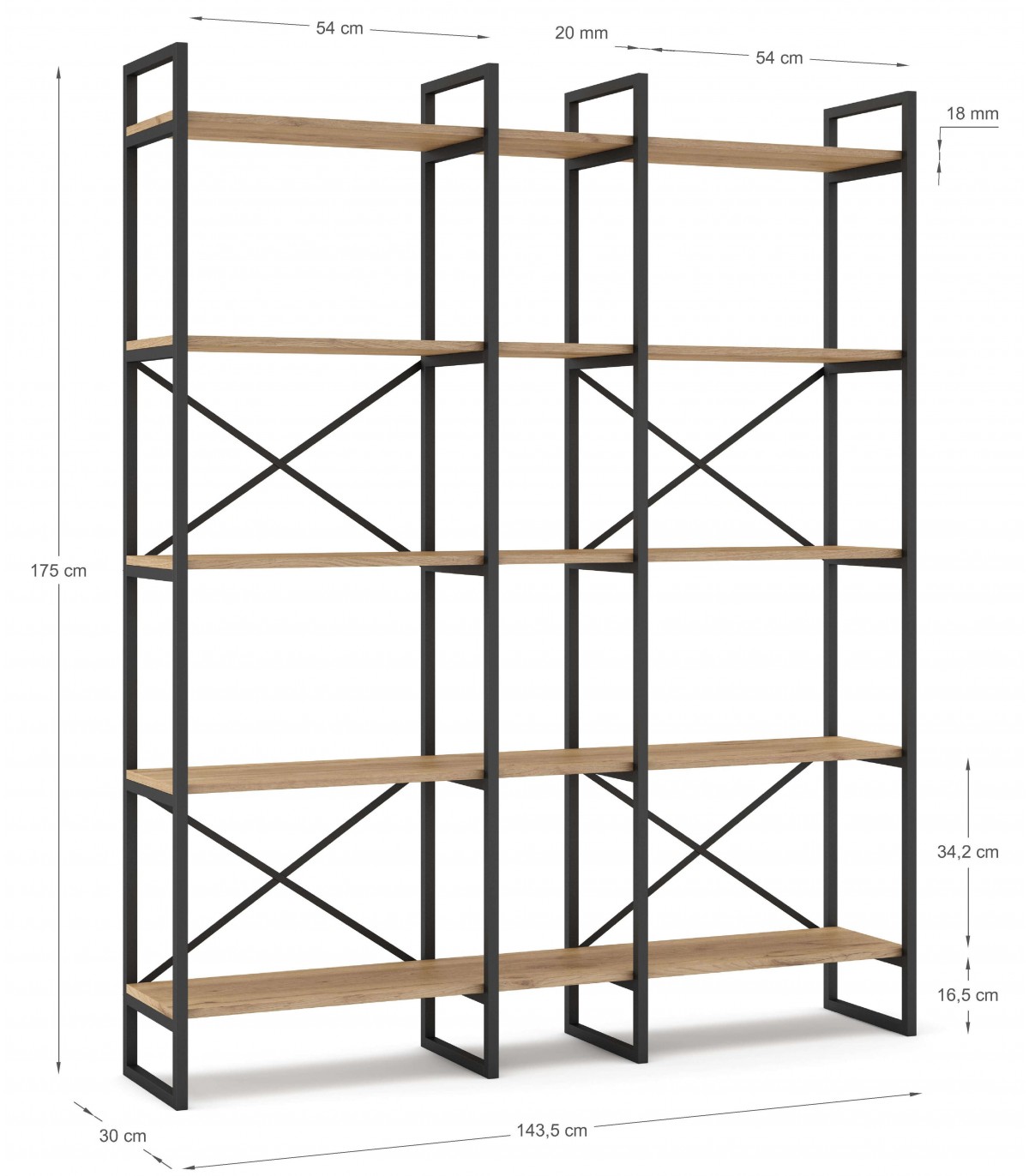 Librería estantería estable y robusta, realizada en madera mdf imitación roble natural, metal negro, ideal para una habitación, salón o despacho.