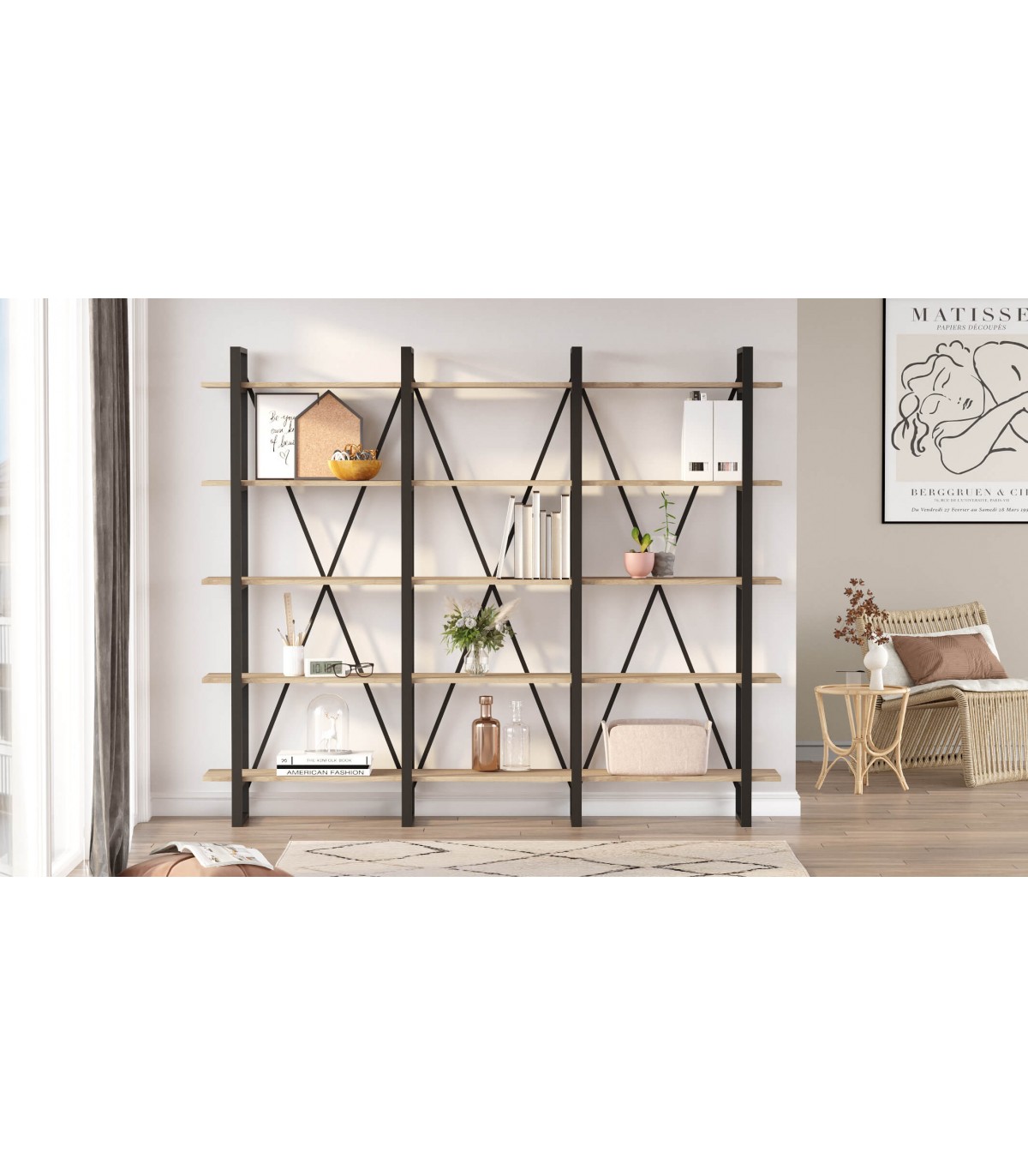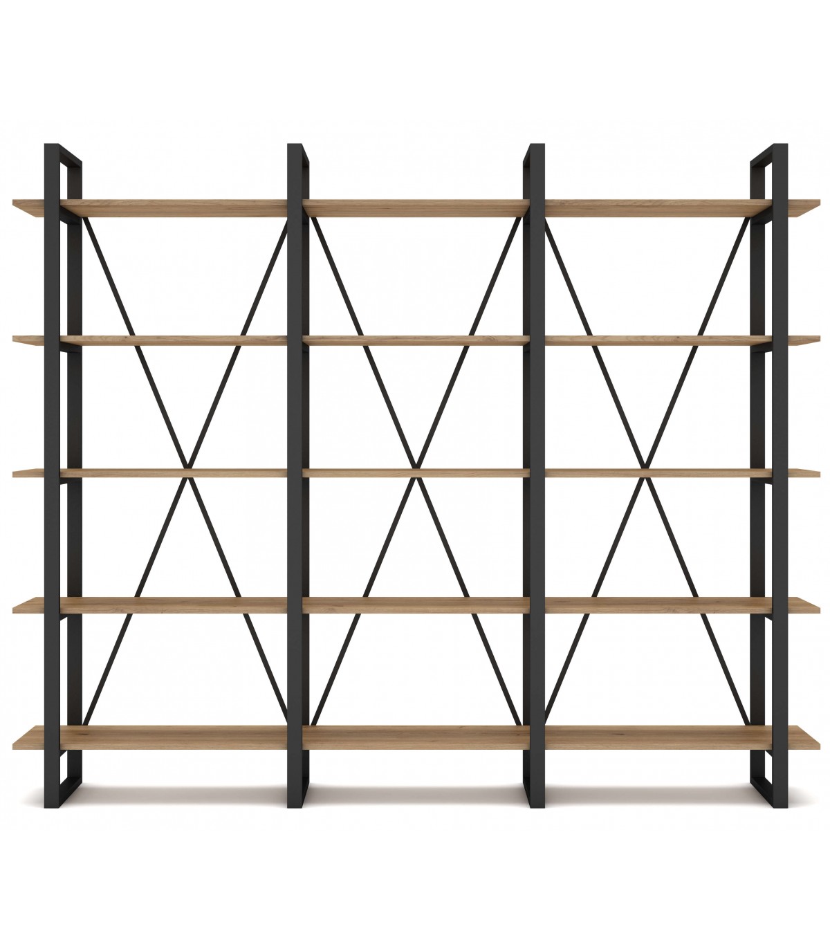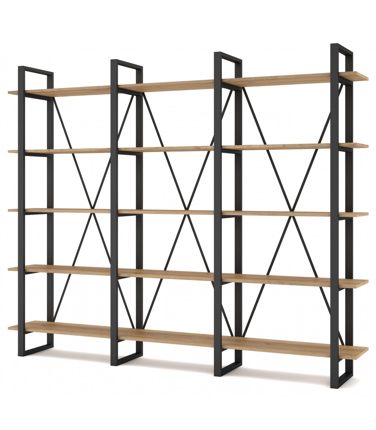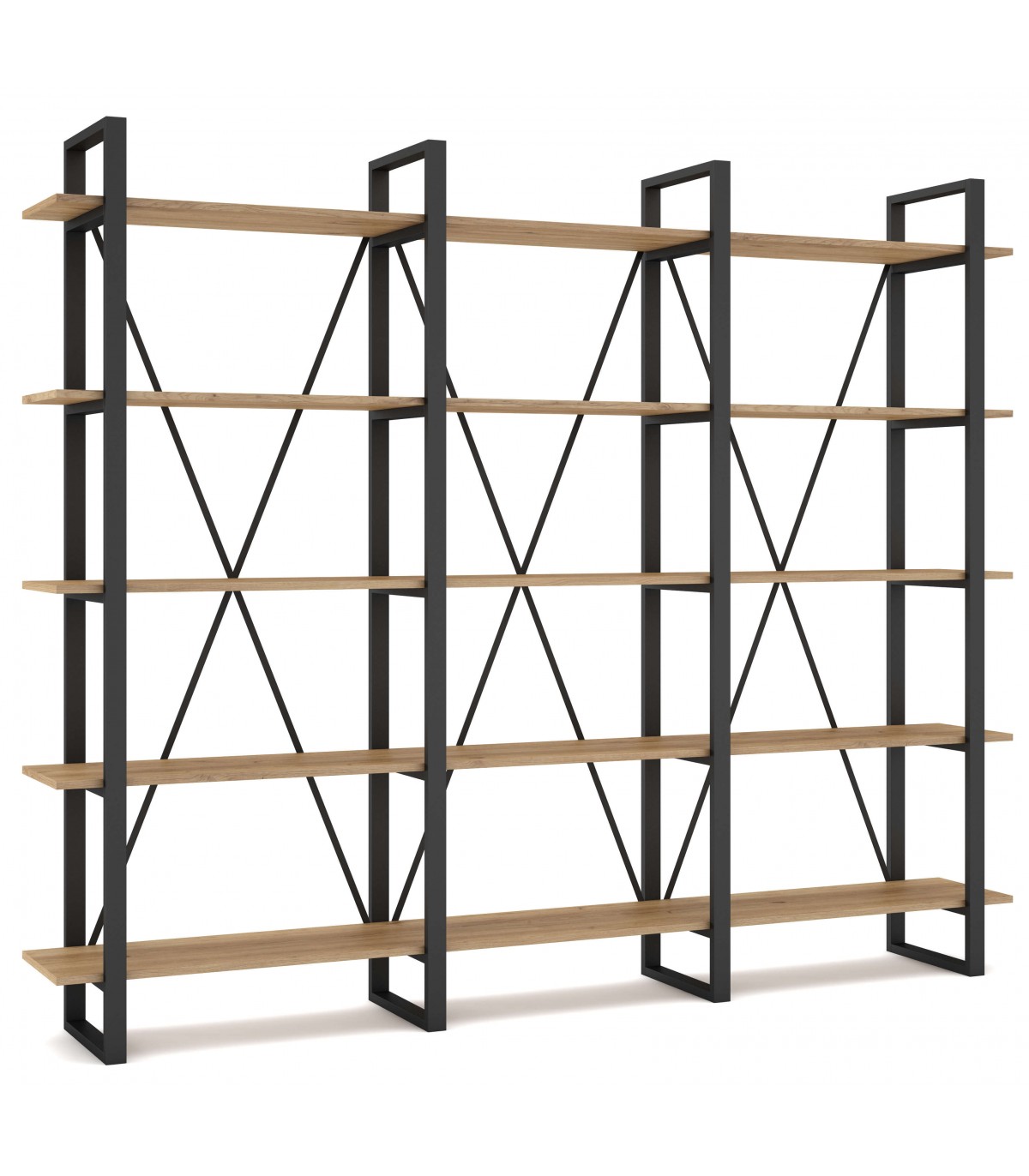 Librería estantería grande estable y robusta, realizada en madera mdf imitación roble natural y metal negro, ideal para una habitación, salón o despacho.