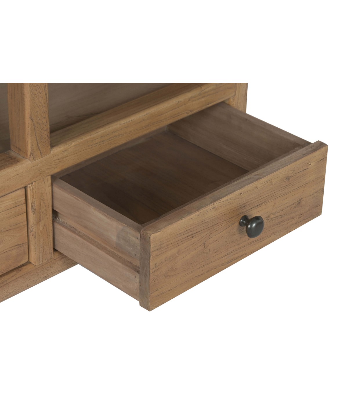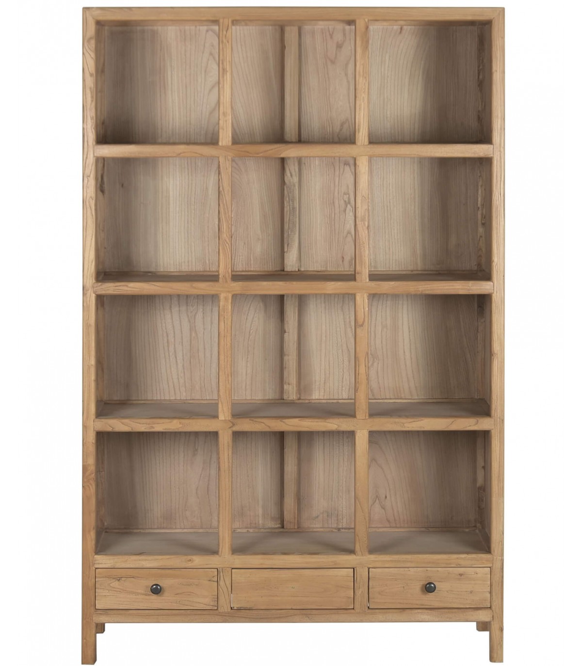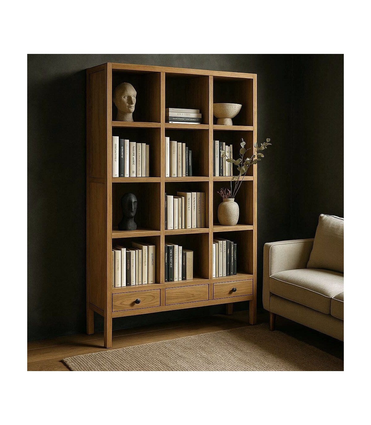 Sus doce huecos abiertos permiten jugar con el orden y el vacío, mientras que los tres cajones inferiores aportan funcionalidad con discreción. Ideal para salones amplios, comedores o despachos con alma creativa. El acabado natural aporta calidez orgánica a cualquier espacio con esencia boho.