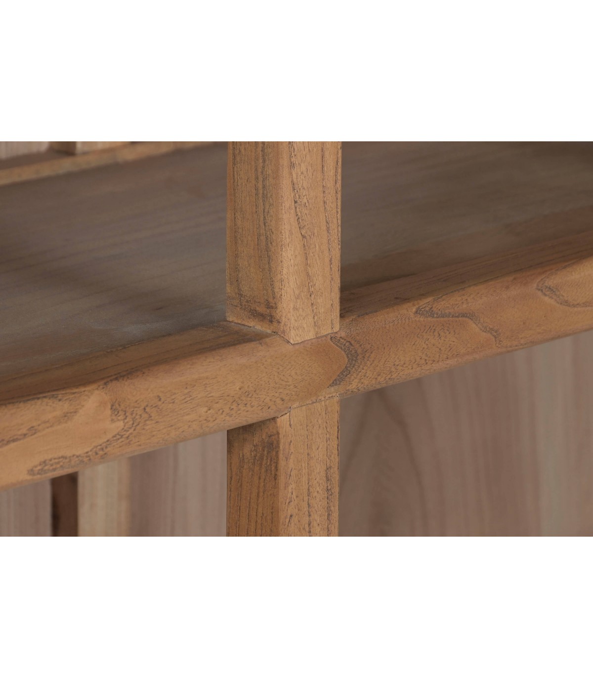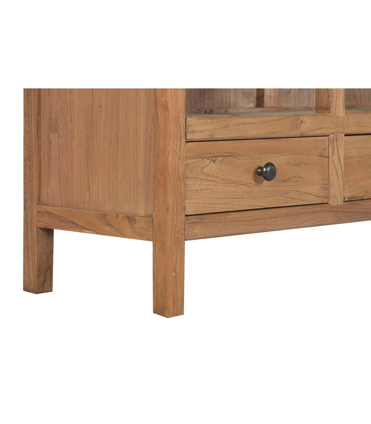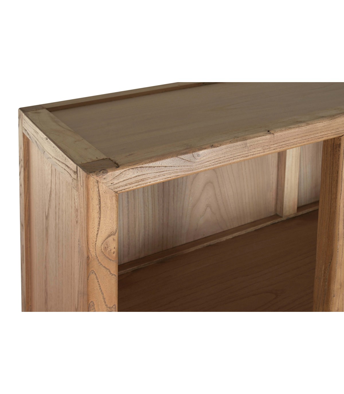 Esta estantería alta de aire artesanal combina estructura robusta y ligereza visual en un diseño simétrico perfecto para destacar objetos decorativos, libros o vajilla especial. Fabricada en madera maciza de olmo reciclado, cada pieza conserva vetas y nudos originales que refuerzan su carácter único y sostenible.
